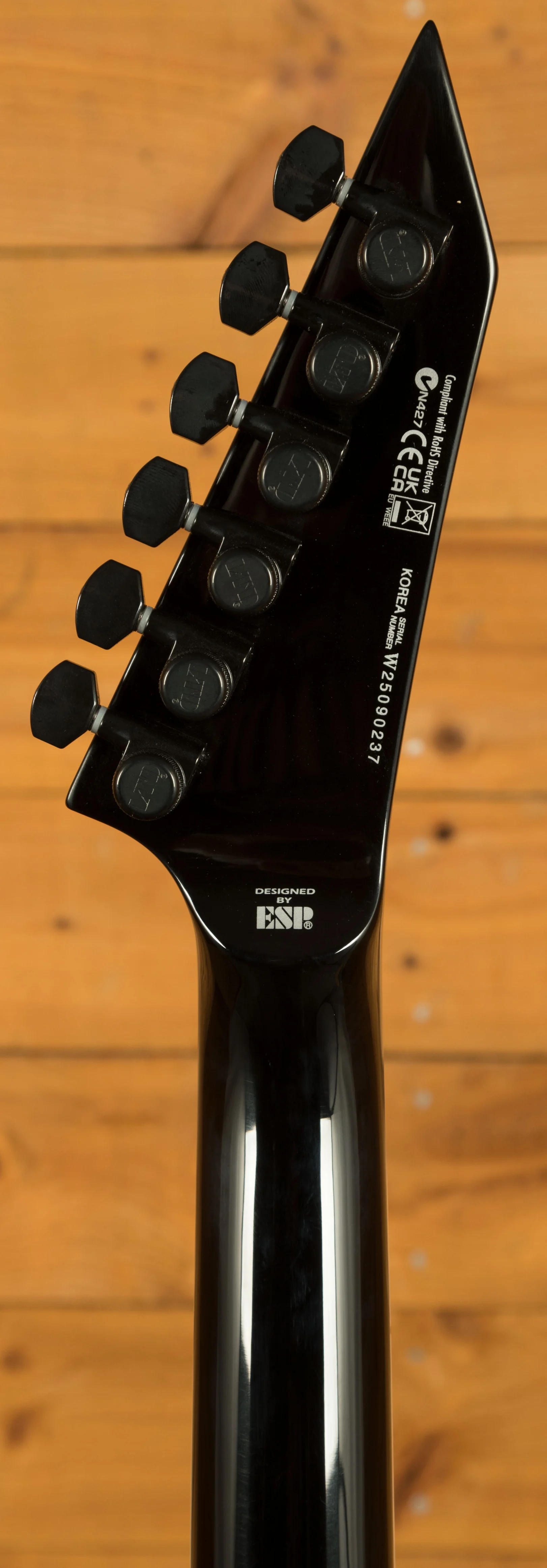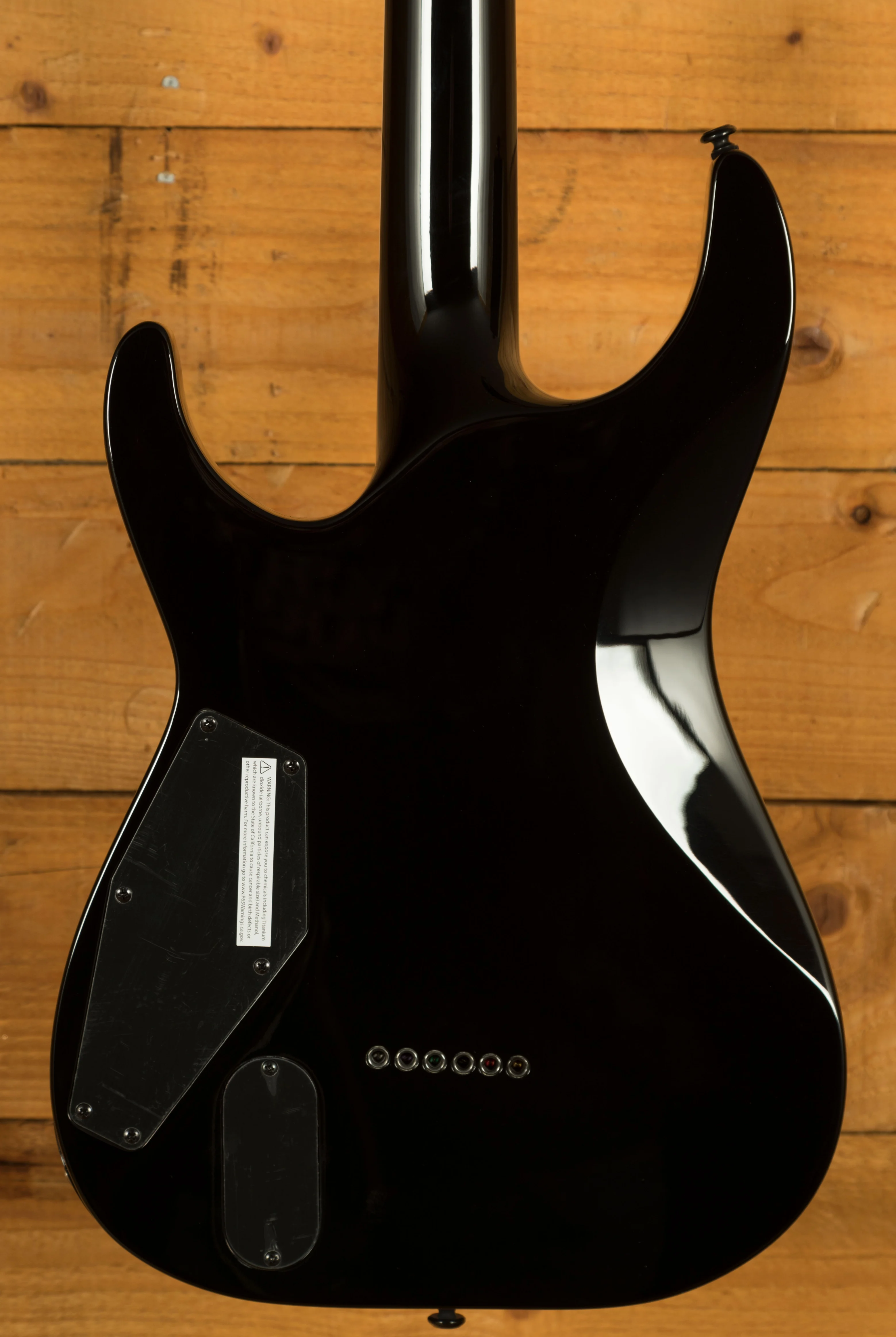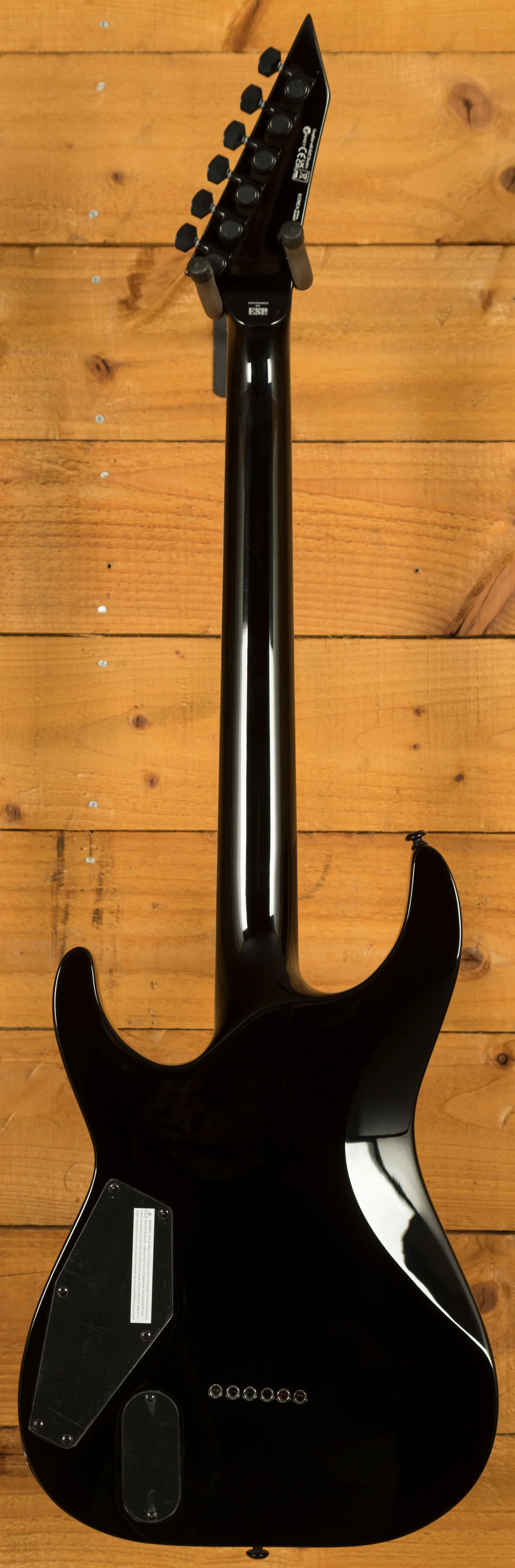 Hardware includes a TonePros locking TOM bridge with string-thru body, LTD locking tuners, and black nickel pickup covers to match the guitar's aggressive aesthetic. Finished with D'Addario XL110 strings and a molded nut.
