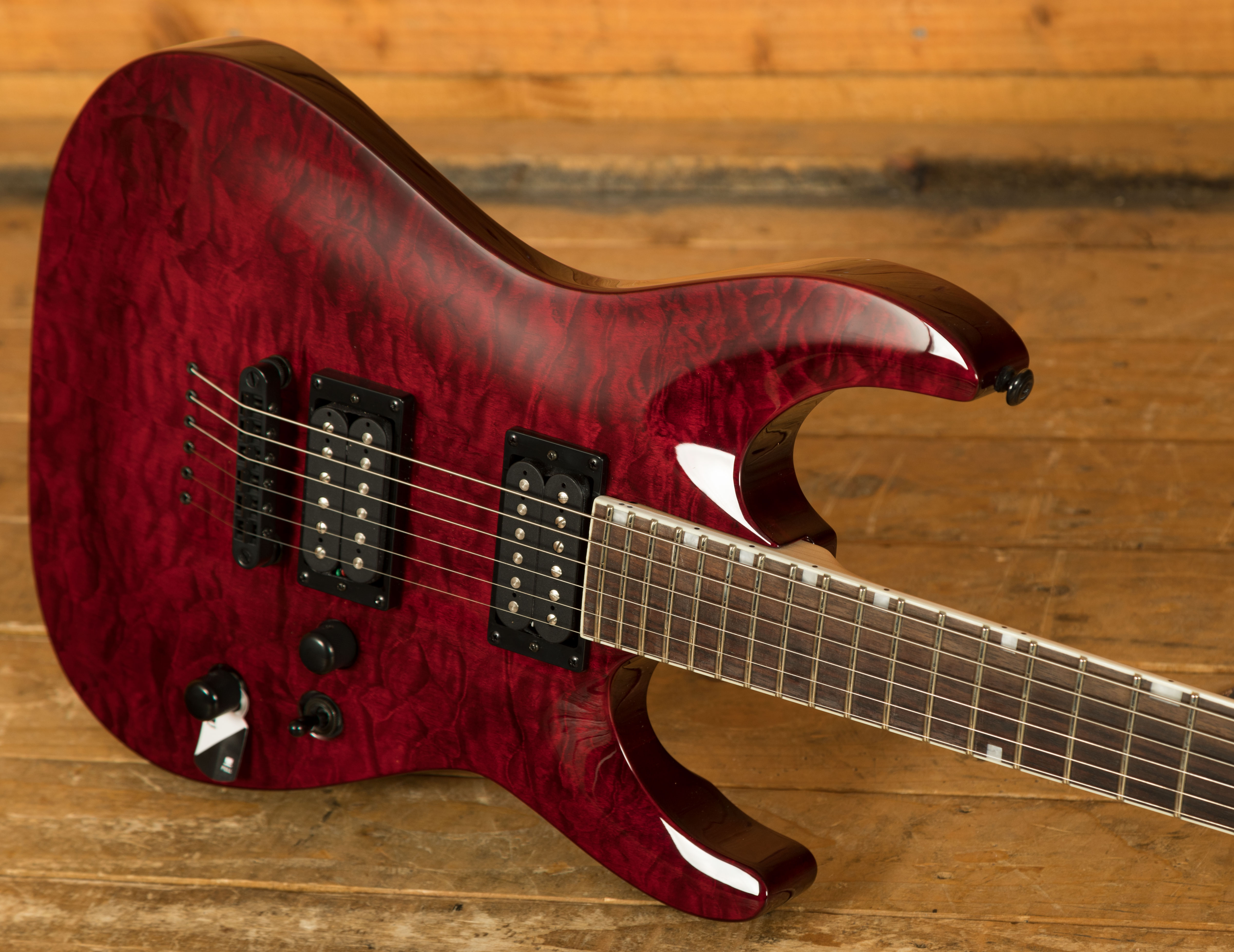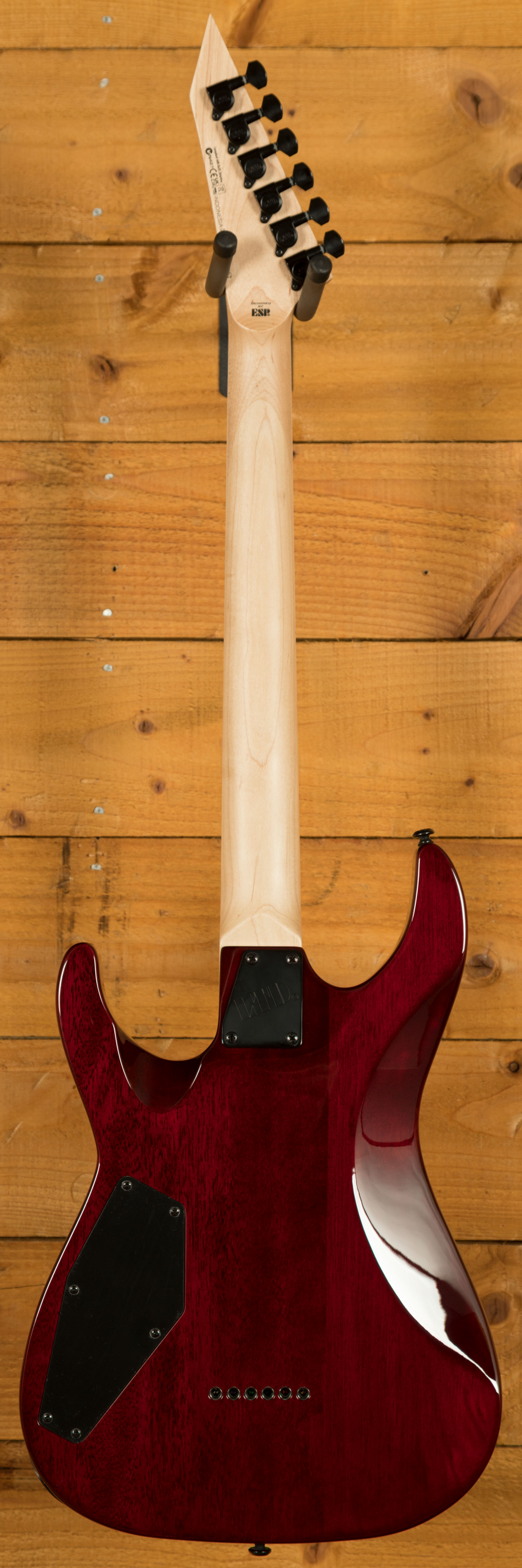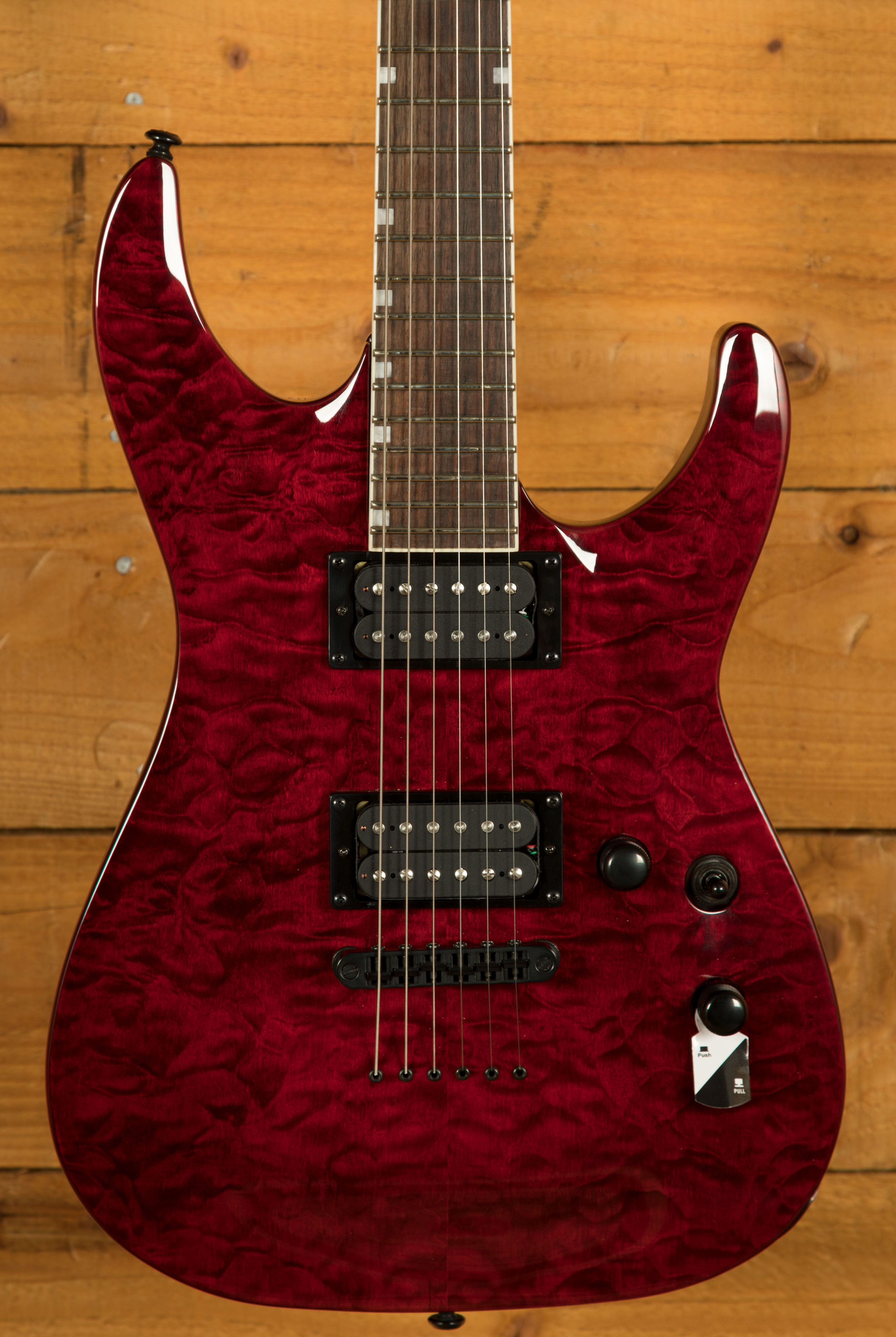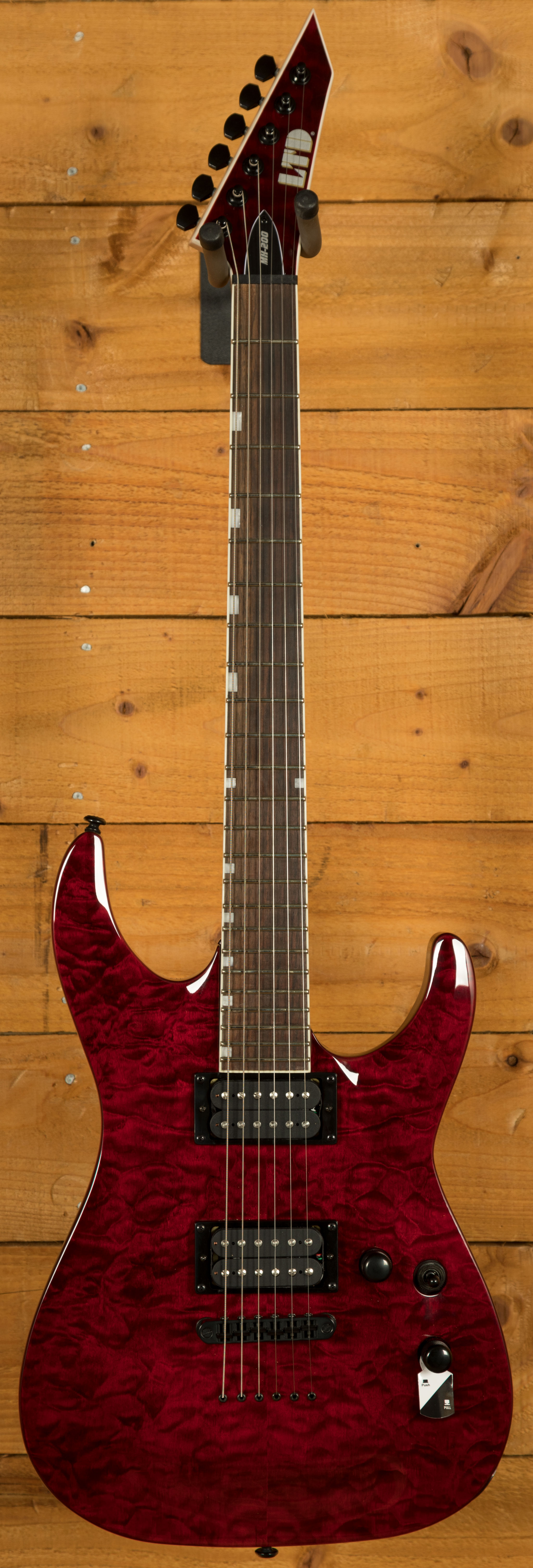 The ESP LTD MH-200QMNT is a high-quality, affordable electric guitar designed for players who value performance, versatility, and build precision. Combining design elements from the ESP Horizon and M Series, it features a contoured quilted maple top on a mahogany body, providing both visual appeal and tonal richness. Its bolt-on maple neck with a rosewood fingerboard and 24 extra-jumbo frets offers smooth playability and long-lasting comfort, making it suitable for both rhythm and lead guitarists. The 25.5" scale length, Thin U neck contour, 350mm fingerboard radius, and 42mm nut width are designed to enhance speed, accuracy, and control across the entire fretboard.