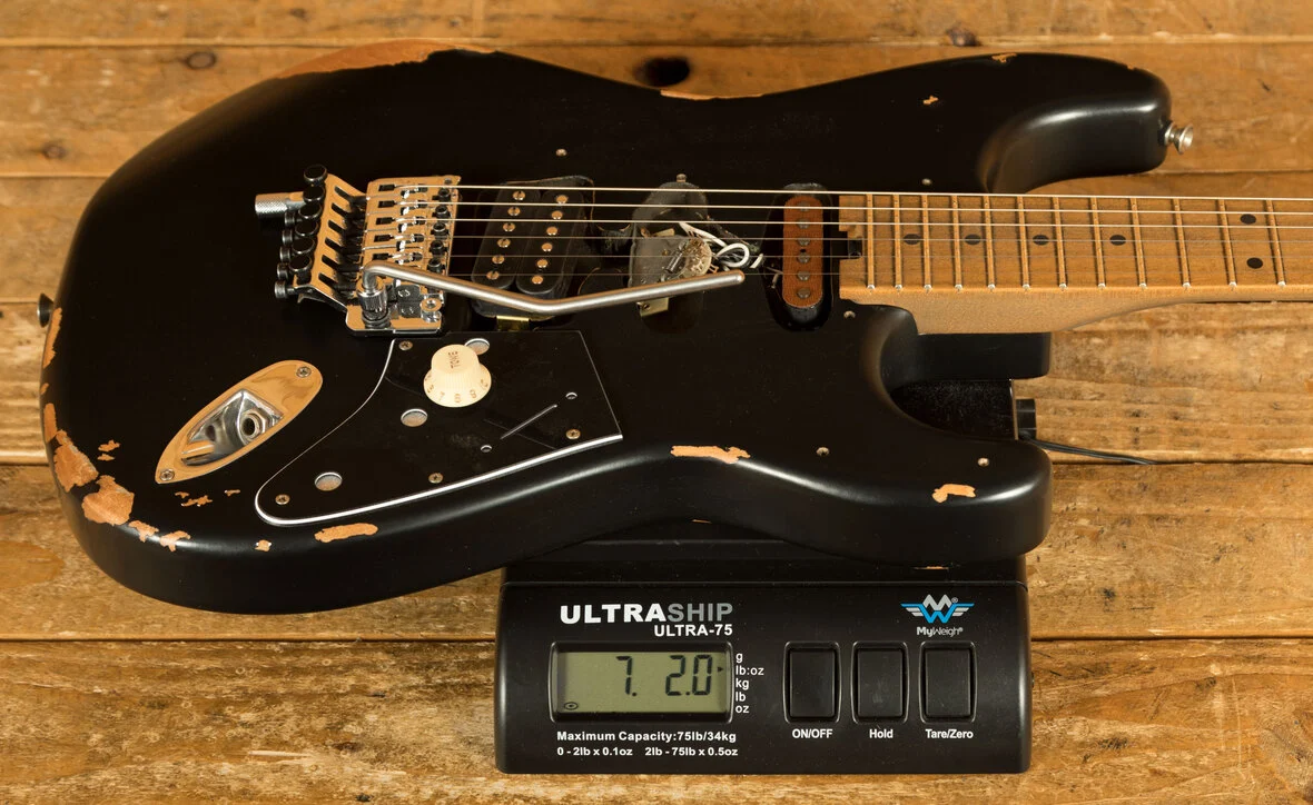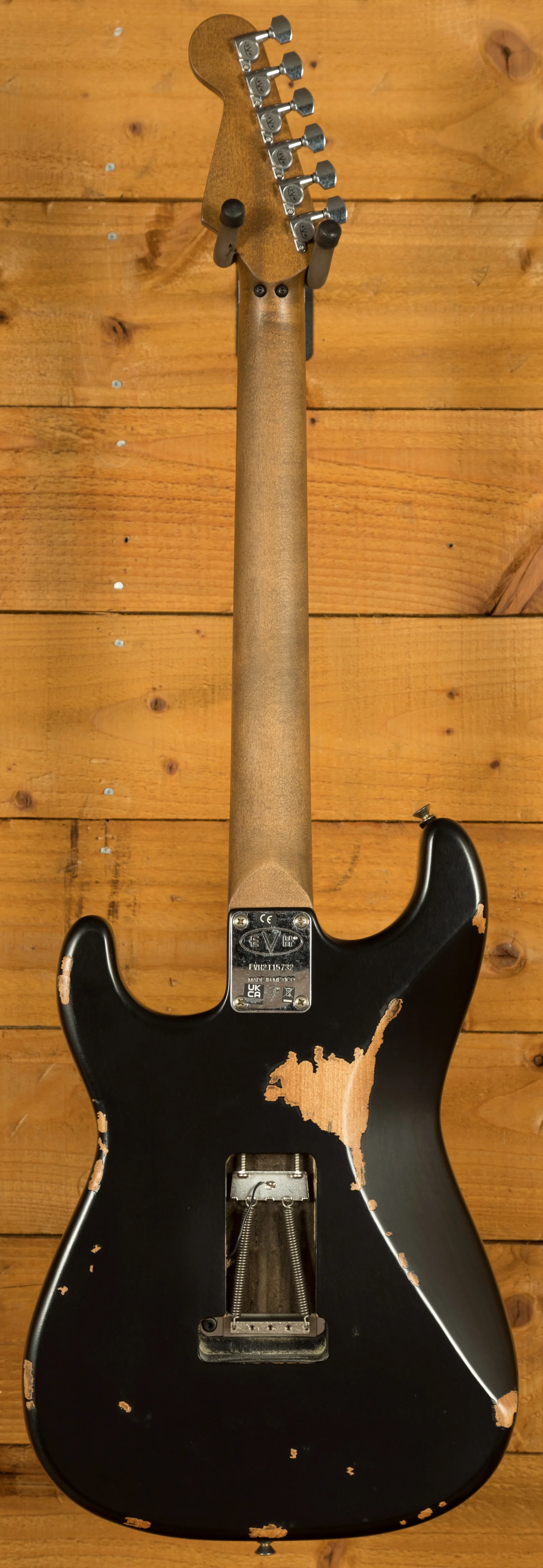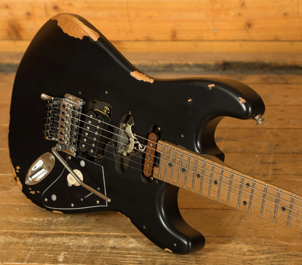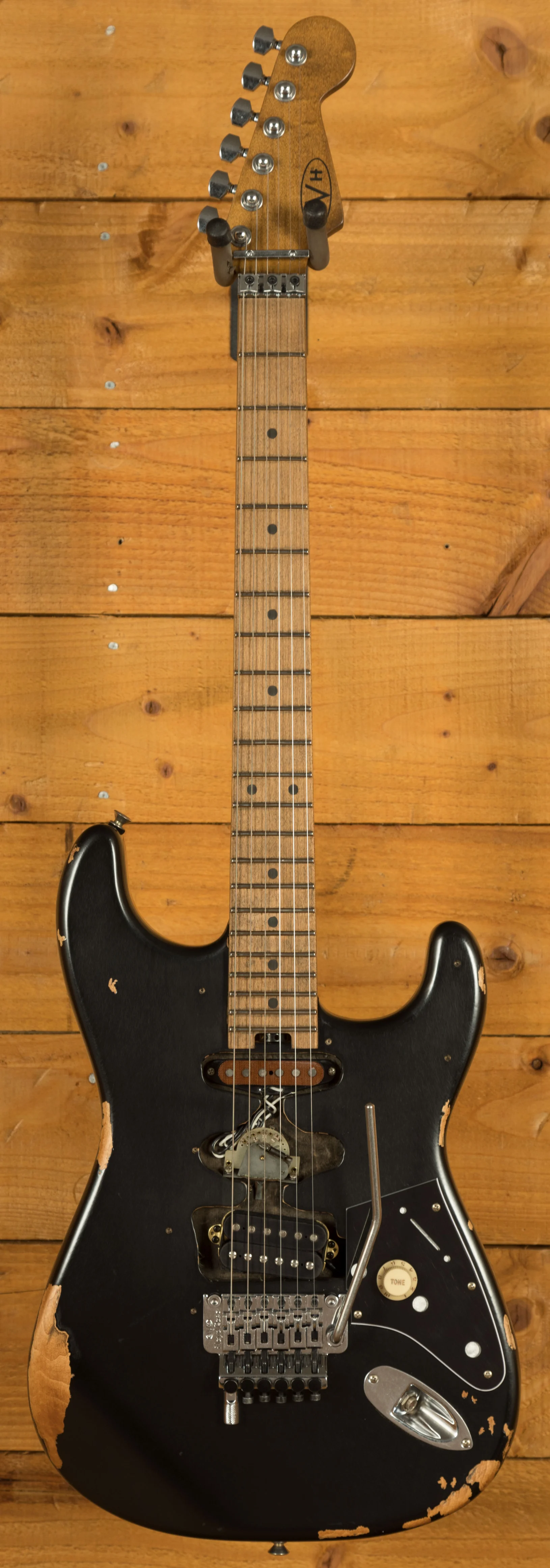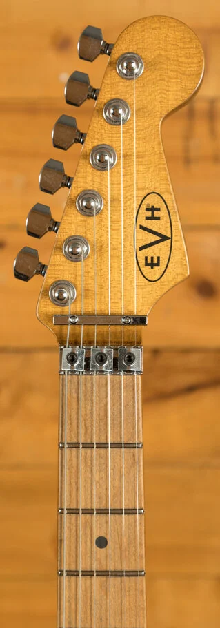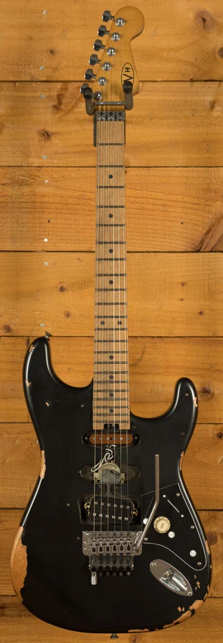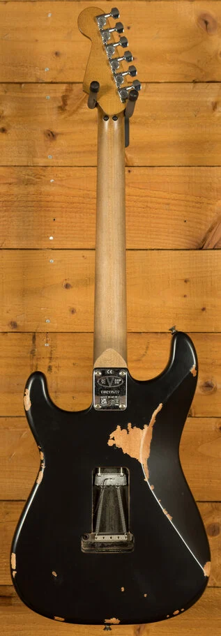 Equipped with a svelte quartersawn maple neck and fast-playing compound-radius relicd maple fingerboard, this guitar is born to shred.Intentionally positioned against the body, the dive-bomb-only D-Tuna-equipped Floyd Rose lets you mimic Eddies signature trem work with ease, along with giving you instant access to Drop D tuning. The EVH Frankenstein Series models are teeming with classic Van Halen vibe, but most importantly, it provides killer tone and lightning-fast playability.