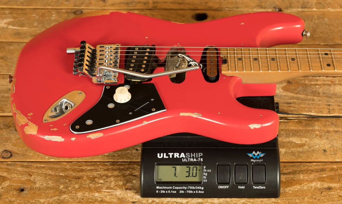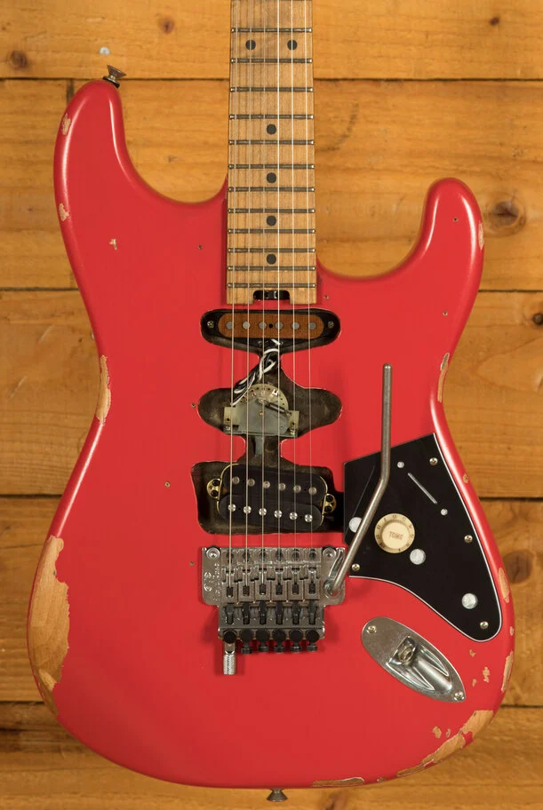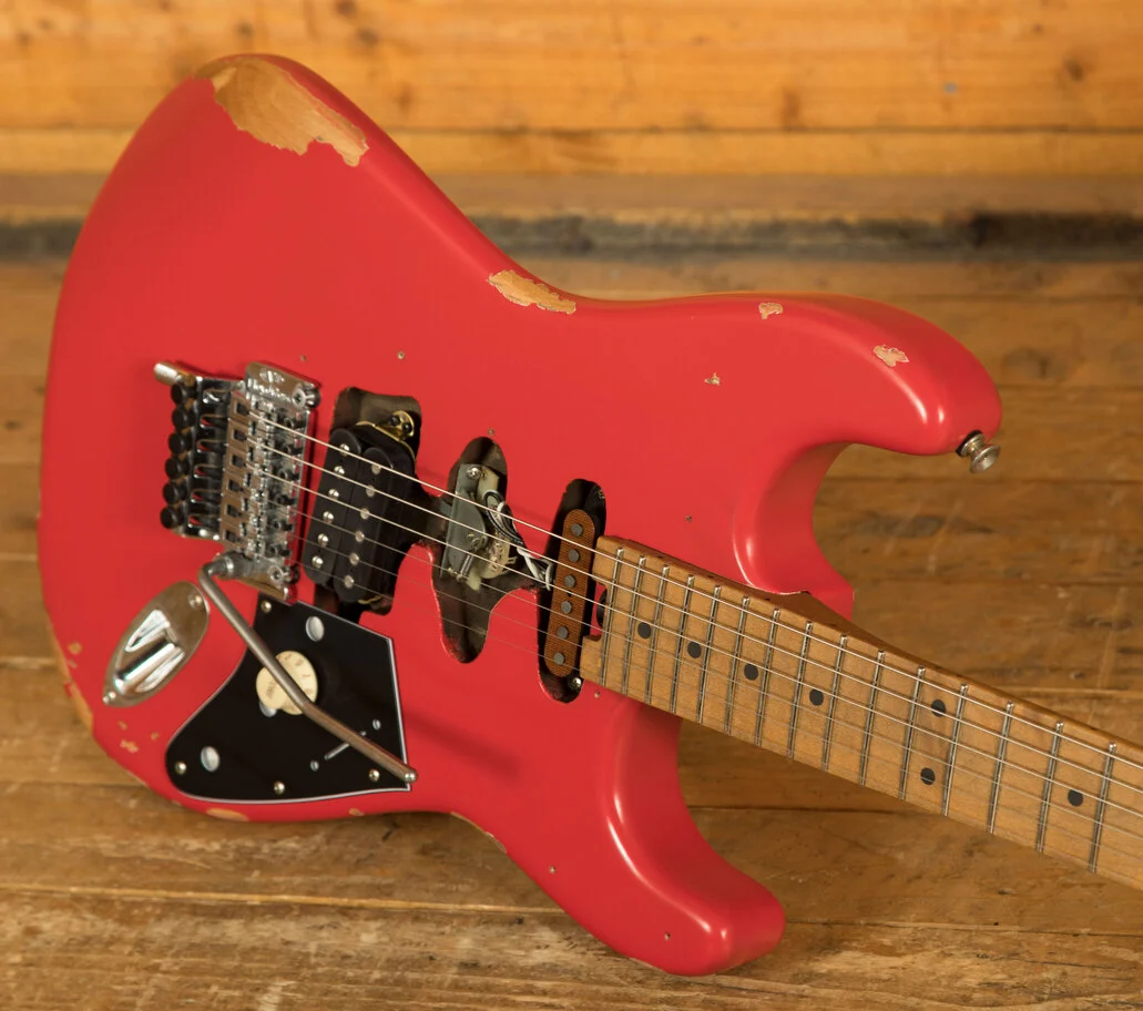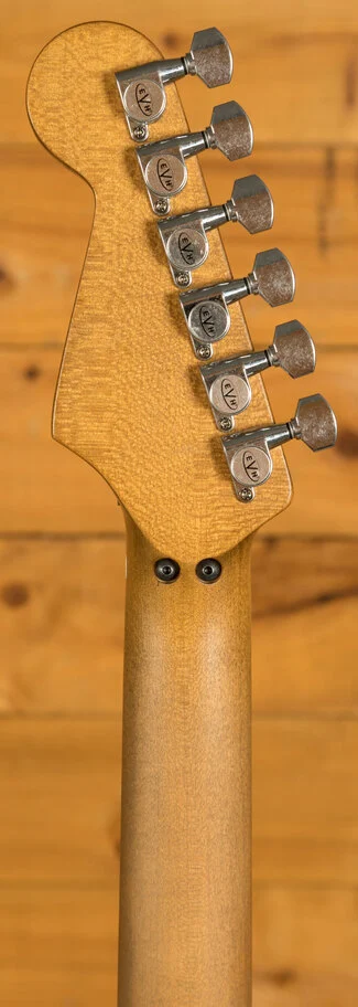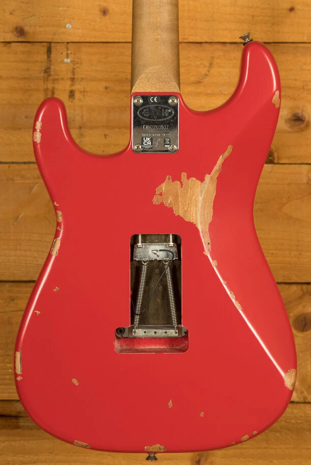 Equipped with a svelte quartersawn maple neck and fast-playing compound-radius relicd maple fingerboard, this guitar is born to shred.Intentionally positioned against the body, the dive-bomb-only D-Tuna-equipped Floyd Rose lets you mimic Eddies signature trem work with ease, along with giving you instant access to Drop D tuning. The EVH Frankenstein Series models are teeming with classic Van Halen vibe, but most importantly, it provides killer tone and lightning-fast playability.