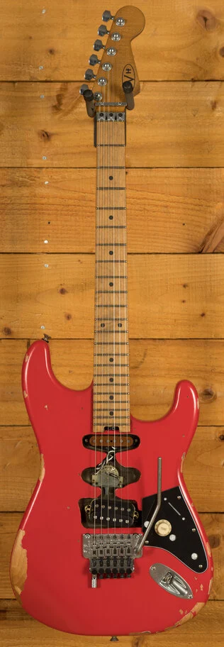 There are very few guitars out there that are as famous as Eddie Van Halens favorite 6-string sidekick, lovingly known as Frankenstein. This guitar was Eddies attempt to combine the sound of a classic single-cut solid body guitar with the physical attributes and tremolo bar functionality of a Fender Stratocaster. The EVH Frankenstein Frankie Series is a civilian variant of Eddie Van Halens iconic red, black, and white Frankenstrat guitarcomplete with a worn-in relicd finish.
