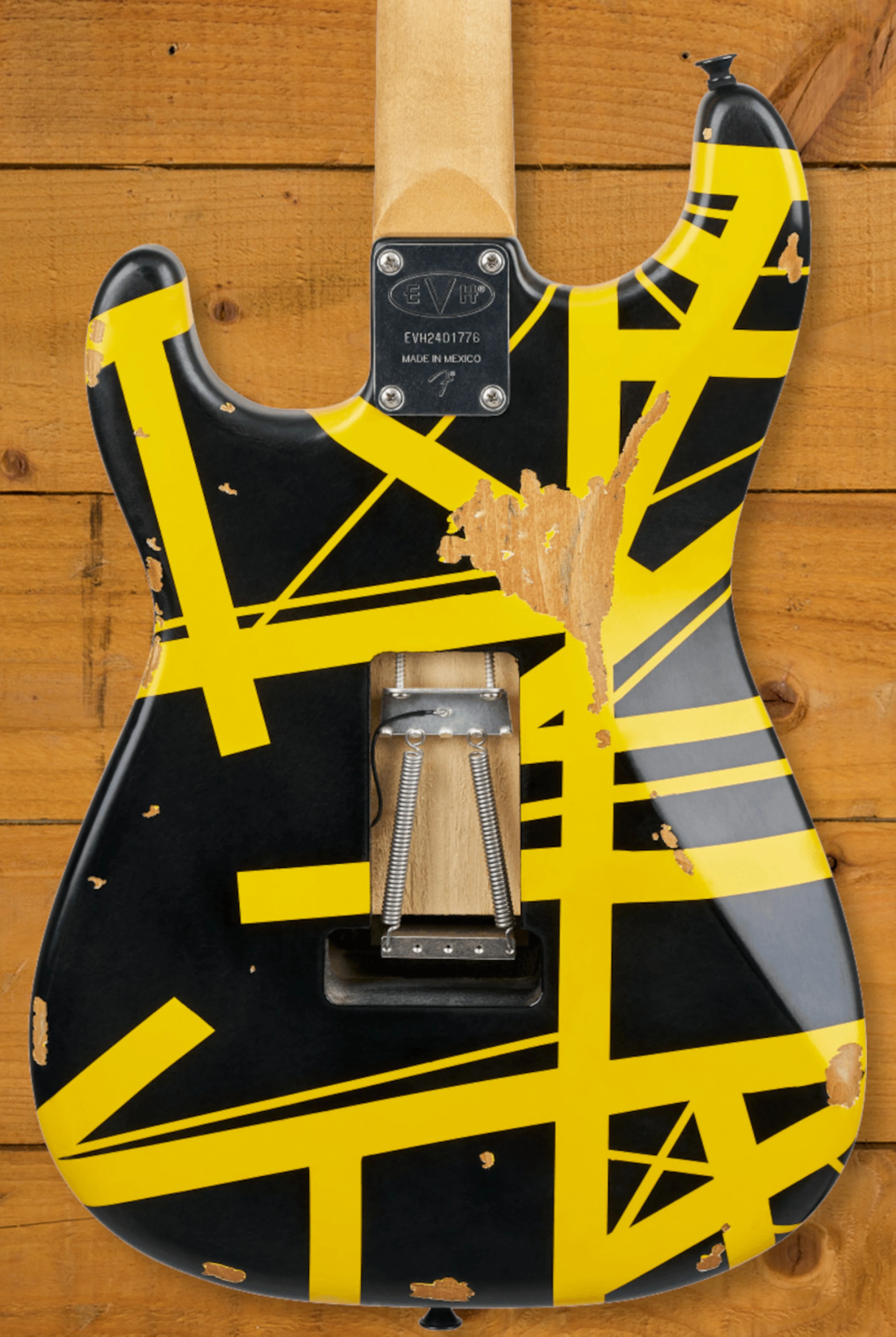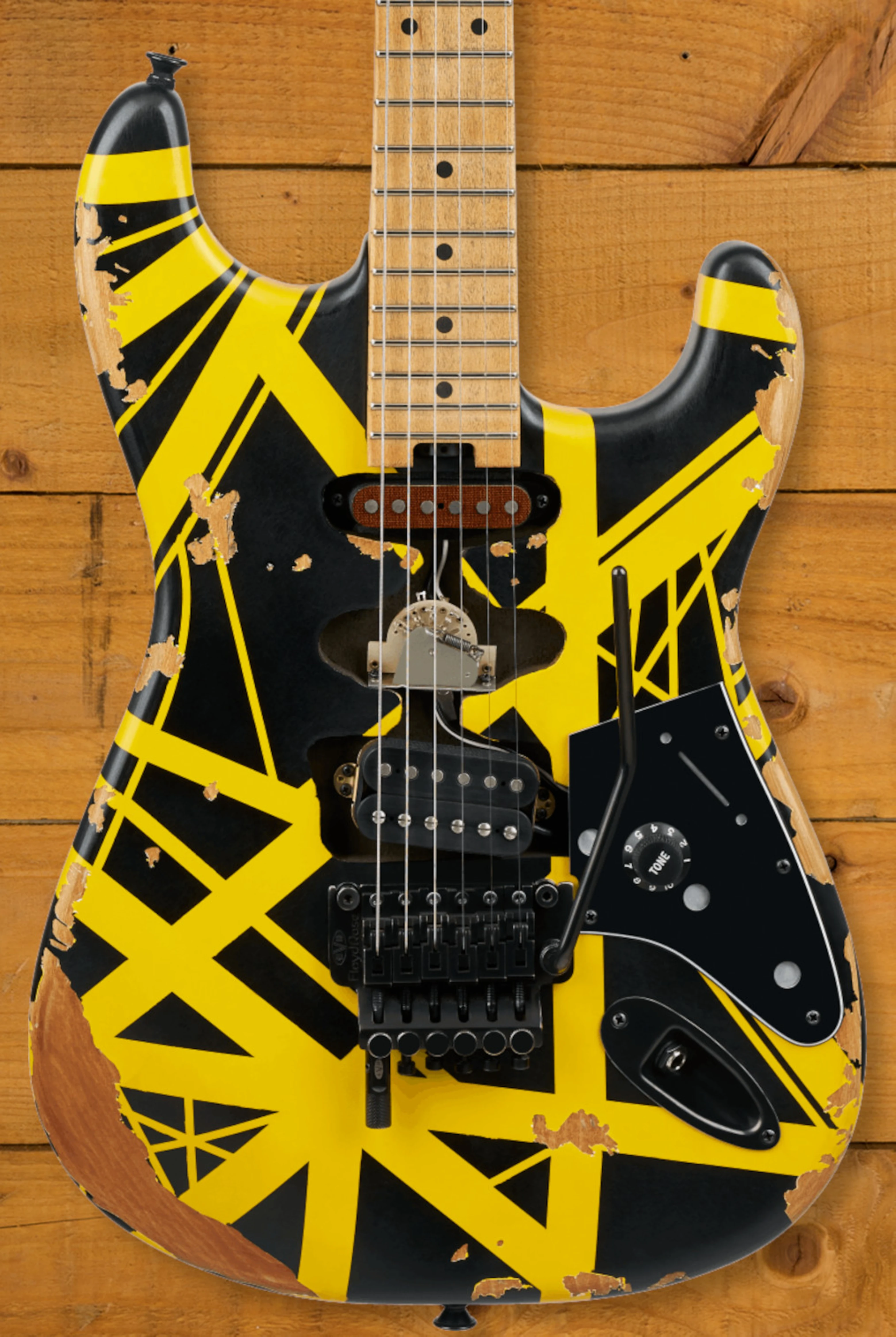 The Frankie features a Basswood body with Eddies classic black with yellow stripes paint job with a worn in relic look. It's really resonant and perfectly balanced, great for ripping up and down the board.