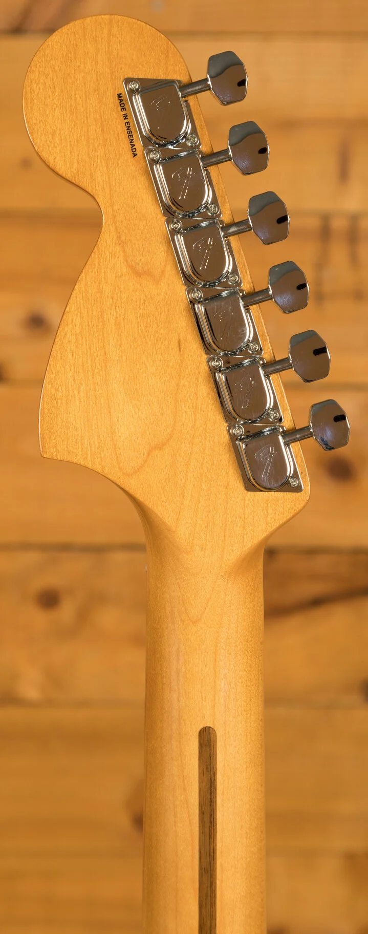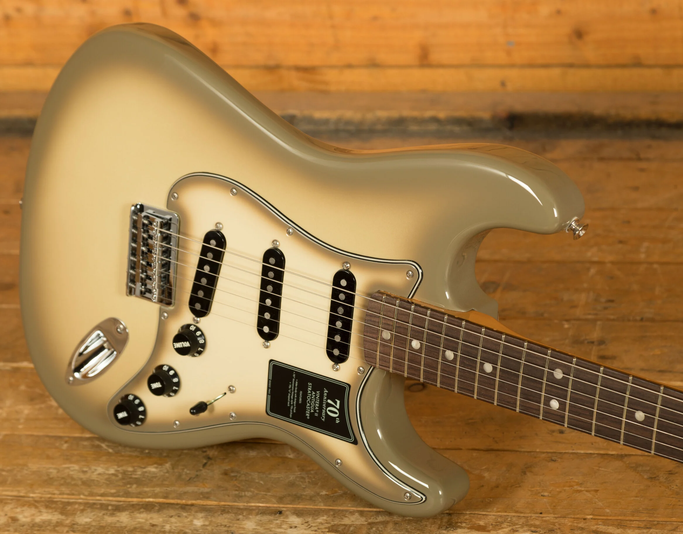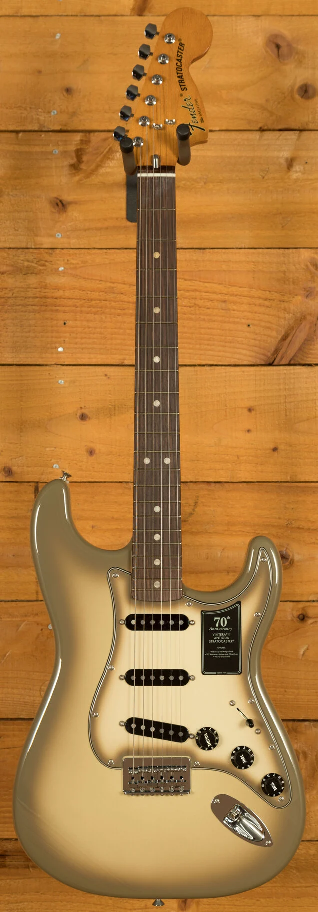Under the hood, the 70th Anniversary Vintera II Antigua Stratocaster is equipped with a trio of 70th Anniversary Vintage-Style '70s Single-Coil Strat pickups, delivering a blend of warmth and bite that captures the essence of classic Stratocaster sound. The vintage-style "F" stamped tuning machines and the vintage-style hardtail bridge with block saddles ensure rock-solid tuning stability, allowing you to focus on your music without worrying about intonation issues.