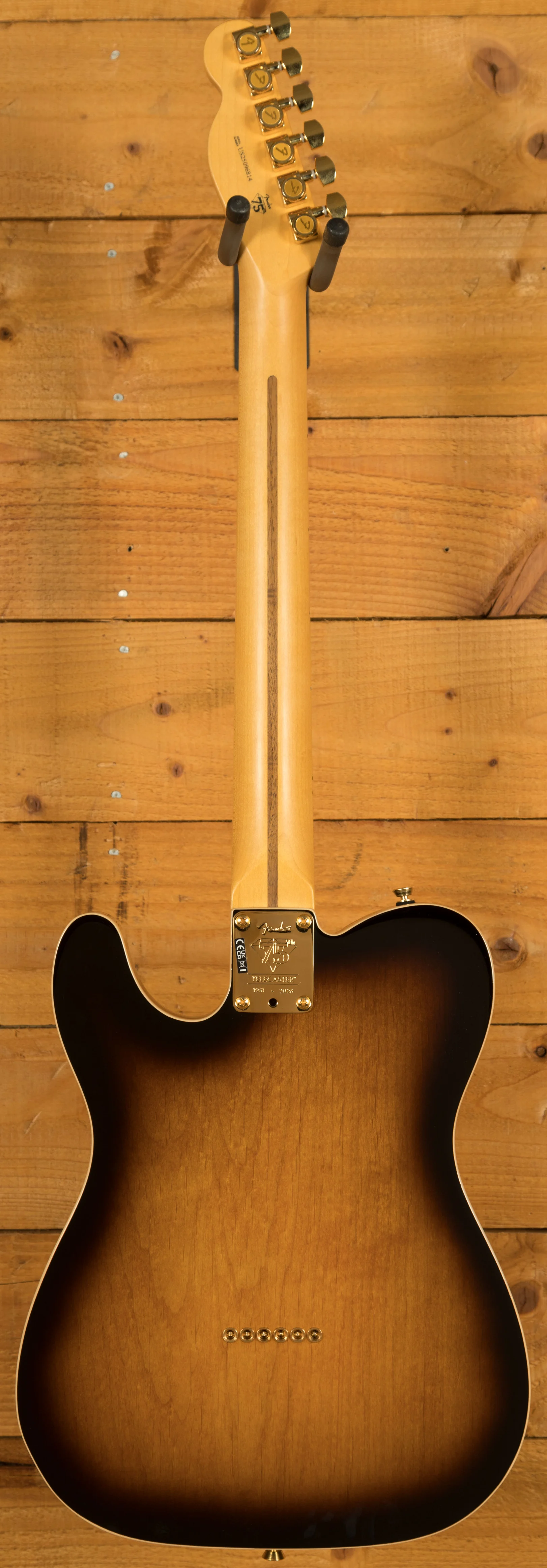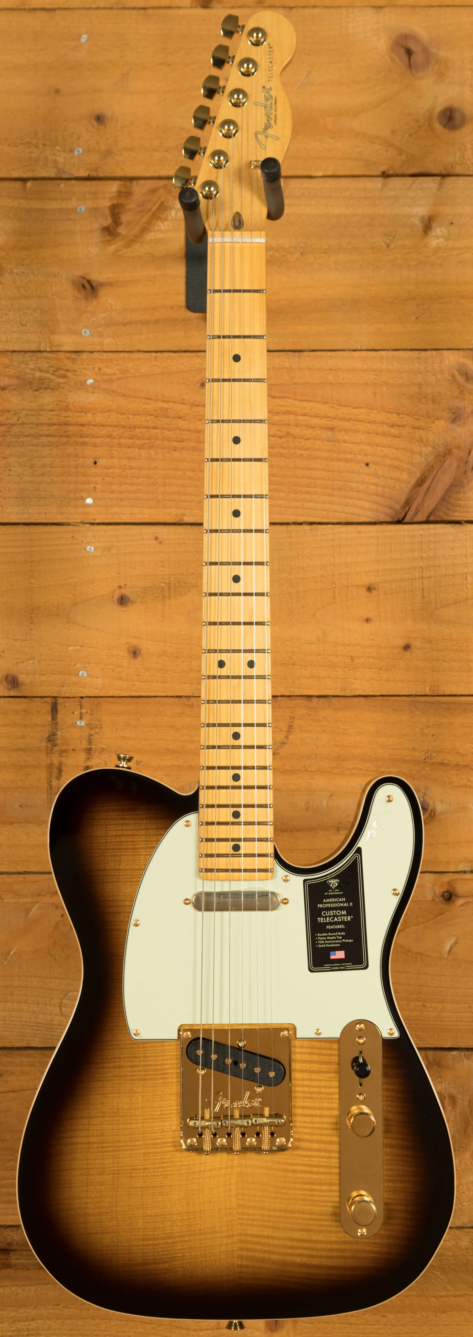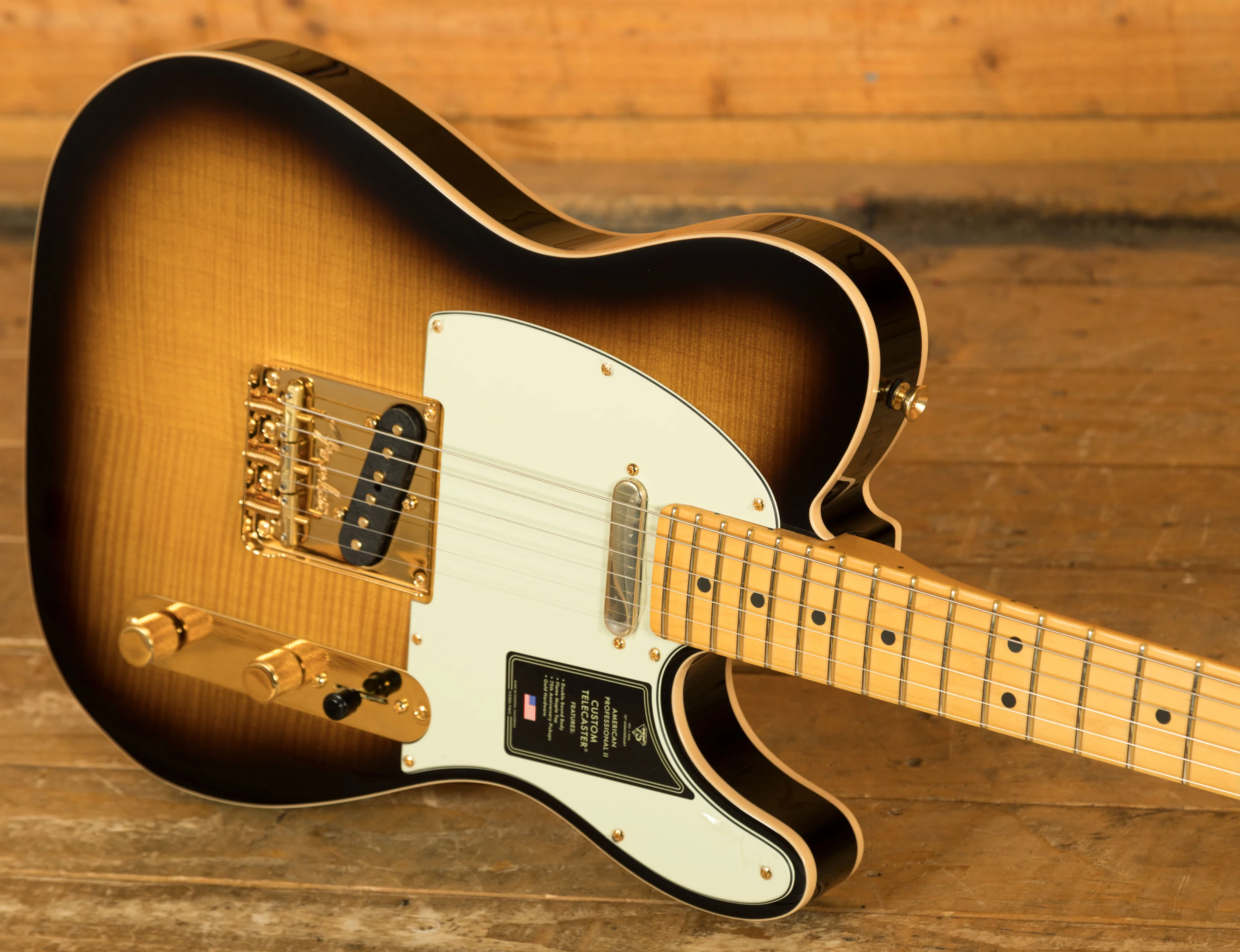 One of the standout variations on the Tele is the American Professional II Telecaster Custom - adorned with front and back binding, it just oozes elegance. This rendition features a vibrant Flame Maple top that peaks through the 2-Colour Sunburst and with the pairing of gold hardware, it looks super classy.