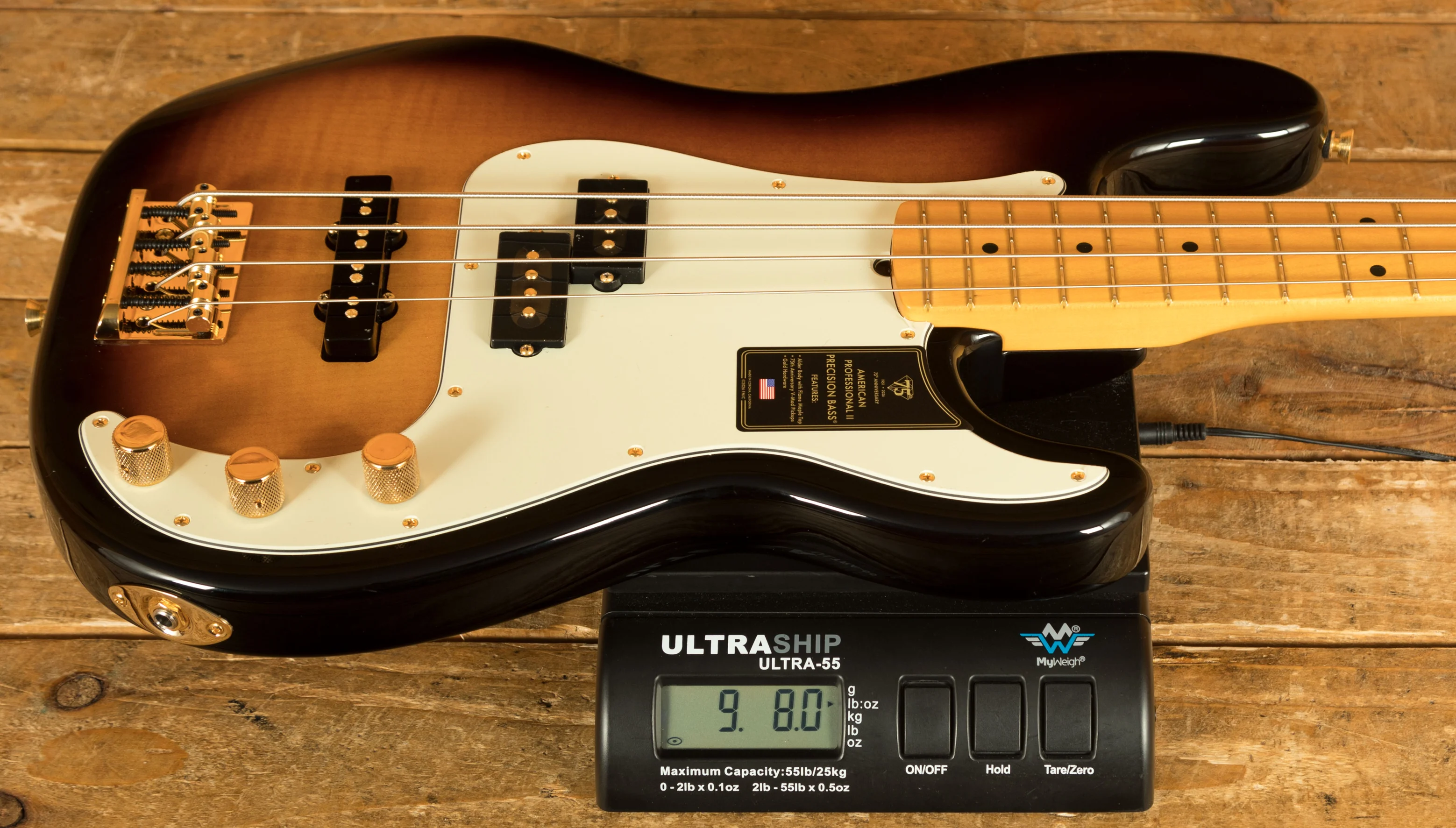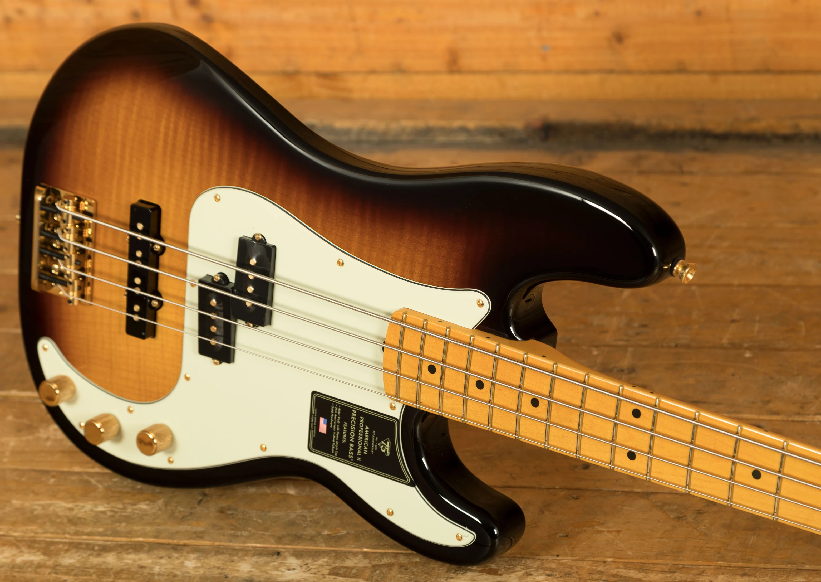 The PJ-Bass was later developed as a combination of the Precision and Jazz bass for the ultimate versatility. This American Professional PJ features a gorgeous flame maple top under a 2-colour sunburst. Paired with a white pickguard and gold hardware, it's a stand-out instrument for sure!
