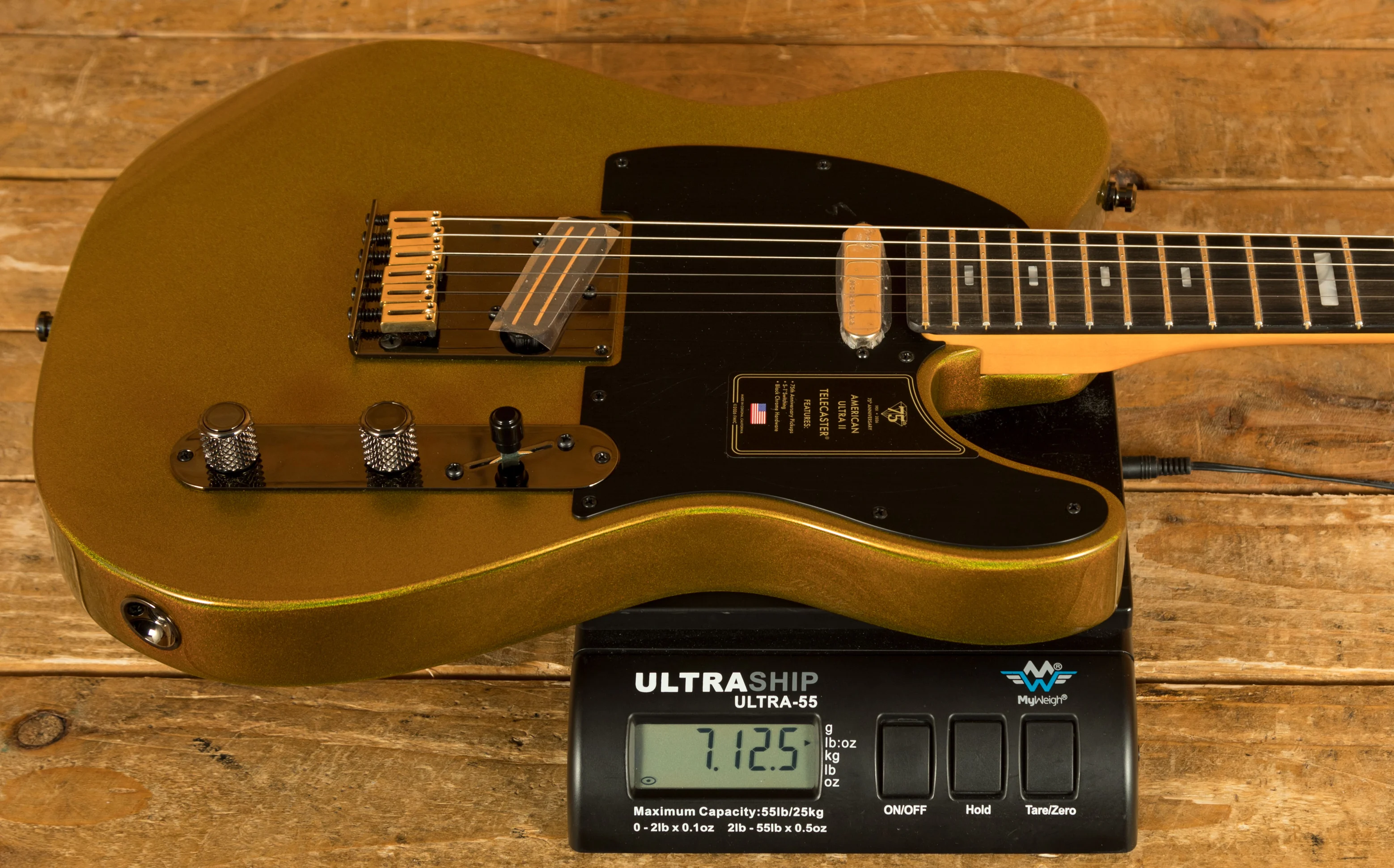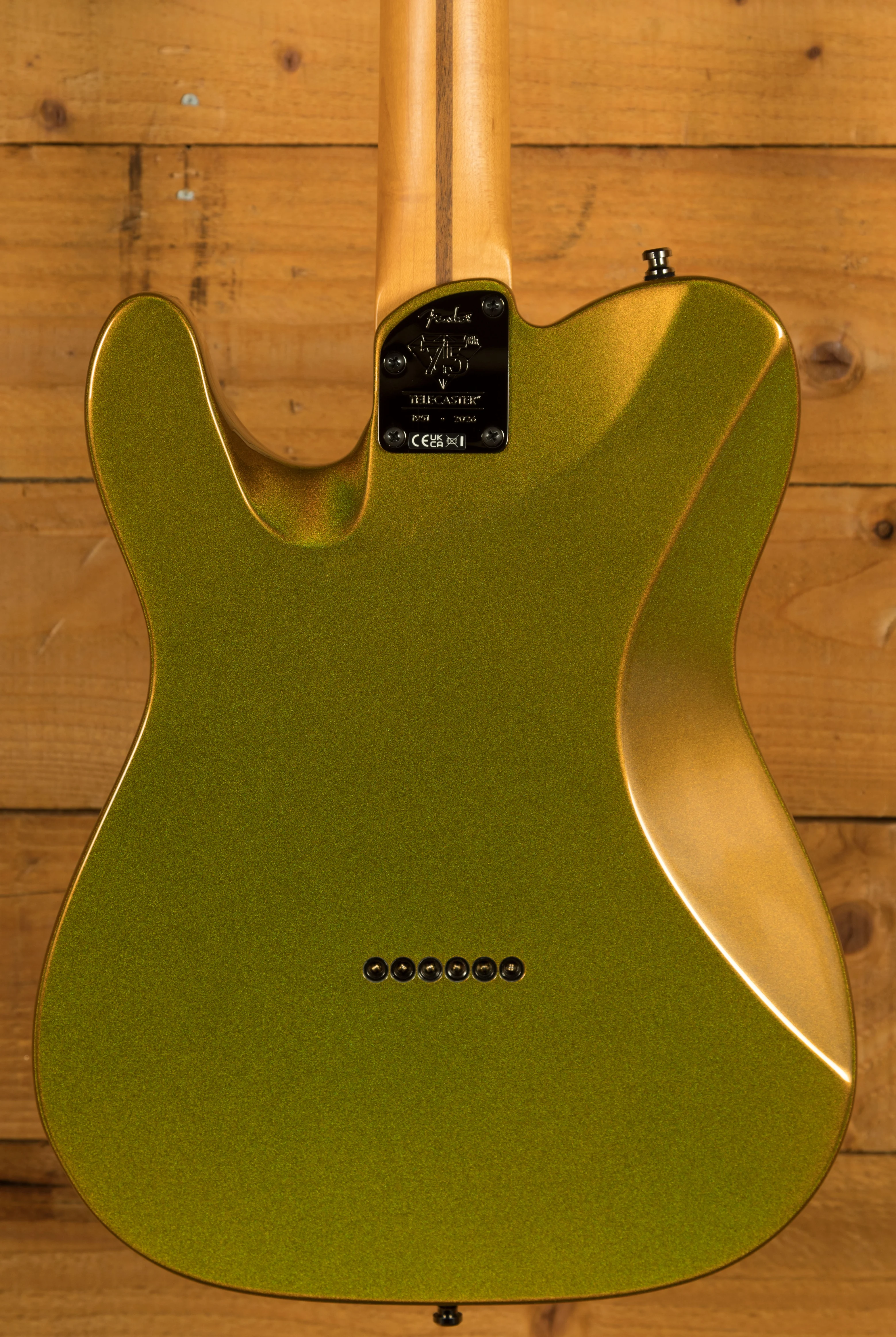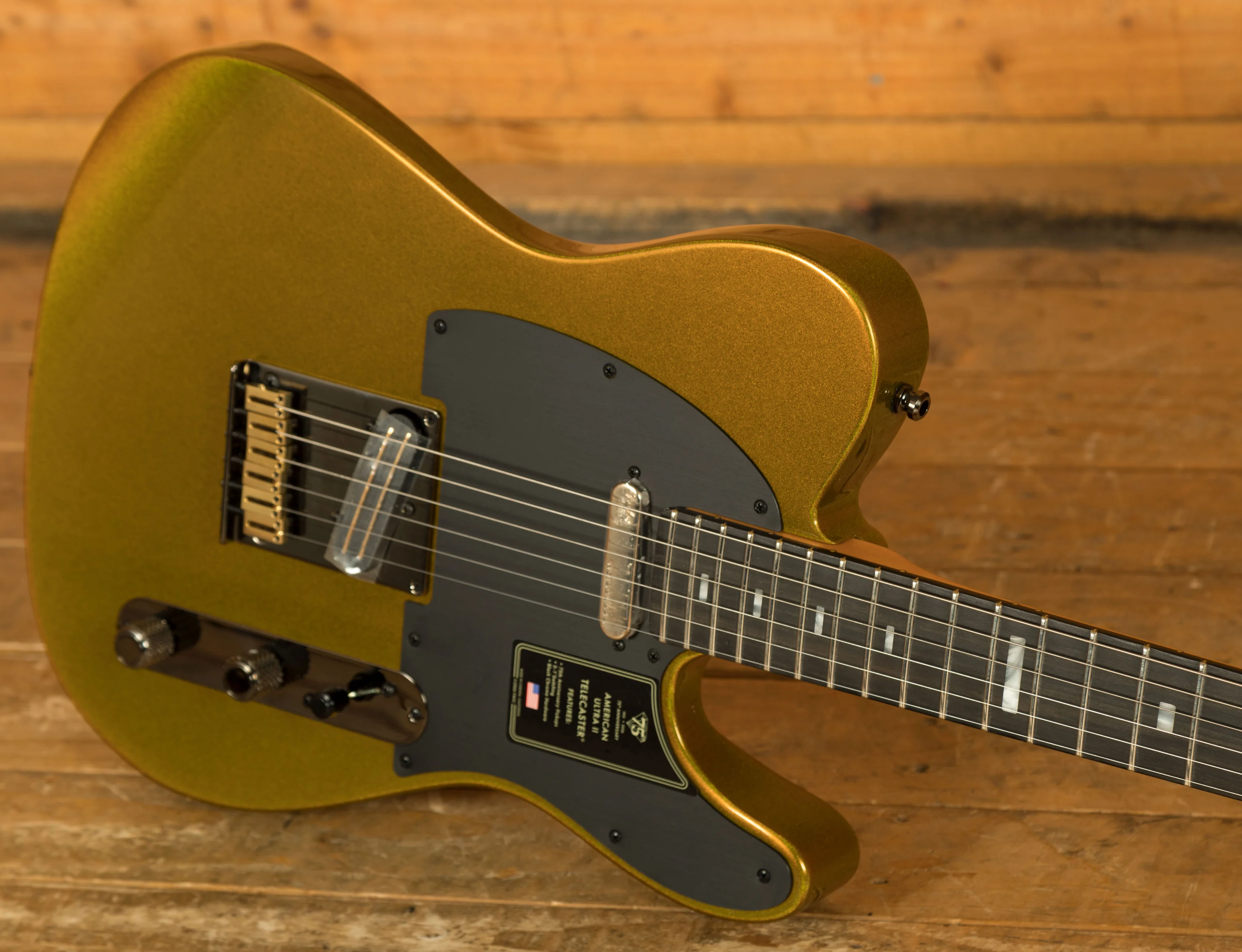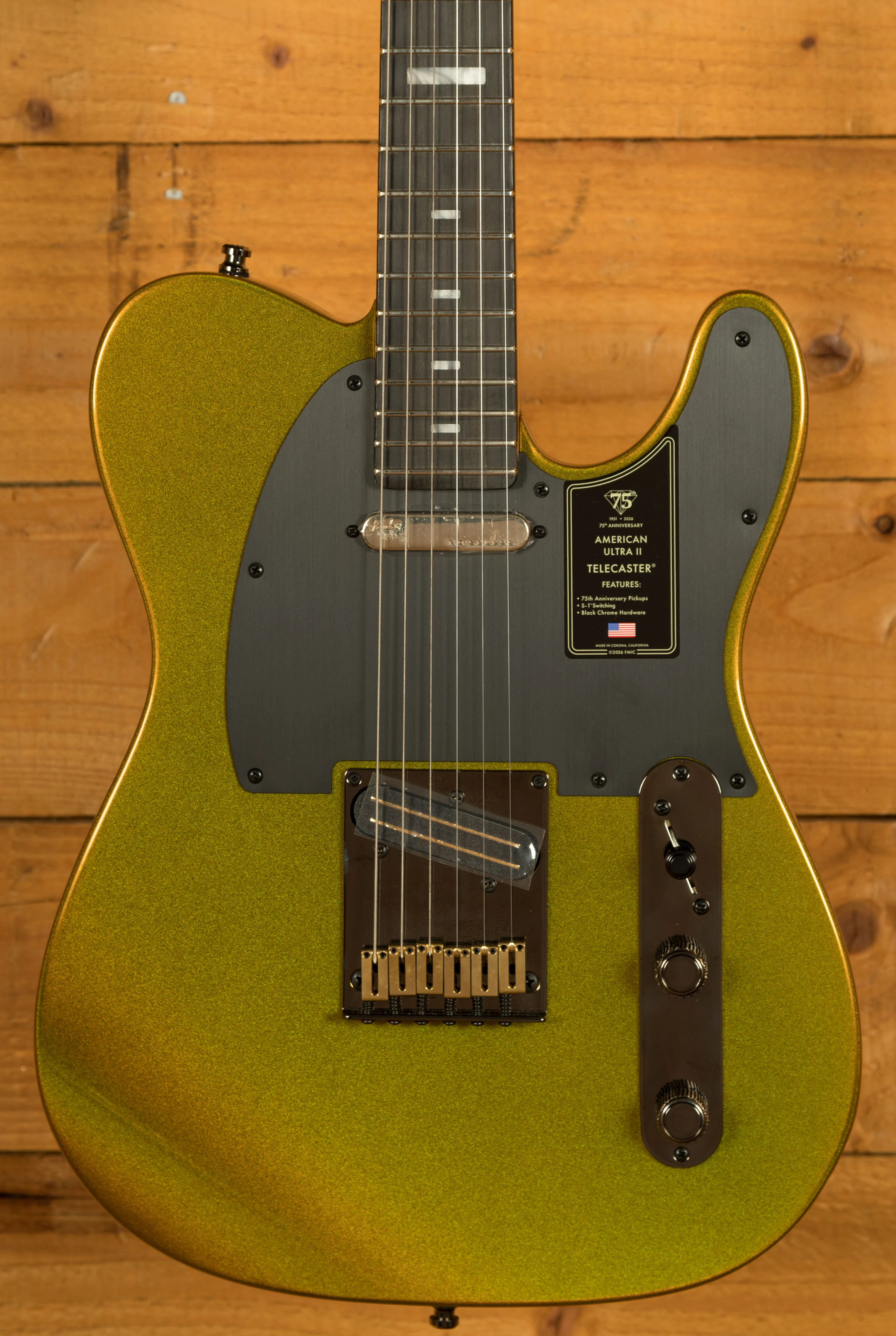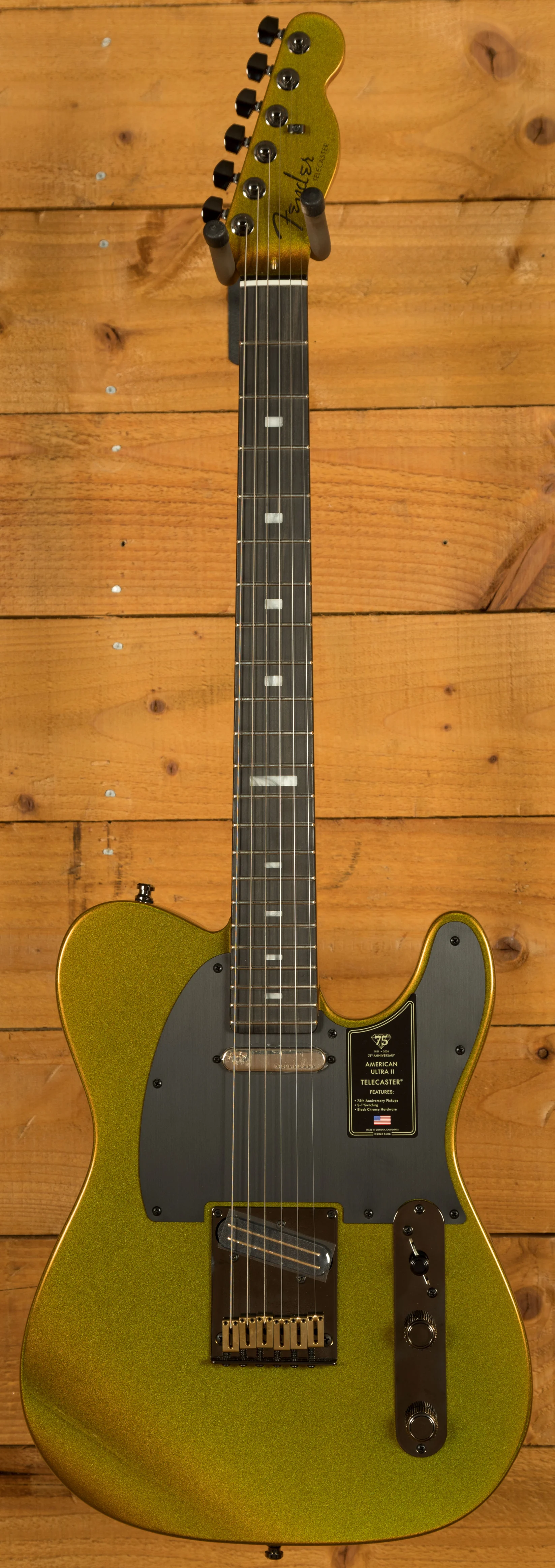 This American Ultra II model really showcases the versatility of the Tele by utilising modern features to enhance playability and quality of life. With the stunning Liquid Gold sparkling finish and Black Chrome and Gold hardware, and Anodized Aluminium pickguard, it looks mean and ready to rock. Enhanced switching options open up the sonic palette of the 75th Anniversary Fastlane and Ultra Noiseless pickups with multiple S-1 switches for series/parallel configurations.