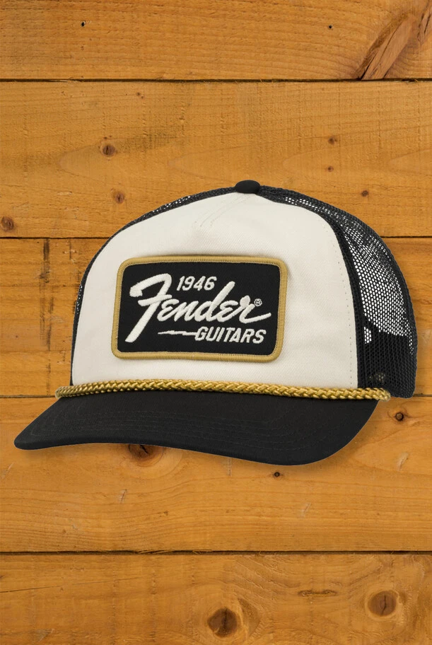 Designed with meticulous attention to detail, the hat features a slight pre-curved visor and a black sweatband for added functionality. The standout element is the beautifully embroidered "1946 Fender Guitars" patch, skillfully crafted onto the twill fabric with merrowed edges. To accentuate its vintage appeal, the hat is adorned with gold braid trim, making it a standout accessory whether you're on stage, in the studio, or enjoying time with friends.