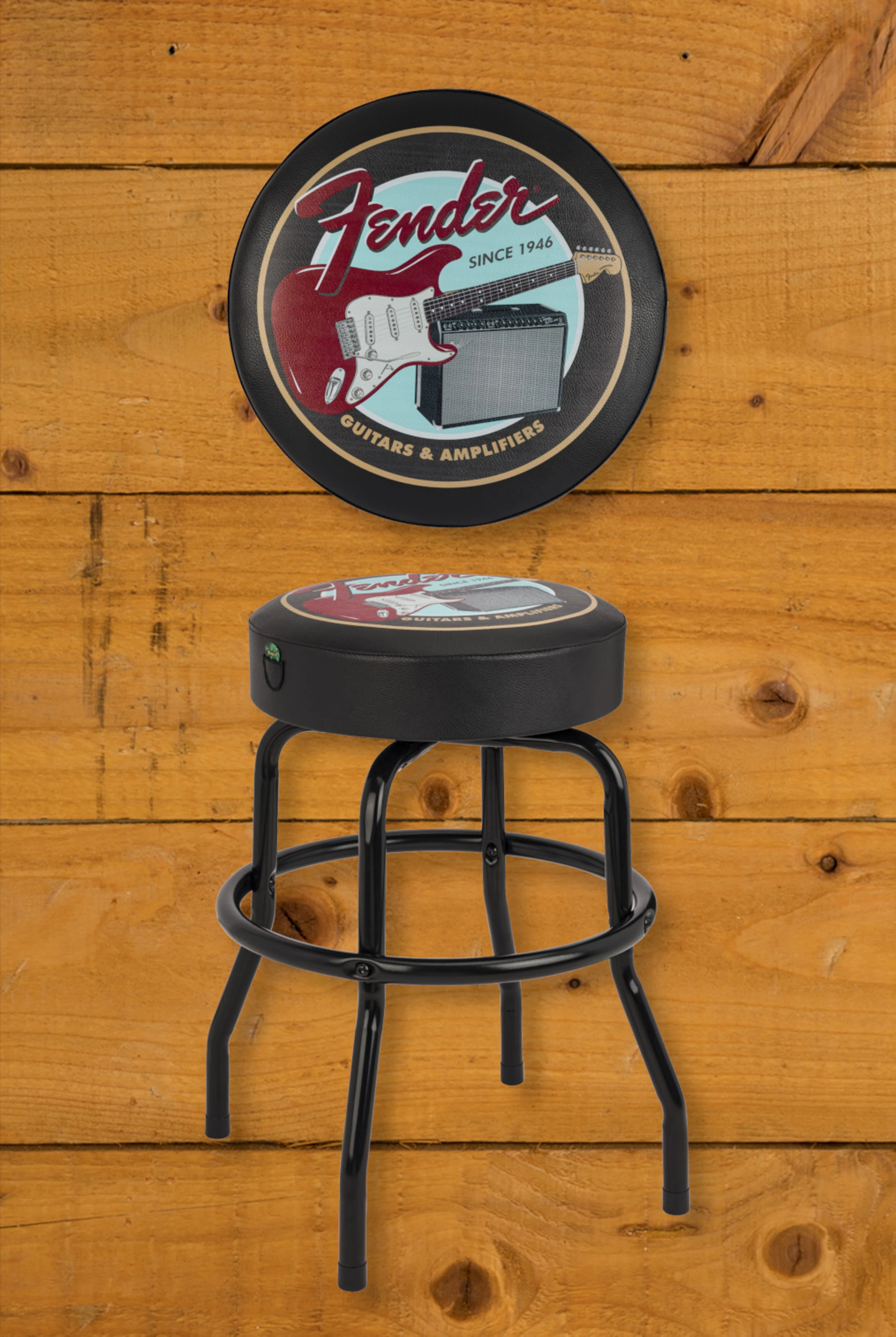 For your next jam session or wrestling up to your favourite bar, Fender has the stool for you. The Fender Guitars & Amps barstool with sewn on pick pouch is perfect for all of your guitar playing needs. This classic barstool with our iconic vintage artwork and black legs is the perfect addition to your home, office, studio or party cave. Cheers!! Your new barstool will come in recyclable, frustration free packaging. Fender is actively searching for solutions to become more sustainable.