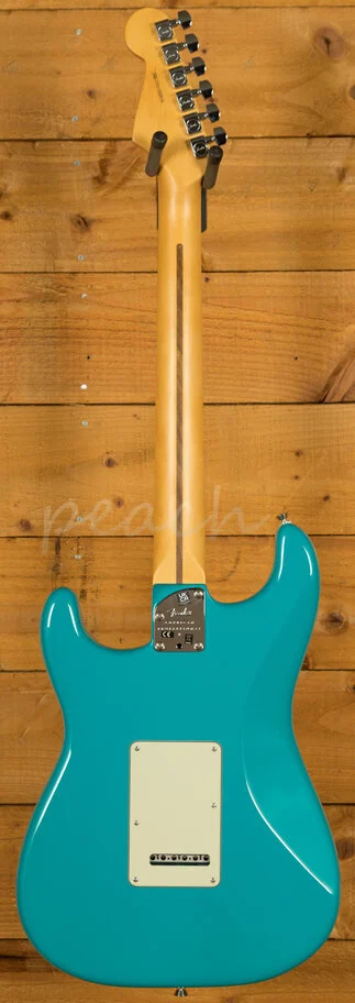 The Alder body is typically comfortable,as all Strat's are. Finished in the brilliant Miami Blue option, it looks real slick. The Maple neck with a Rosewood fingerboard feature a Deep C profile, designed for speed and comfort; it's equally at home playing big chords or intricate lead work. 22 frets, a 9.5" radius and 25.5" scale length make this Stratocaster feel familiar and supremely comfortable. The Professional II range brings a new contoured neck heel , soft rolled fingerboard edges and a super natural finish for improved feel and comfort