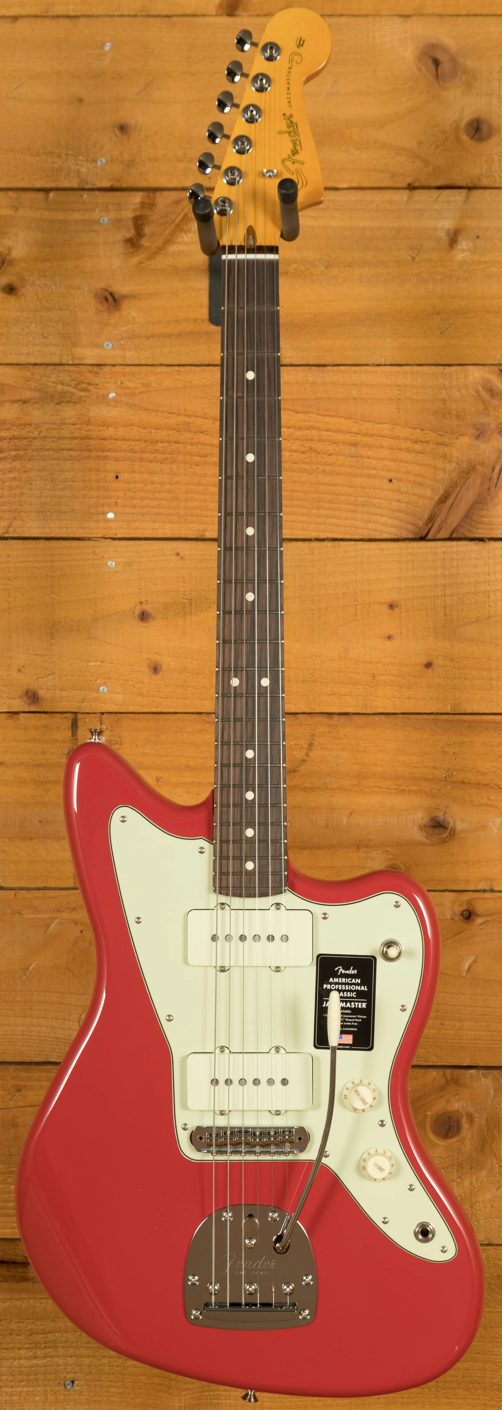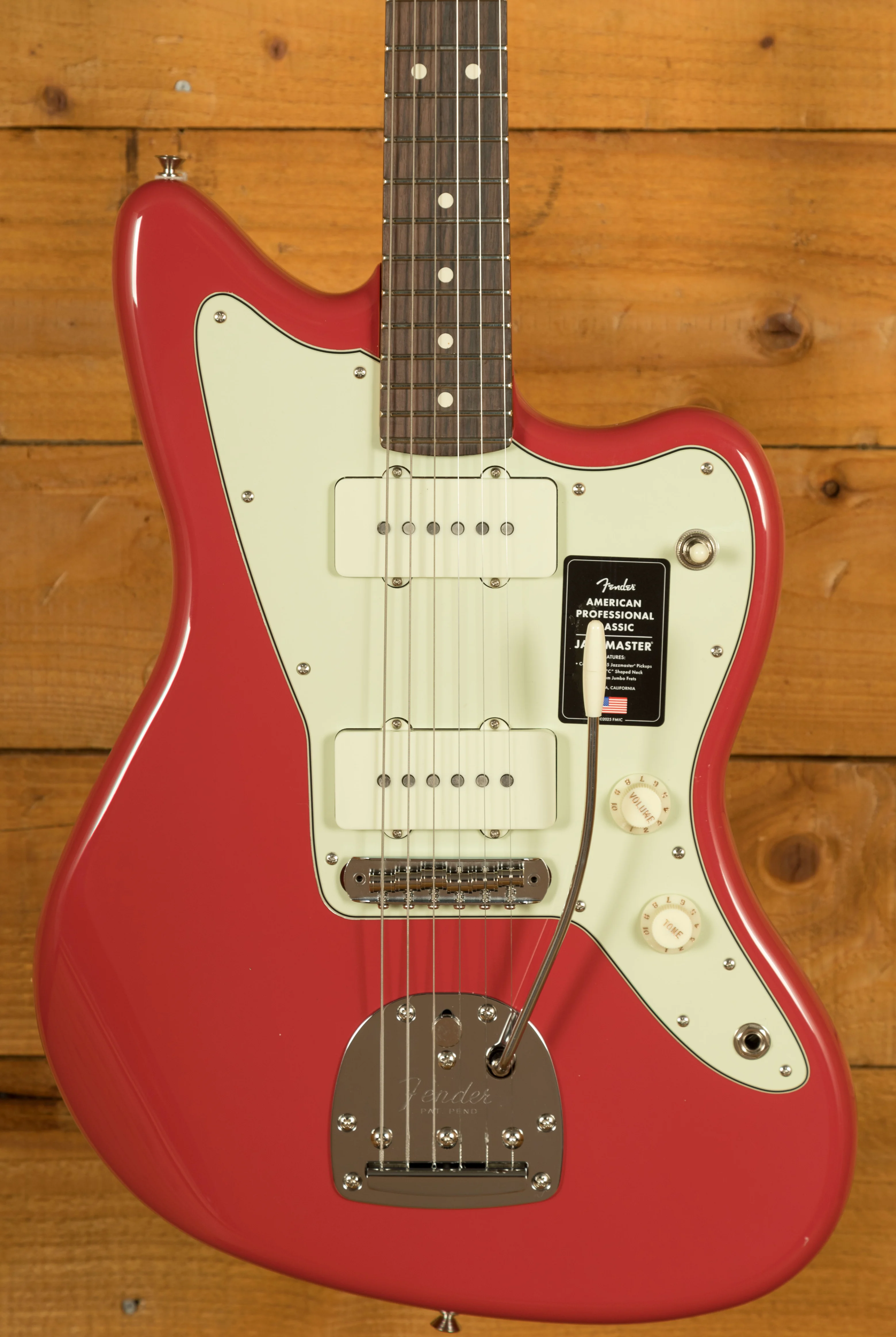 The Modern "C"-shaped neck with a 9.5" radius fingerboard and medium jumbo frets provides smooth, comfortable playability and precise control across all positions. Complementing the neck's feel, vintage-style hardware and Staggered ClassicGear tuners deliver stable tuning, reliable performance, and the familiar Jazzmaster aesthetic. The floating tremolo system enables expressive vibrato effects with smooth, responsive action. The Fender American Professional Classic Jazzmaster is a reliable, high-performance instrument that blends vintage design with modern playability and tone consistency.
