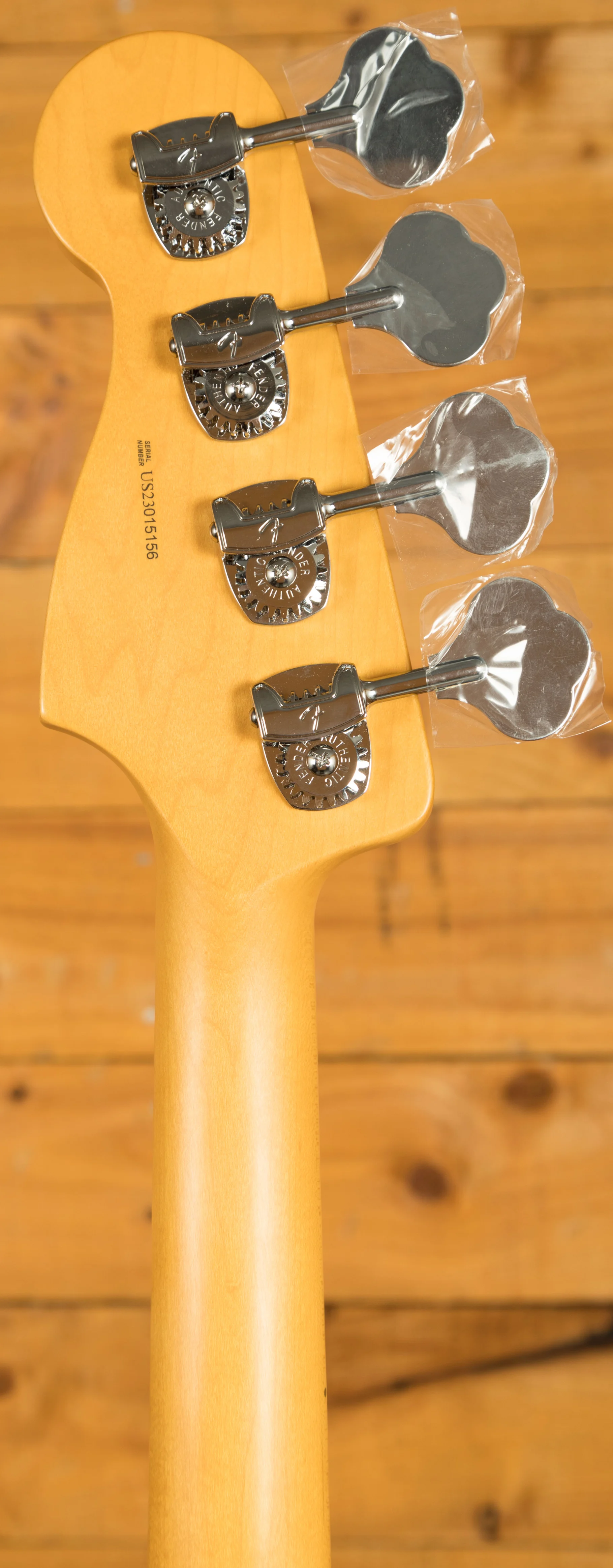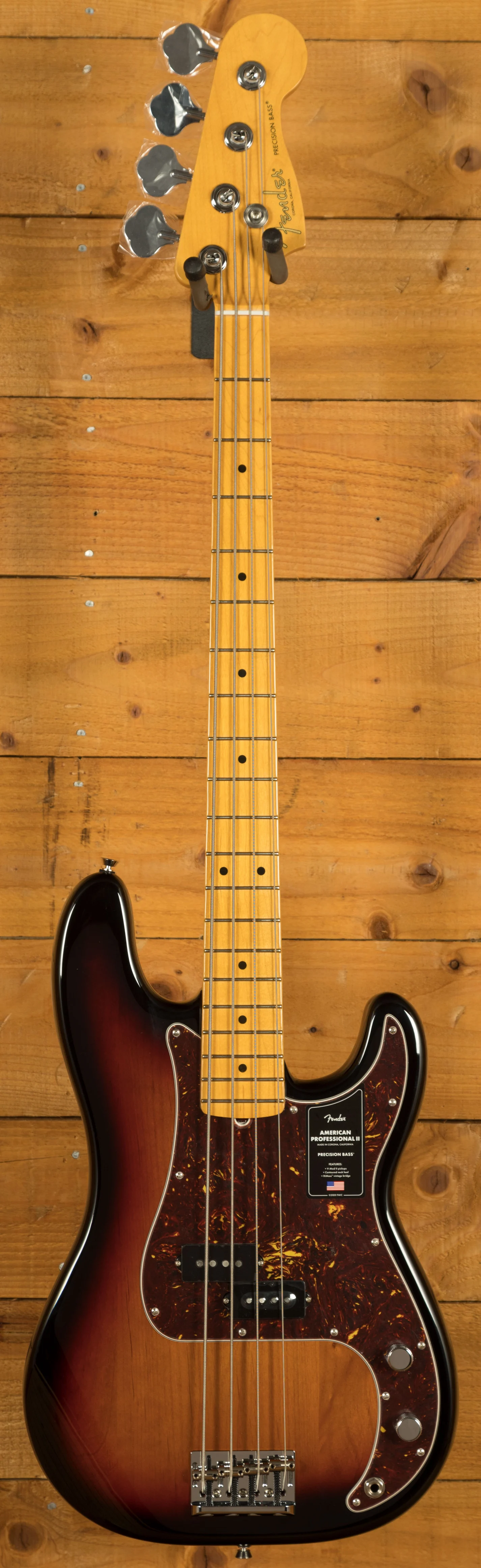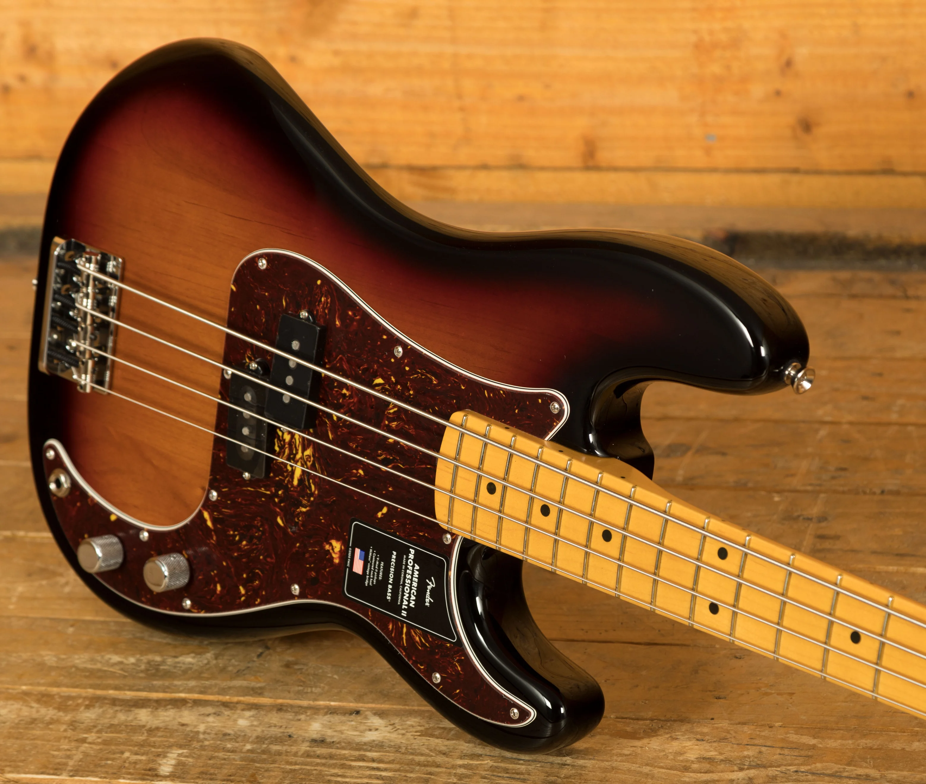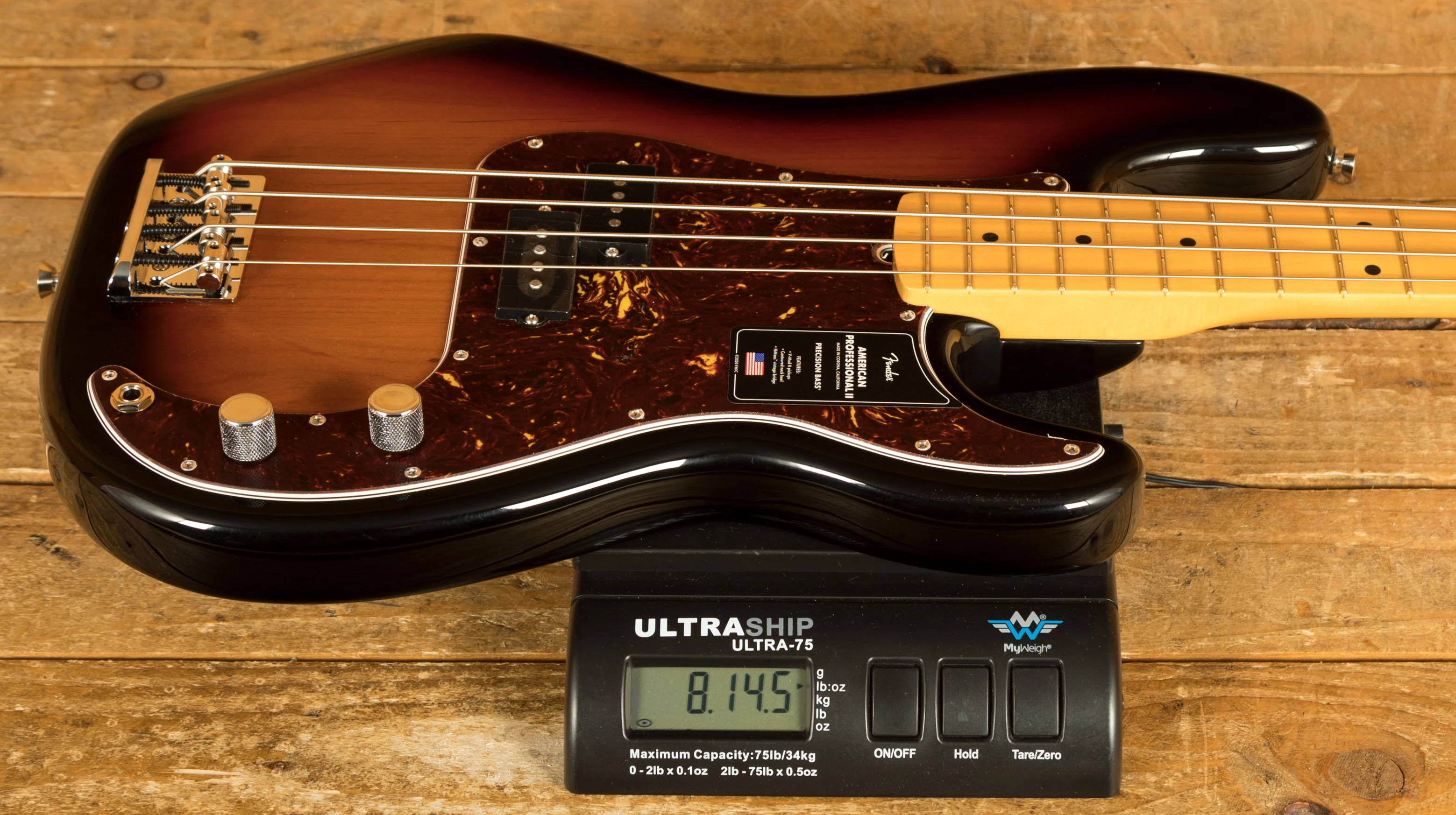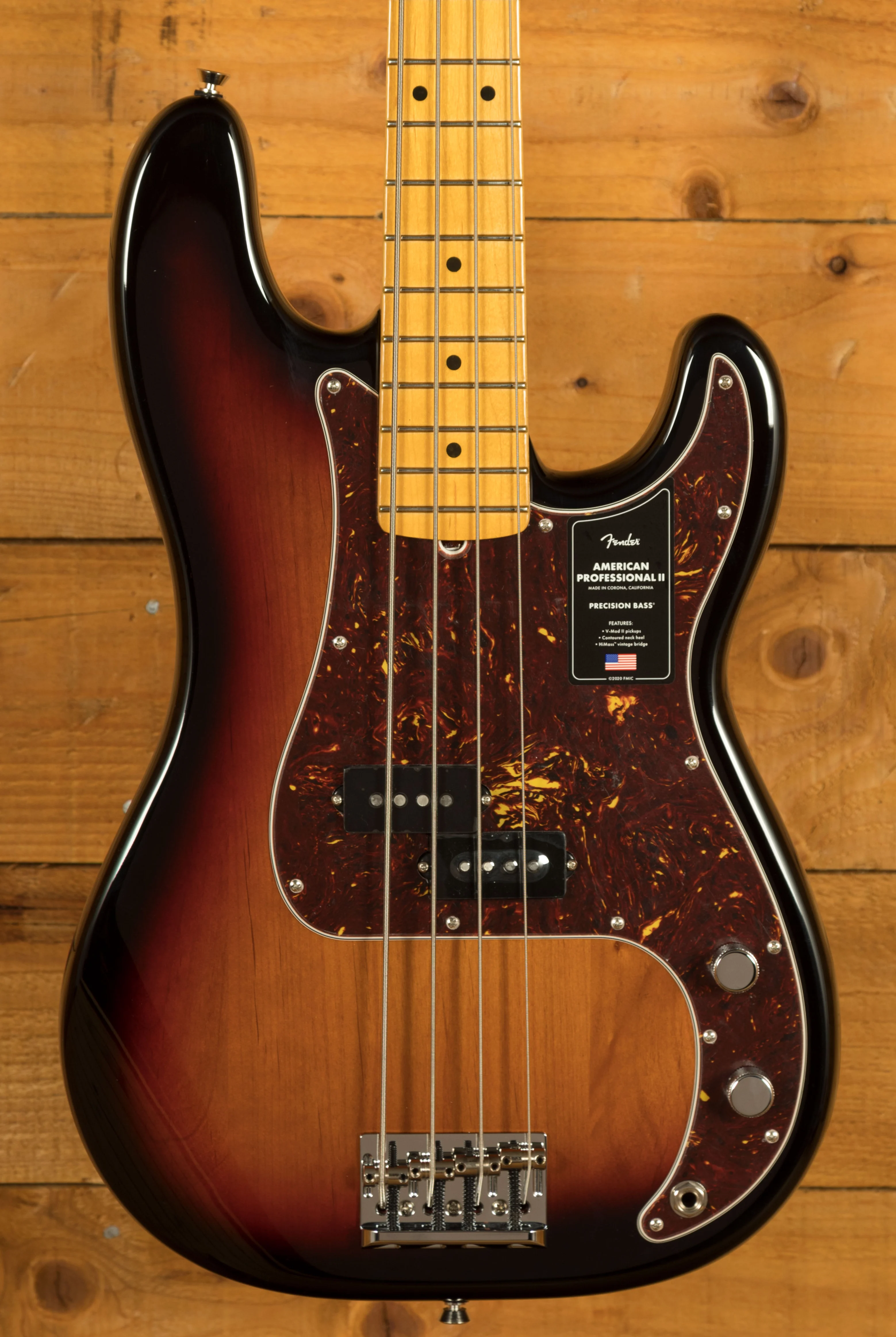 The Alder body is typically comfortable, as all Precision Bass's are, finished in the brilliant 3 Colour Sunburst option, it looks real slick. The Maple neck and fingerboard feature a '63 profile, designed for speed and comfort; This bass is super easy to navigate, allowing for great access to the upper register. 20 frets, a 9.5" radius and 34" scale length make this Precision Bass feel familiar and supremely comfortable. The Professional II range brings a new contoured neck heel , soft rolled fingerboard edges and a super natural finish for improved feel and comfort