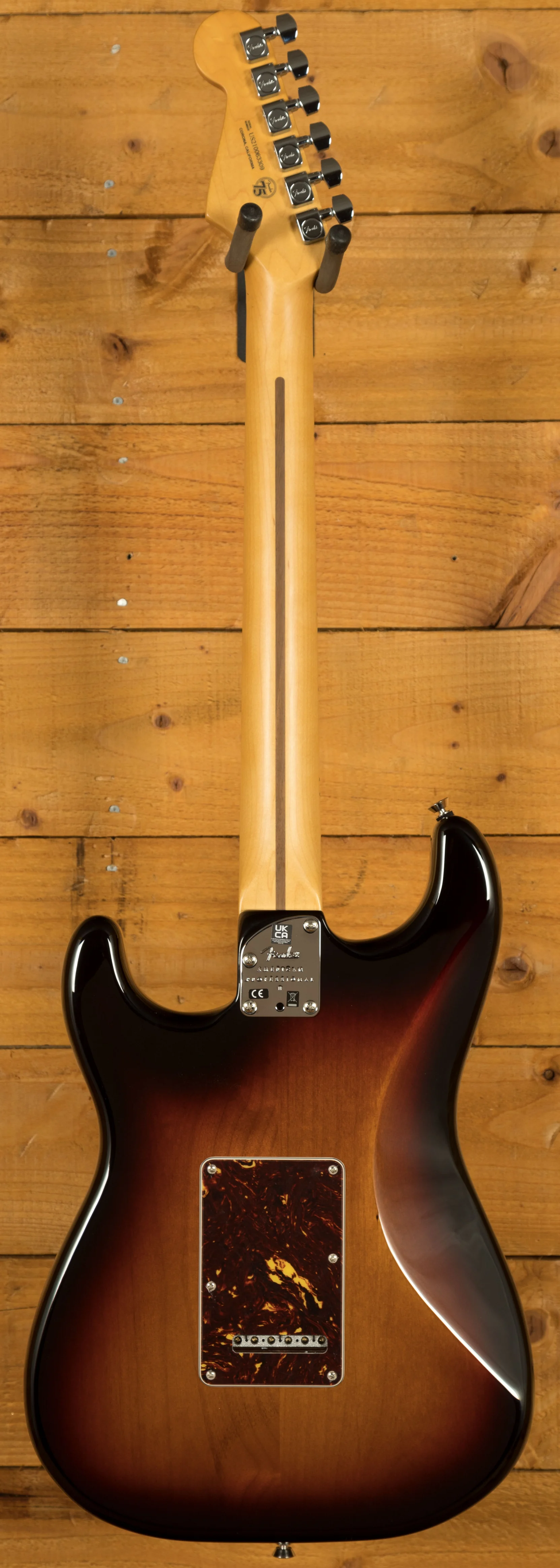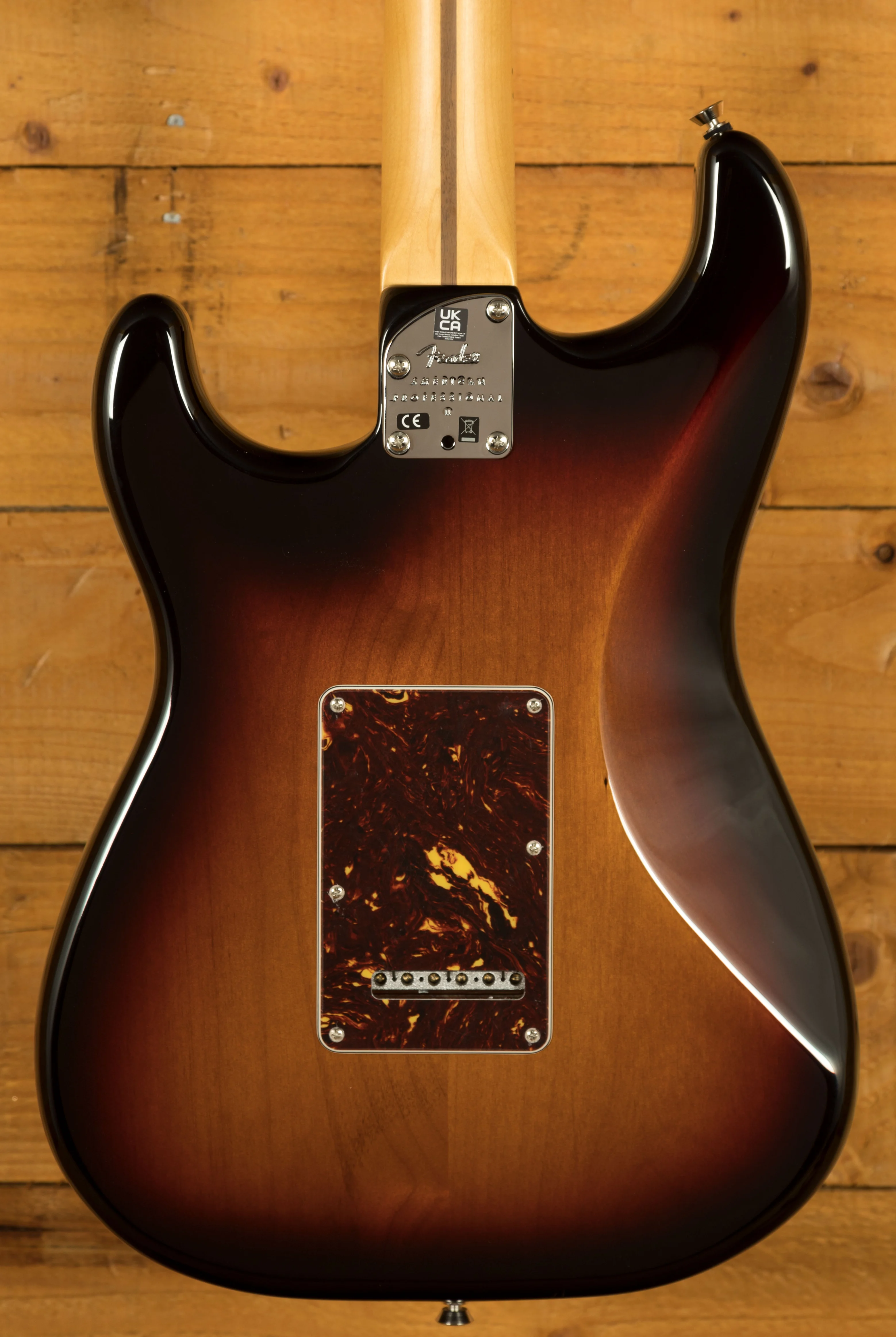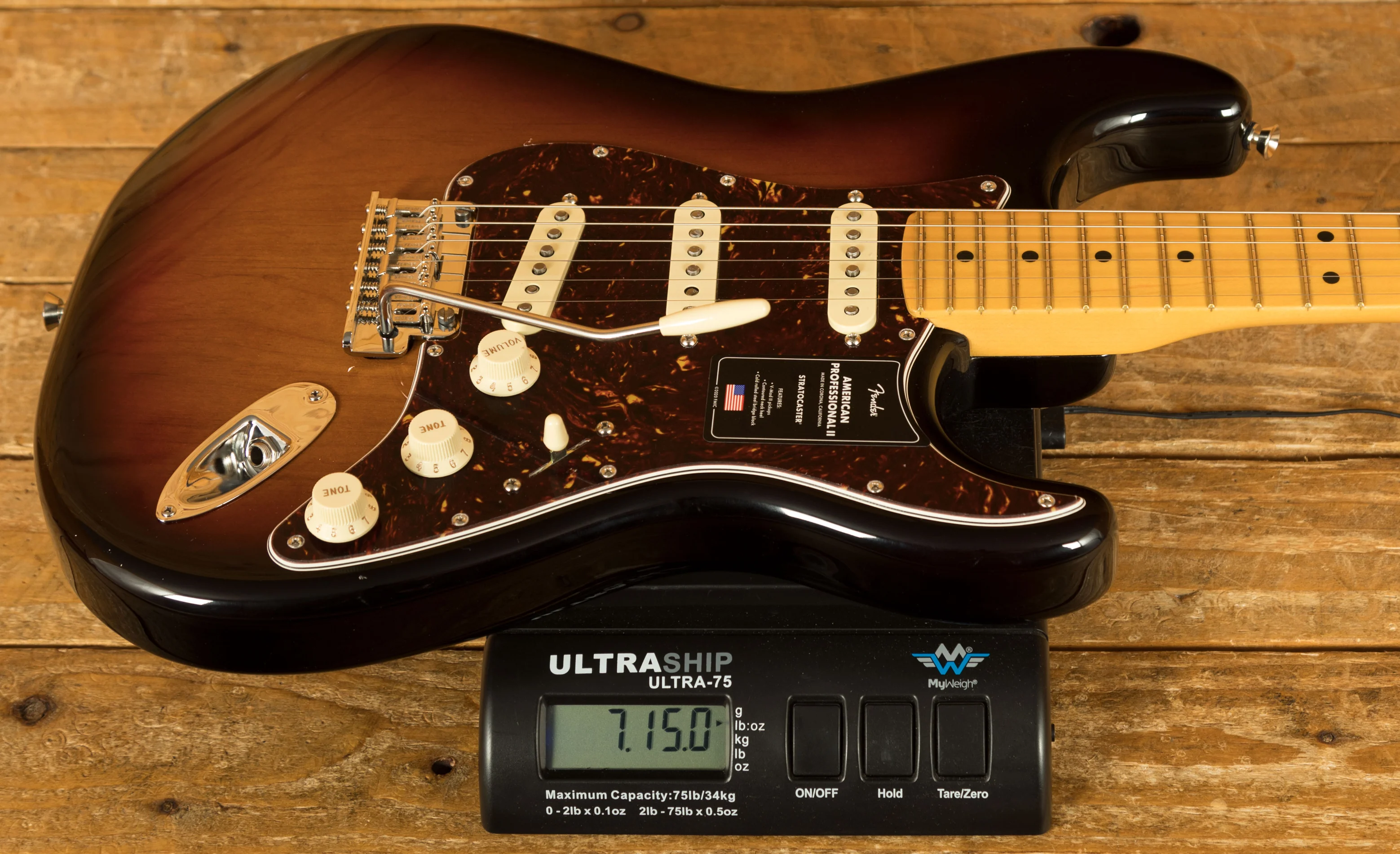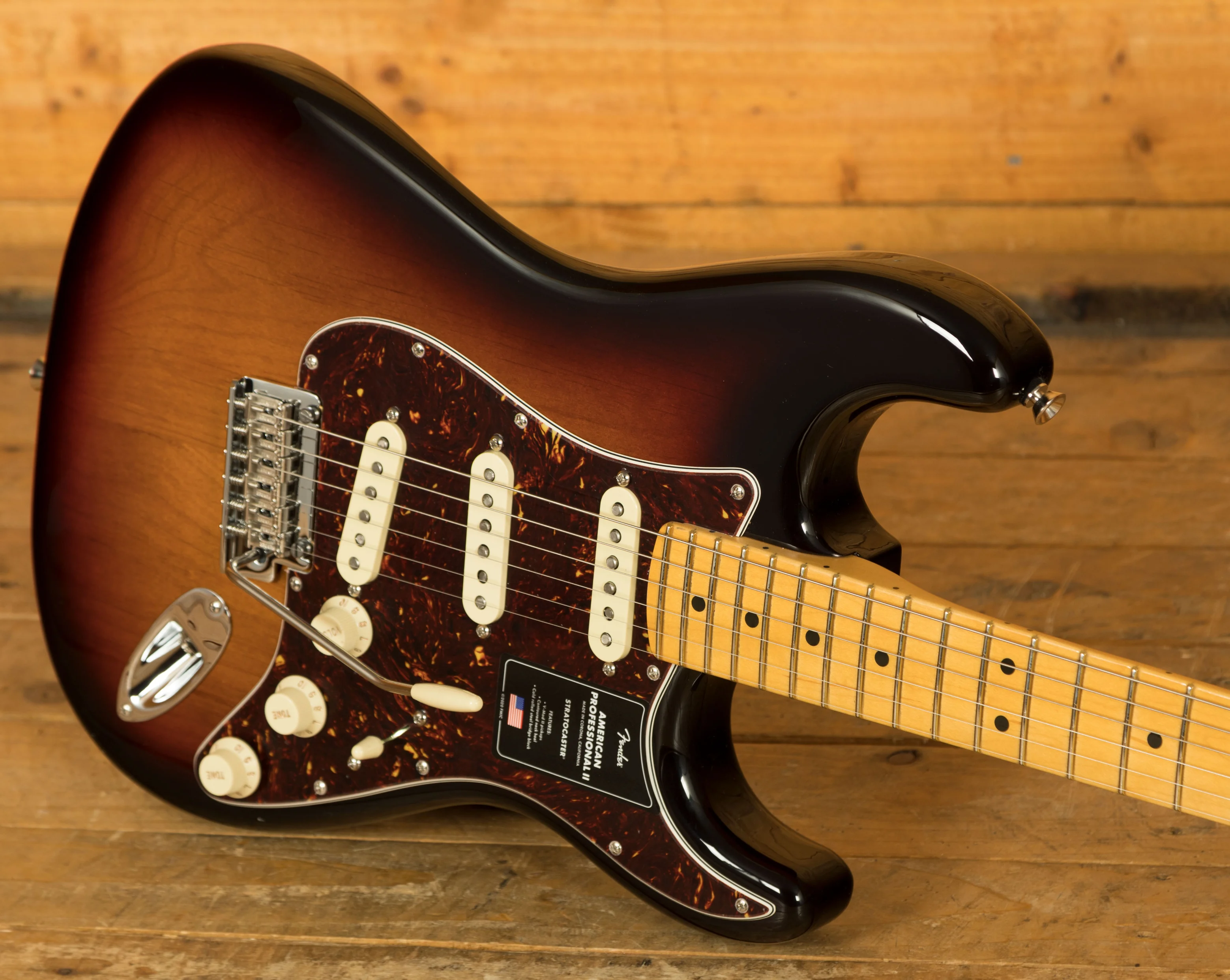 The Alder body is typically comfortable,as all Strat's are, Finished in the brilliant 3 Colour Sunburst option, it looks real slick. The Maple neck and fingerboard feature a Deep C profile, designed for speed and comfort; it's equally at home playing big chords or intricate lead work. 22 frets, a 9.5" radius and 25.5" scale length make this Stratocaster feel familiar and supremely comfortable. The Professional II range brings a new contoured neck heel , soft rolled fingerboard edges and a super natural finish for improved feel and comfort