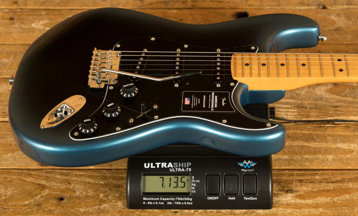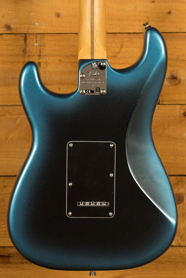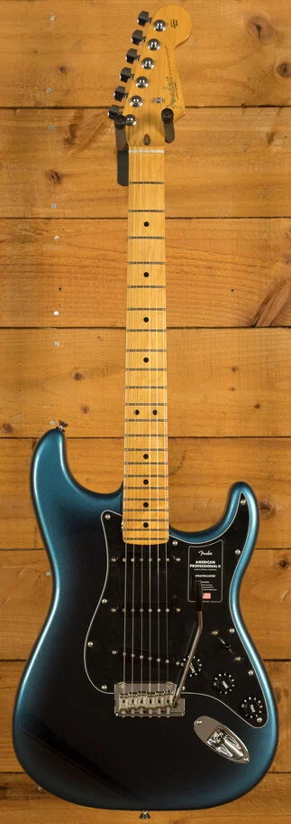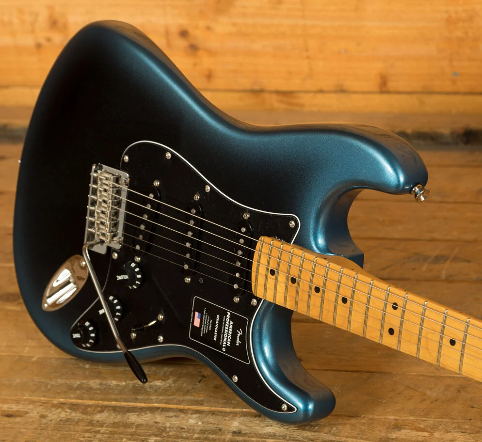The Alder body is typically comfortable,as all Strat's are, Finished in the brilliant Dark Night option, it looks real slick. The Maple neck and fingerboard feature a Deep C profile, designed for speed and comfort; it's equally at home playing big chords or intricate lead work. 22 frets, a 9.5" radius and 25.5" scale length make this Stratocaster feel familiar and supremely comfortable. The Professional II range brings a new contoured neck heel , soft rolled fingerboard edges and a super natural finish for improved feel and comfort