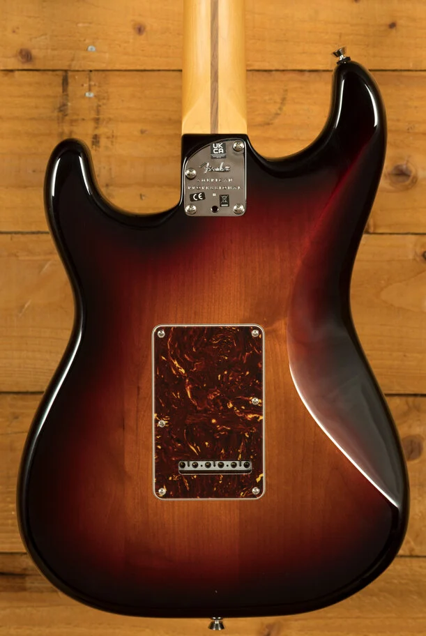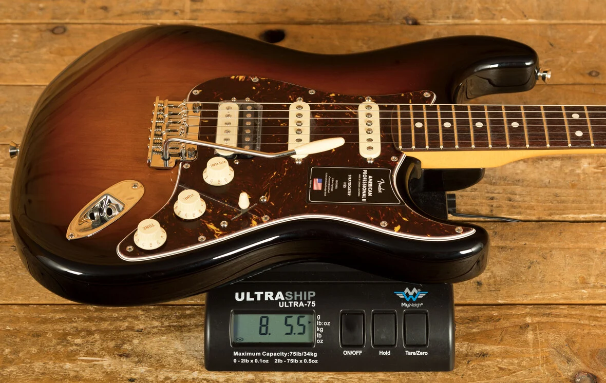 The Alder body is typically comfortable,as all Strat's are. Finished in the brilliant 3 Colour Sunburst option, it looks real slick. The Maple neck with a Rosewood fingerboard feature a Deep C profile, designed for speed and comfort; it's equally at home playing big chords or intricate lead work. 22 frets, a 9.5" radius and 25.5" scale length make this Stratocaster feel familiar and supremely comfortable. The Professional II range brings a new contoured neck heel , soft rolled fingerboard edges and a super natural finish for improved feel and comfort