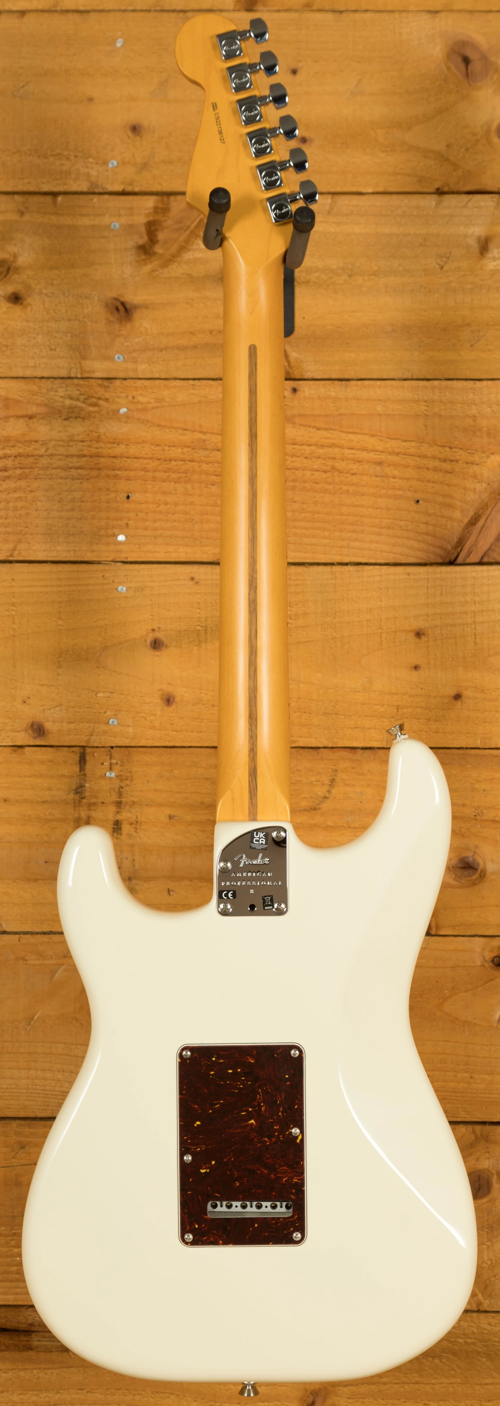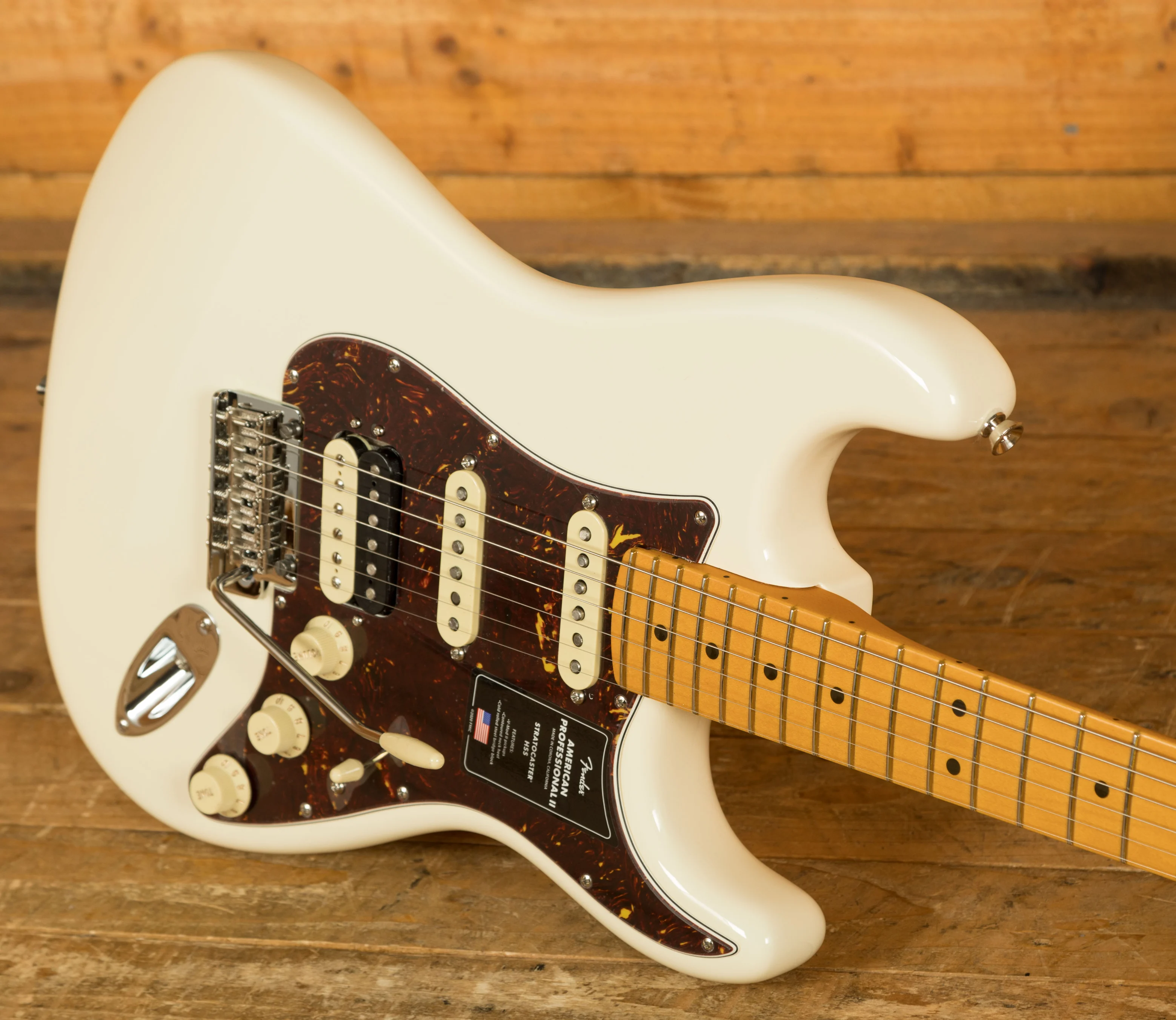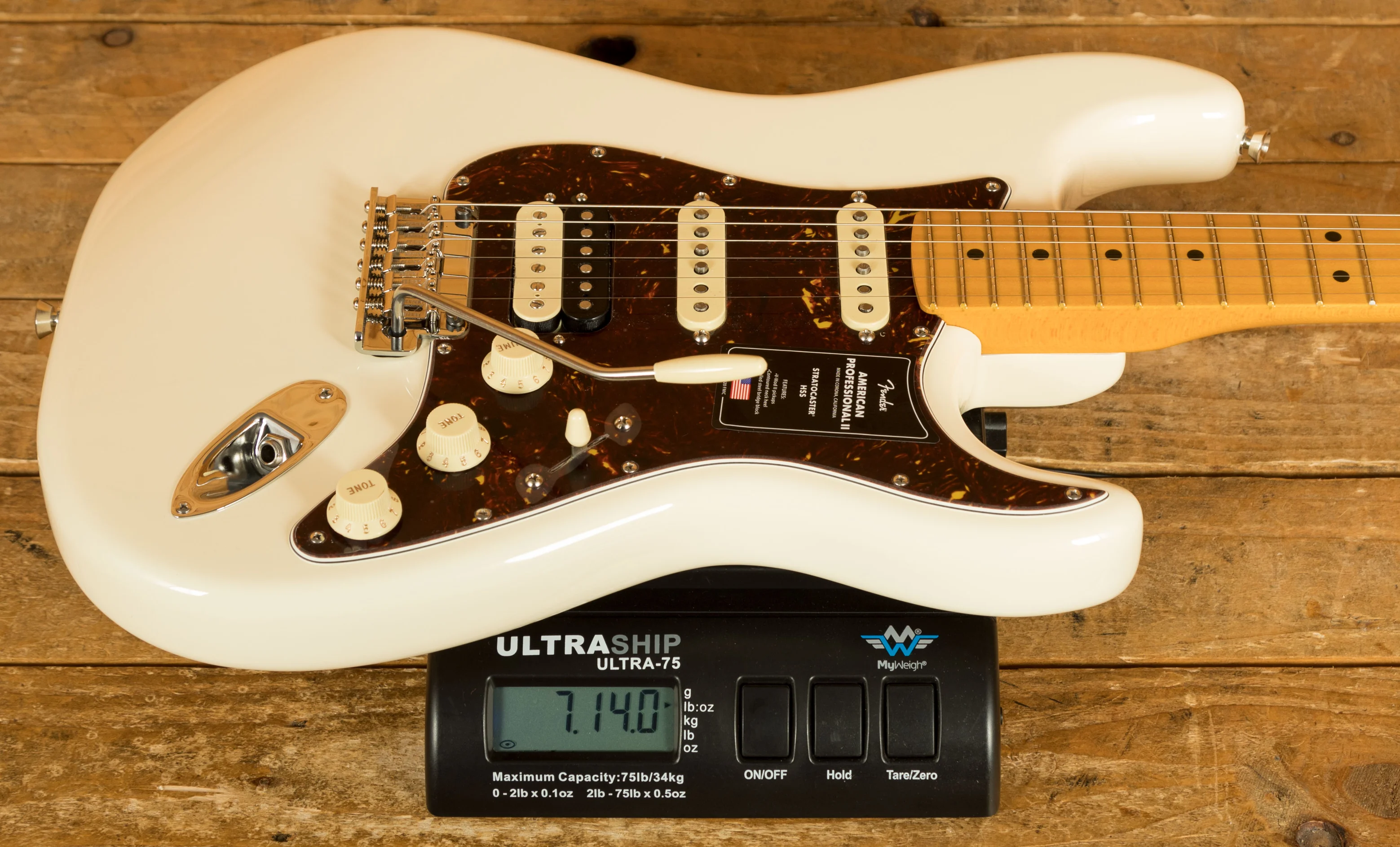 The Alder body is typically comfortable,as all Strat's are. Finished in the brilliant Olympic White option, it looks real slick. The Maple neck and fingerboard feature a Deep C profile, designed for speed and comfort; it's equally at home playing big chords or intricate lead work. 22 frets, a 9.5" radius and 25.5" scale length make this Stratocaster feel familiar and supremely comfortable. The Professional II range brings a new contoured neck heel , soft rolled fingerboard edges and a super natural finish for improved feel and comfort