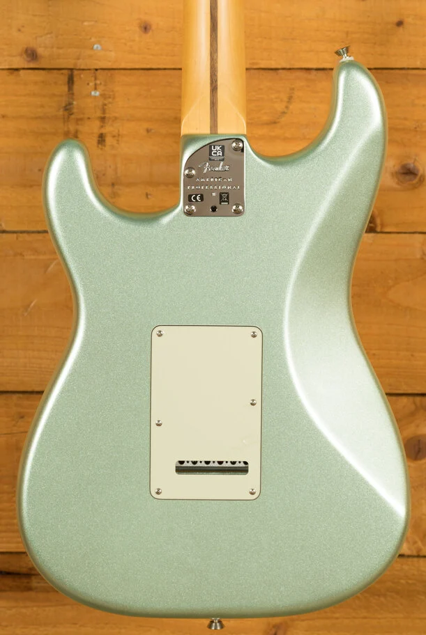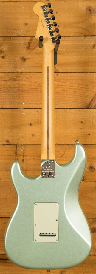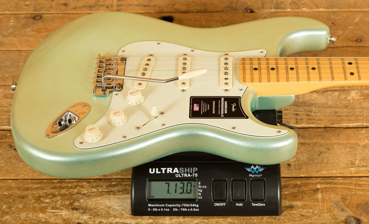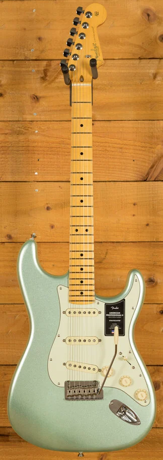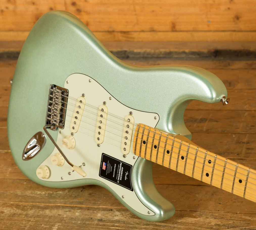 The Alder body is typically comfortable,as all Strat's are, Finished in the brilliant Mystic Surf Green option, it looks real slick. The Maple neck and fingerboard feature a Deep C profile, designed for speed and comfort; it's equally at home playing big chords or intricate lead work. 22 frets, a 9.5" radius and 25.5" scale length make this Stratocaster feel familiar and supremely comfortable. The Professional II range brings a new contoured neck heel , soft rolled fingerboard edges and a super natural finish for improved feel and comfort