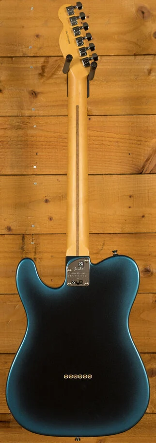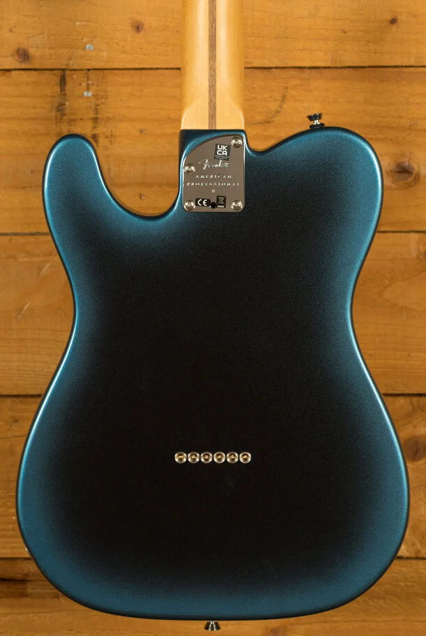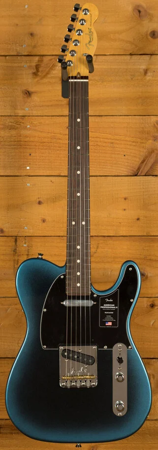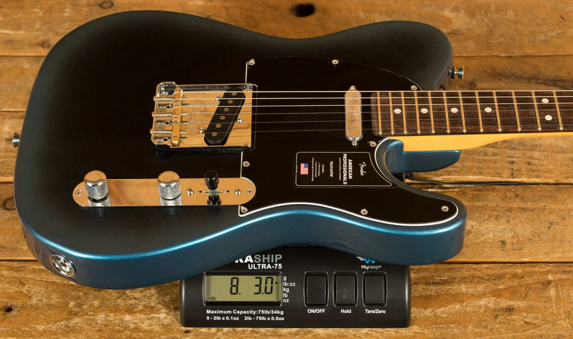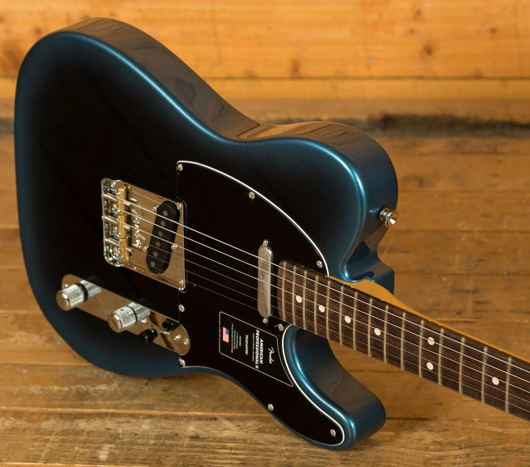 The Alder body is typically comfortable, as all Tele's are, finished in the brilliant Dark Night option, it looks real slick. The Maple neck with a Rosewood fingerboard feature a Deep C profile, designed for speed and comfort; it's equally at home playing big chords or intricate lead work. 22 frets, a 9.5" radius and 25.5" scale length make this Tele feel familiar and supremely comfortable. The Professional II range brings a new contoured neck heel , soft rolled fingerboard edges and a super natural finish for improved feel and comfort