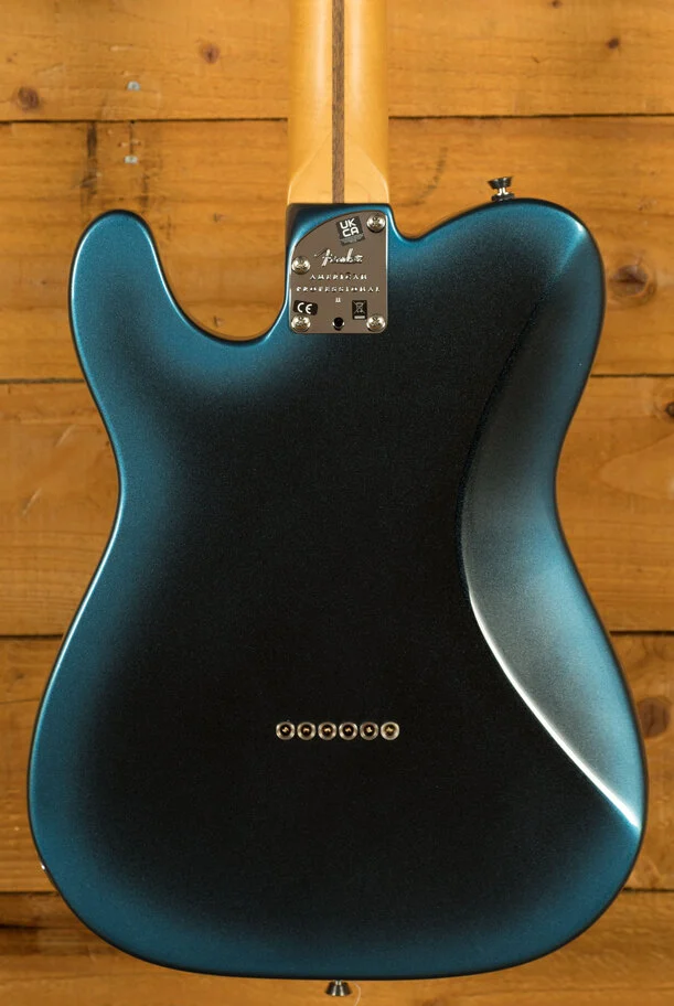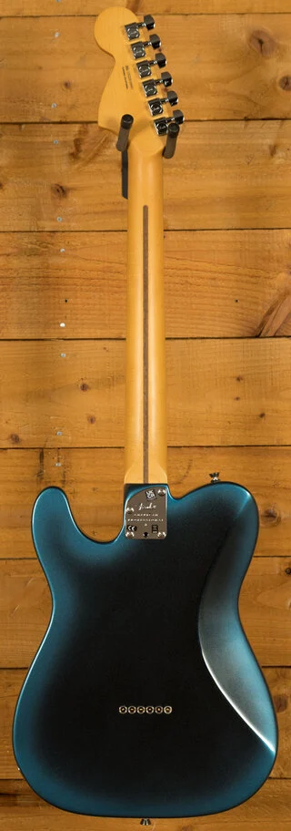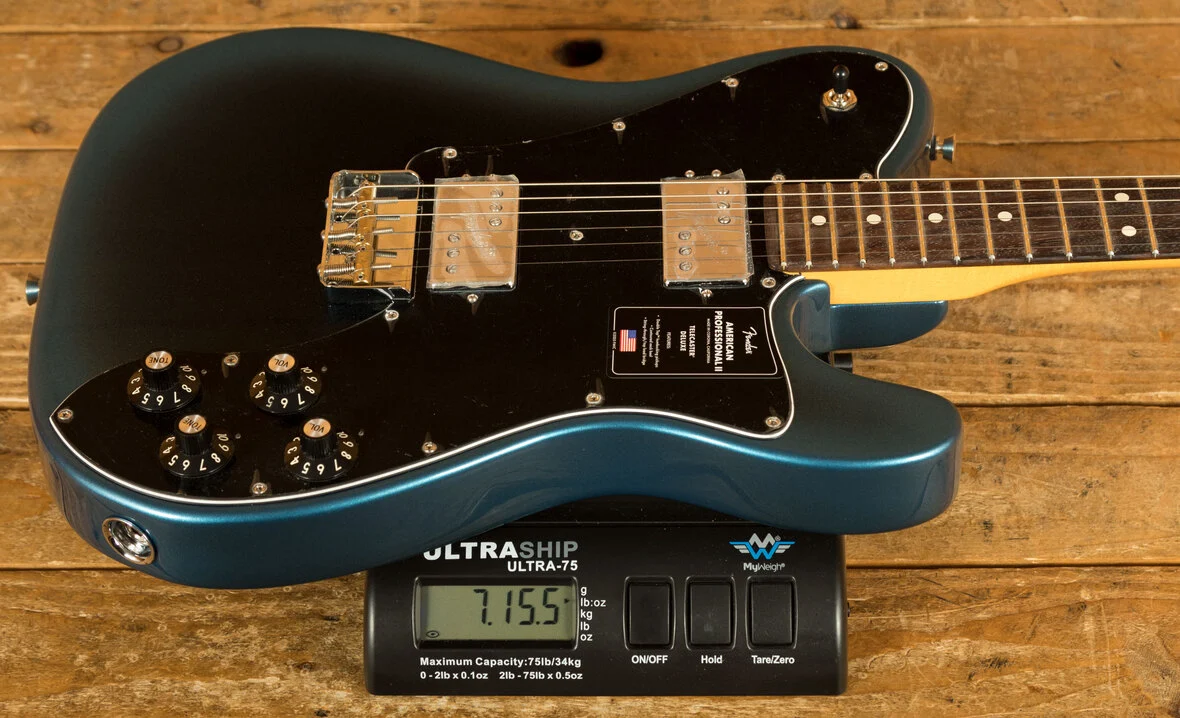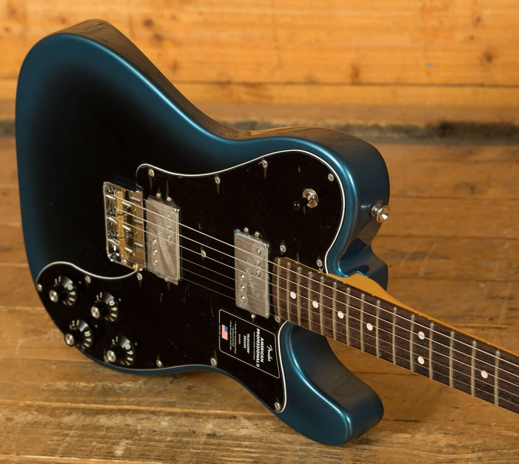 The Alder body is typically comfortable,as all Tele's are, finished in the brilliant Dark Night option, it looks real slick. The Maple neck with a Rosewood fingerboard feature a Deep C profile, designed for speed and comfort; it's equally at home playing big chords or intricate lead work. 22 frets, a 9.5" radius and 25.5" scale length make this Tele feel familiar and supremely comfortable. The Professional II range brings a new contoured neck heel , soft rolled fingerboard edges and a super natural finish for improved feel and comfort