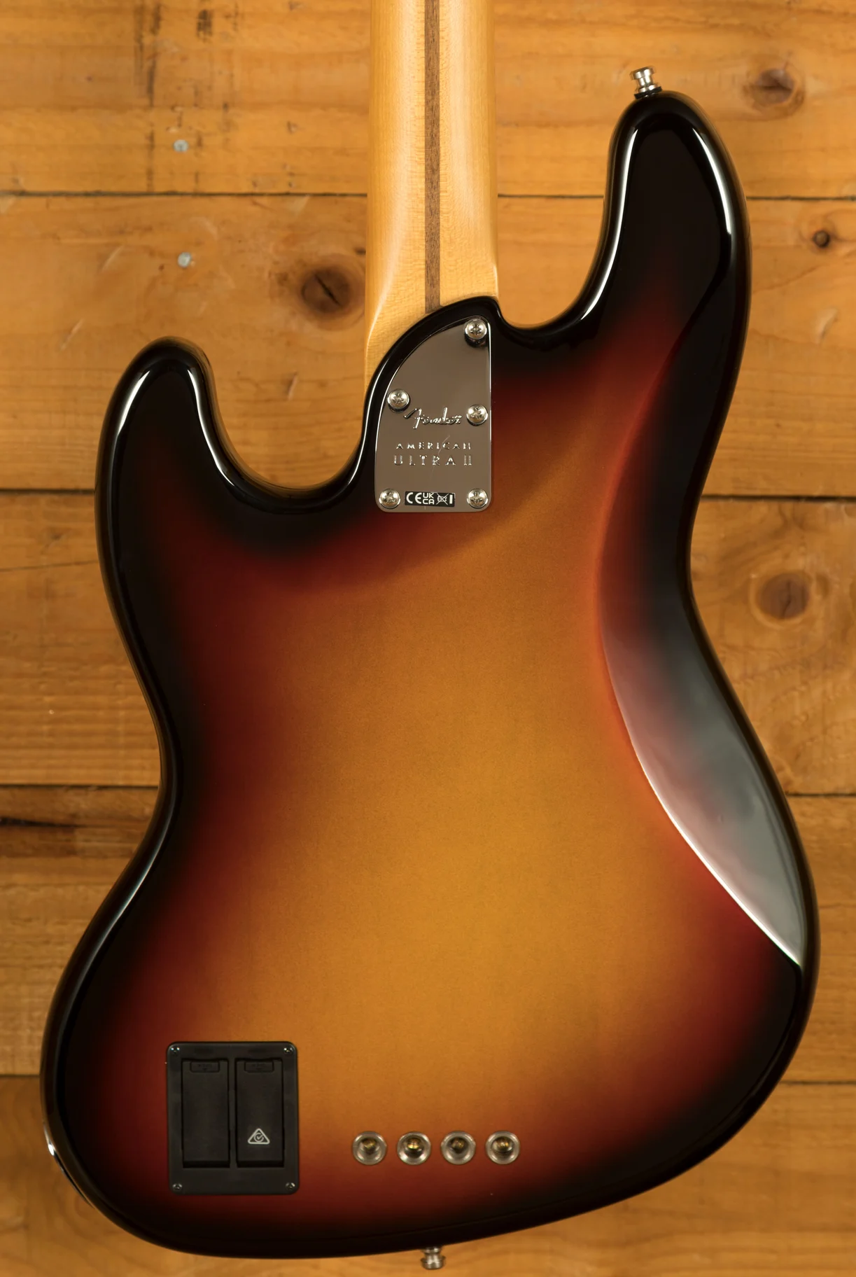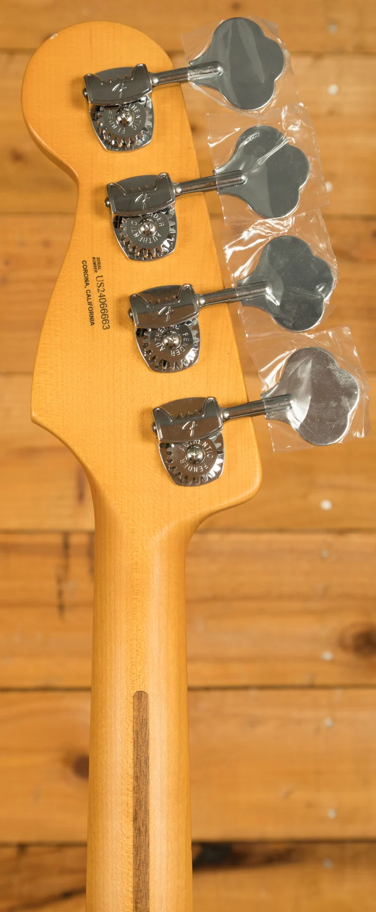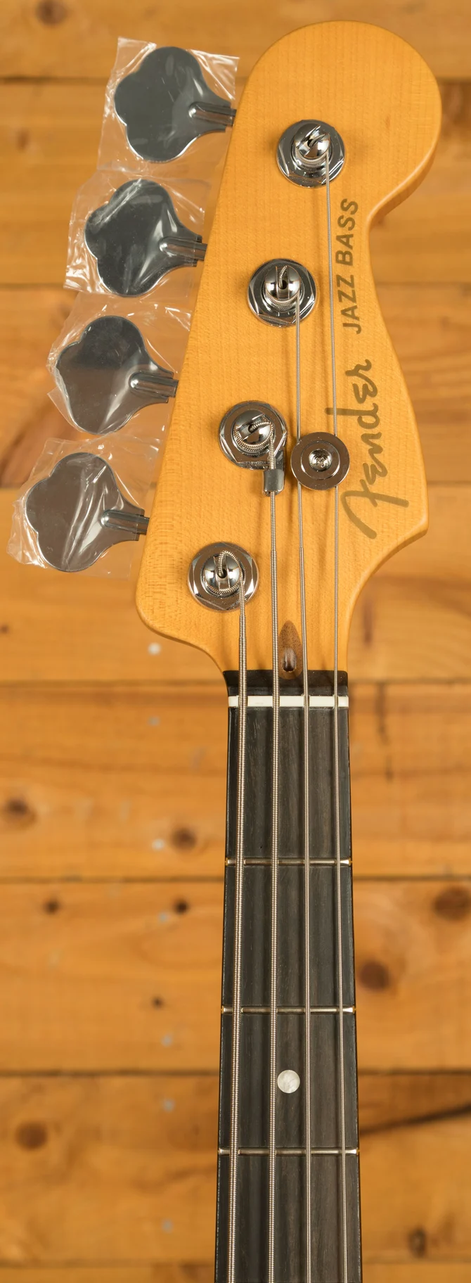 The ebony fingerboard on the American Ultra II Jazz Bass is designed with a 10"-14" compound radius, which enhances comfort and speed during play. The rounded design near the nut transitions to a flatter profile, allowing for easier access to higher notes. Luminlay side dots provide excellent visibility on stage, ensuring that players can navigate the fretboard effortlessly, even in low-light conditions. The ultra-rolled edges and satin finish contribute to a smooth playing experience, minimising friction and allowing for swift movement along the neck.