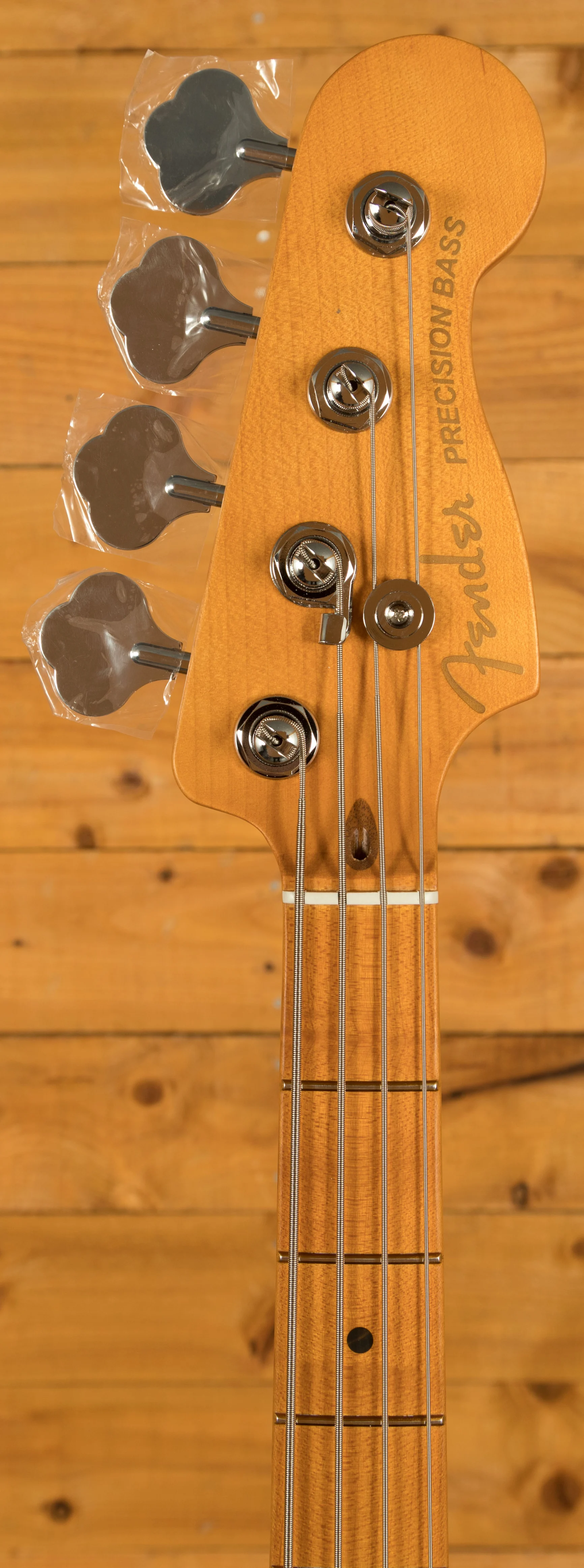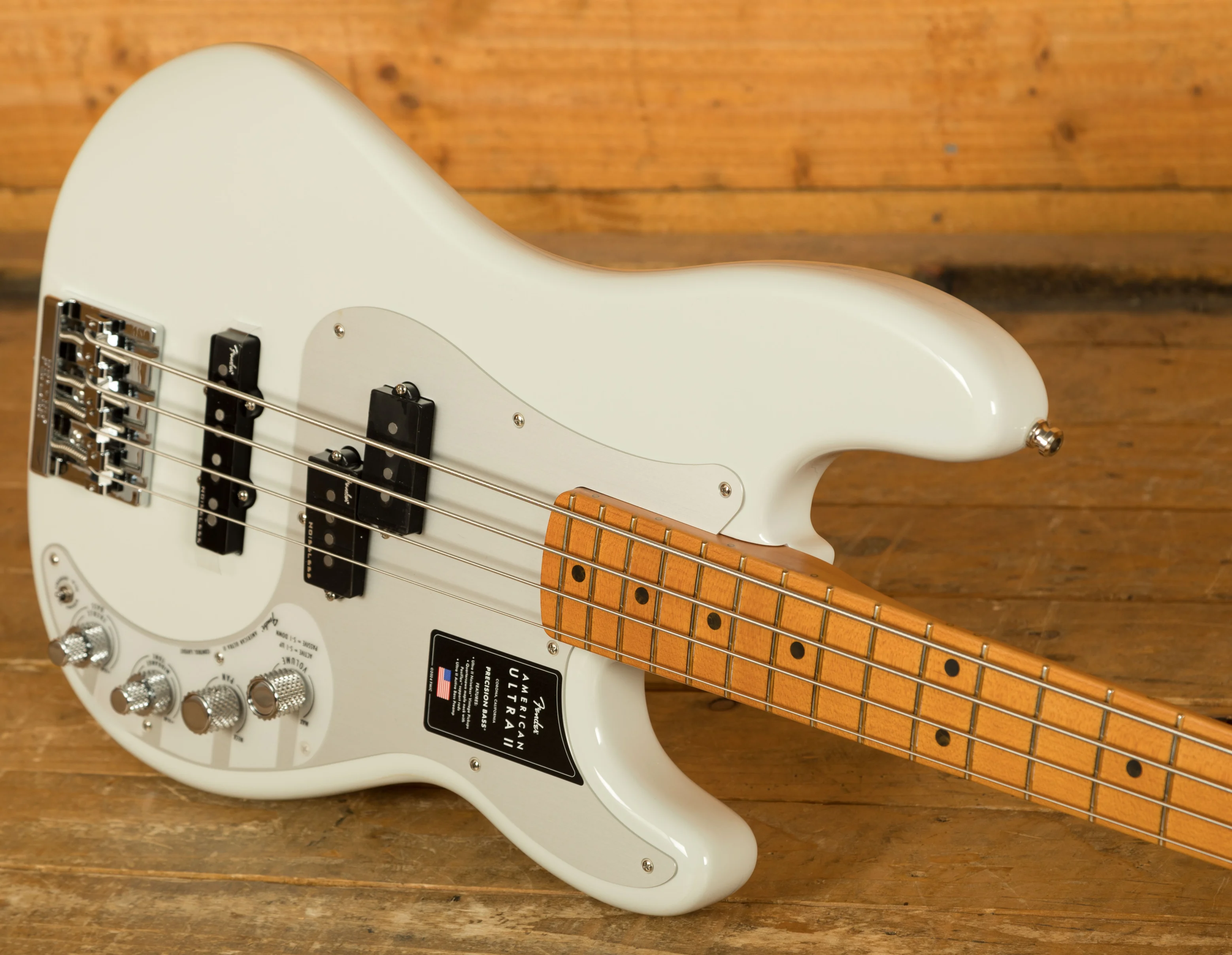 The American Ultra II Precision Bass's quartersawn maple fingerboard features a 10"-14" compound radius, transitioning from a rounded profile near the nut to a flatter surface higher up, providing both comfort and precision for technical playing. The Ultra rolled edges and smooth satin finish create an effortless feel. Additionally, Luminlay side dots, which glow in the dark, ensure visibility in low-light environments, making it easier to navigate the fingerboard on dark stages.