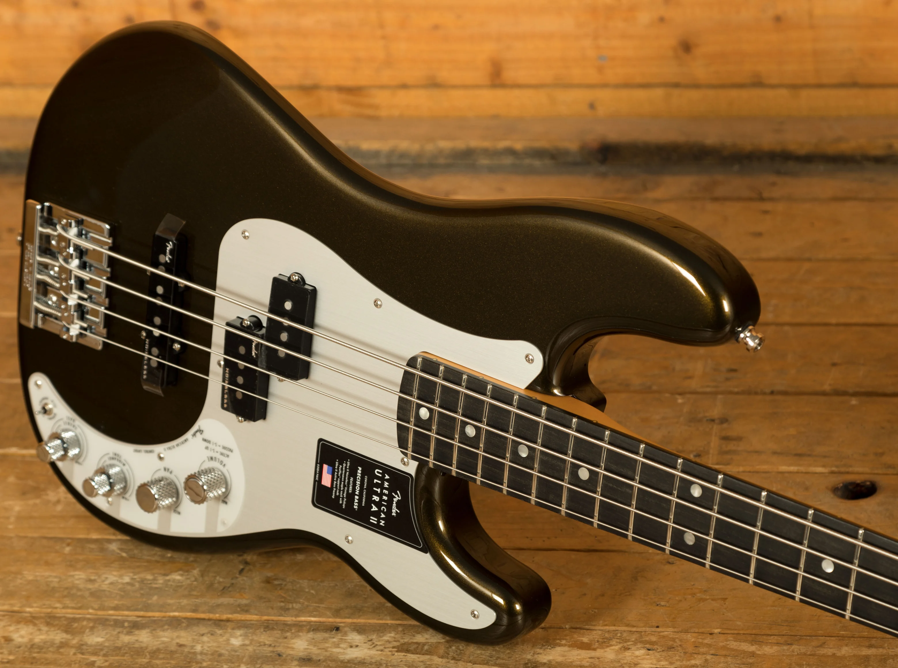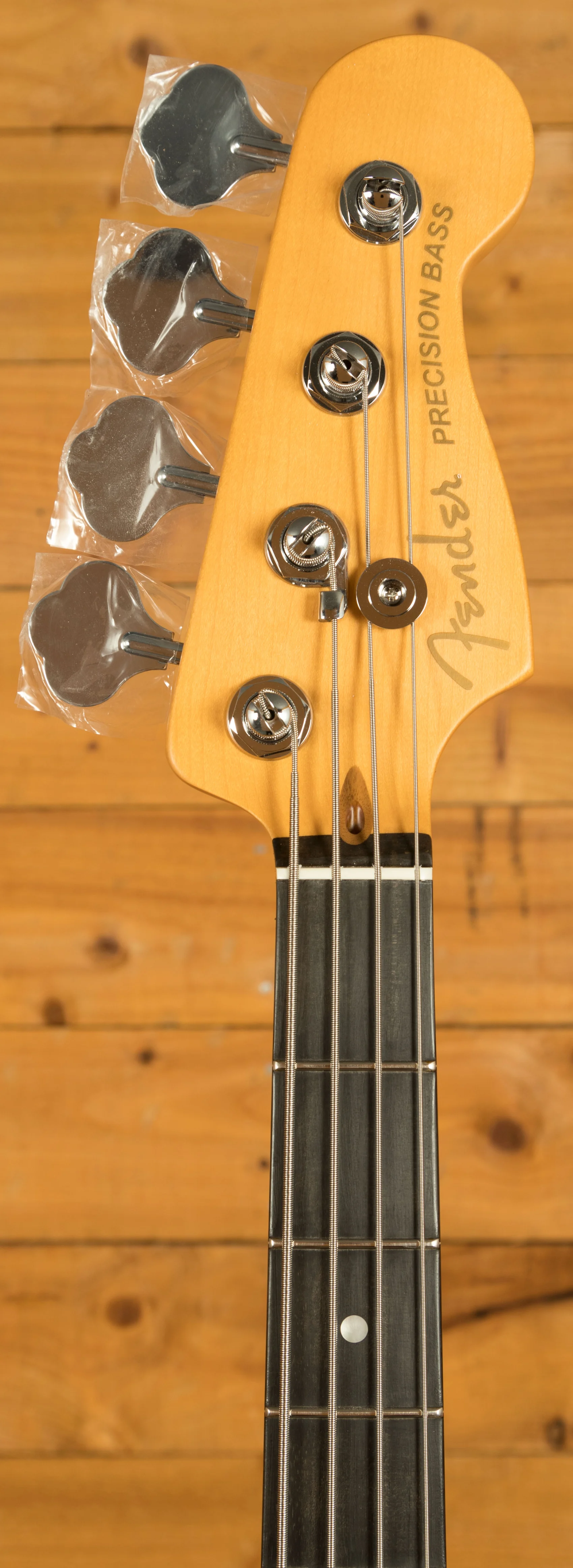 The American Ultra II Precision Bass's ebony fingerboard features a 10"-14" compound radius, transitioning from a rounded profile near the nut to a flatter surface higher up, providing both comfort and precision for technical playing. The Ultra rolled edges and smooth satin finish create an effortless feel. Additionally, Luminlay side dots, which glow in the dark, ensure visibility in low-light environments, making it easier to navigate the fingerboard on dark stages.