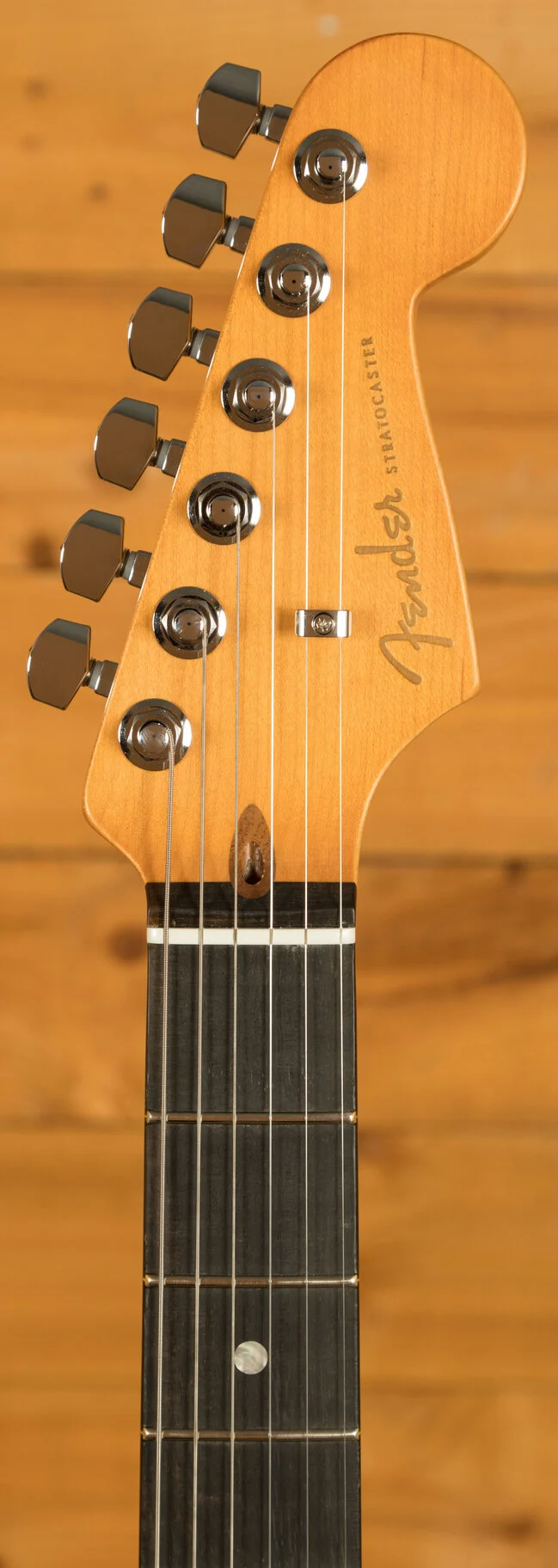 The ebony fingerboard of the American Ultra II Stratocaster HSS is designed for speed and precision. With a compound radius of 10"-14", the fingerboard transitions from a rounded shape near the nut to a flatter surface near the upper frets, allowing for faster playing and easier bends. The rolled fingerboard edges offer extra comfort, while Luminlay side dots provide superior visibility in low-light environments. These features enhance playability, making this guitar perfect for fast, technical playing.
