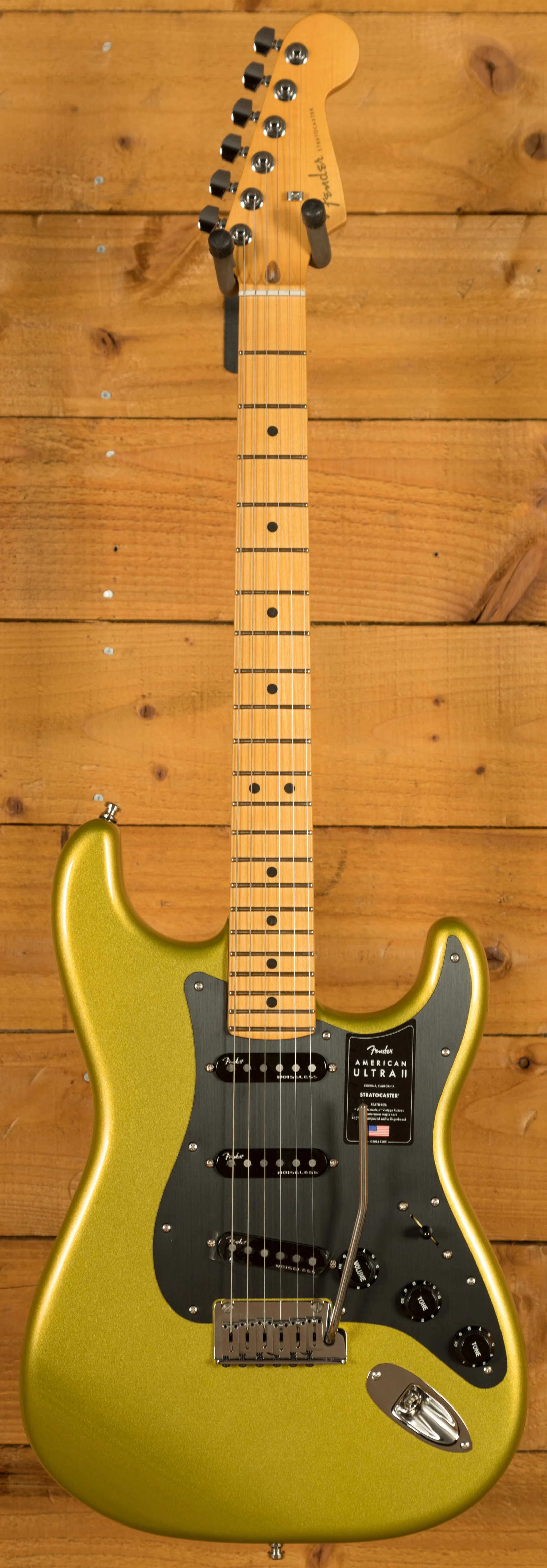 The Ultra II Noiseless Vintage pickups offer authentic Fender tone without the unwanted hum, delivering a clean, bright sound. The advanced electronics include the S-1 switch, which adds versatility by allowing you to activate the neck pickup in any position. Combined with the treble bleed circuit, your tone remains crisp even at lower volumes. Additionally, the American Ultra II Stratocaster's synchronised tremolo system and short post locking tuners provide superior tuning stability, quick string changes, and an overall seamless playing experience.