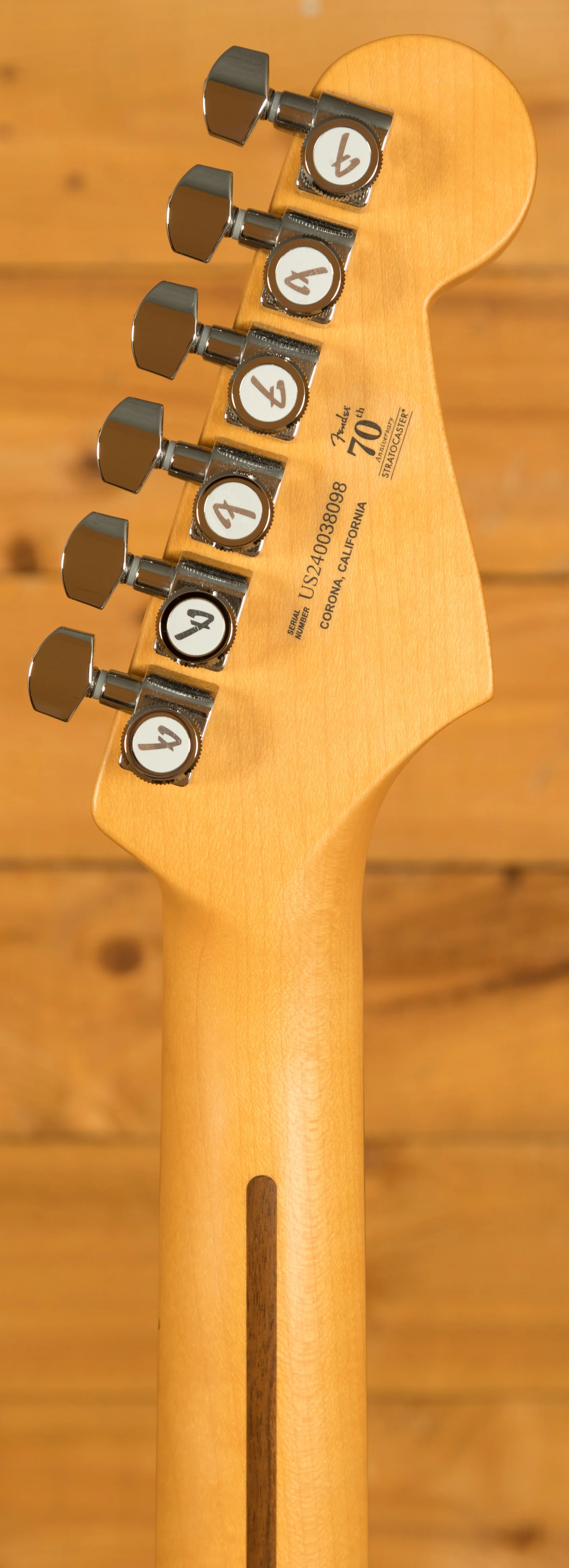 The Ultra II Noiseless Vintage pickups offer authentic Fender tone without the unwanted hum, delivering a clean, bright sound. The advanced electronics include the S-1 switch, which adds versatility by allowing you to activate the neck pickup in any position. Combined with the treble bleed circuit, your tone remains crisp even at lower volumes. Additionally, the American Ultra II Stratocaster's synchronised tremolo system and short post locking tuners provide superior tuning stability, quick string changes, and an overall seamless playing experience.