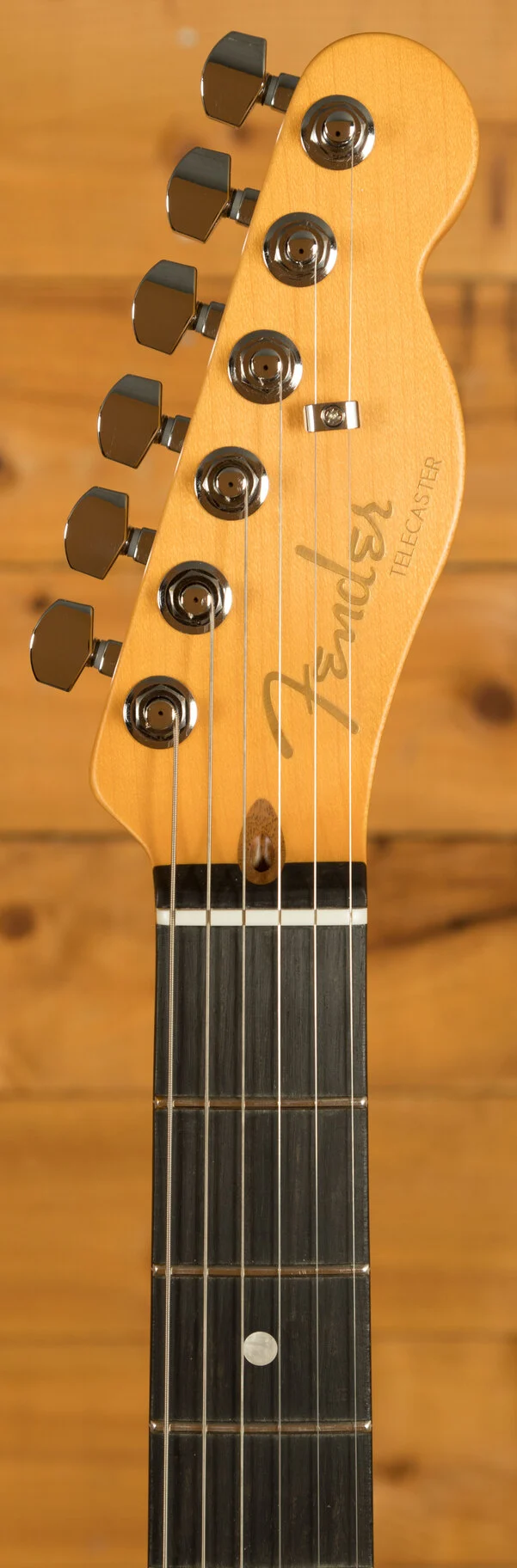 The American Ultra II Telecaster also features a compound-radius ebony fingerboard that starts with a more rounded 10" radius near the nut and flattens out to a 14" radius as you move up the neck. This design makes chording easier at the lower frets and allows for faster, smoother lead playing higher up. Additional features like Luminlay side dots ensure visibility on dark stages, and the ultra-rolled fingerboard edges enhance comfort for a seamless playing experience.