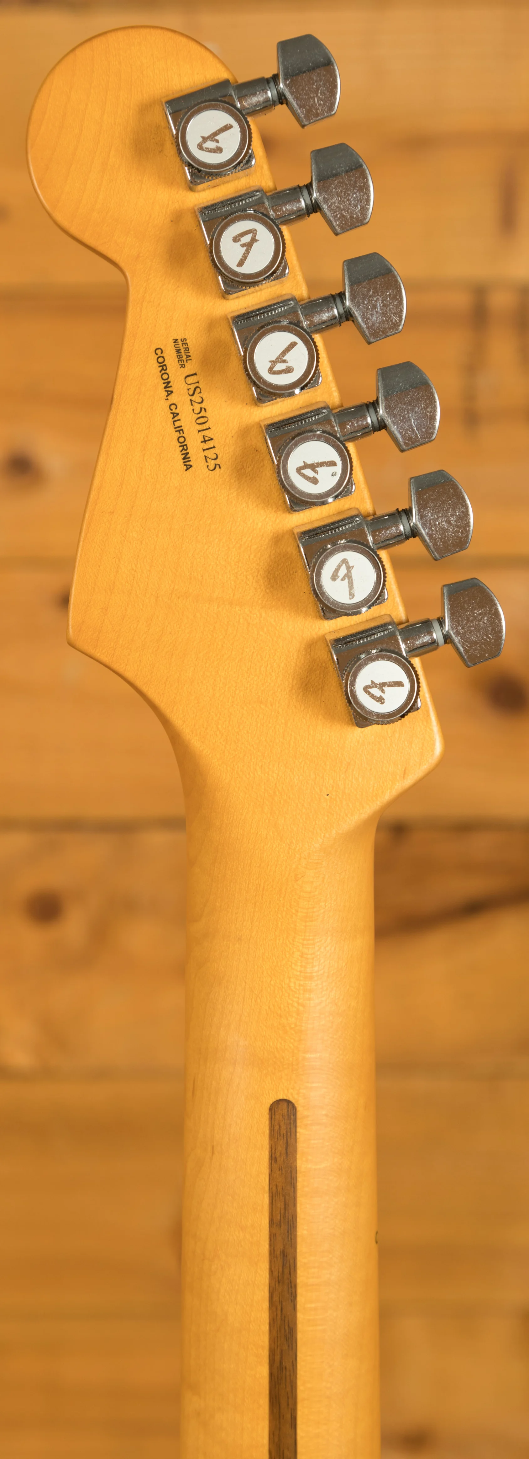 At the heart of its tone, the guitar features Pure Vintage '57 Strat single-coil pickups, meticulously designed to capture the unmistakable clarity, chime, and warmth of vintage Fender instruments. These pickups use period-correct materials, such as cloth-covered wire and fibre bobbins, to deliver authentic tonal character. The onboard electronics include an S-1 switch on the volume knob, which adds the neck pickup when in position 1 and 2 of the pickup selector, while a treble bleed circuit ensures that high frequencies are preserved when rolling back the volume.