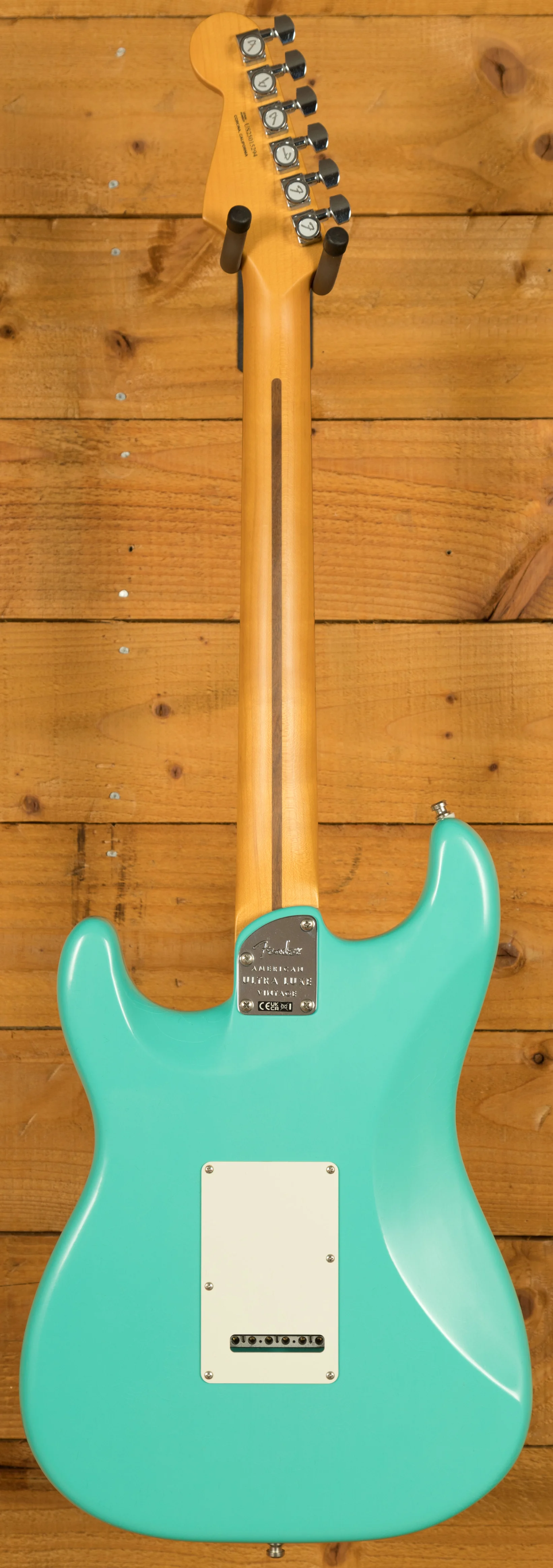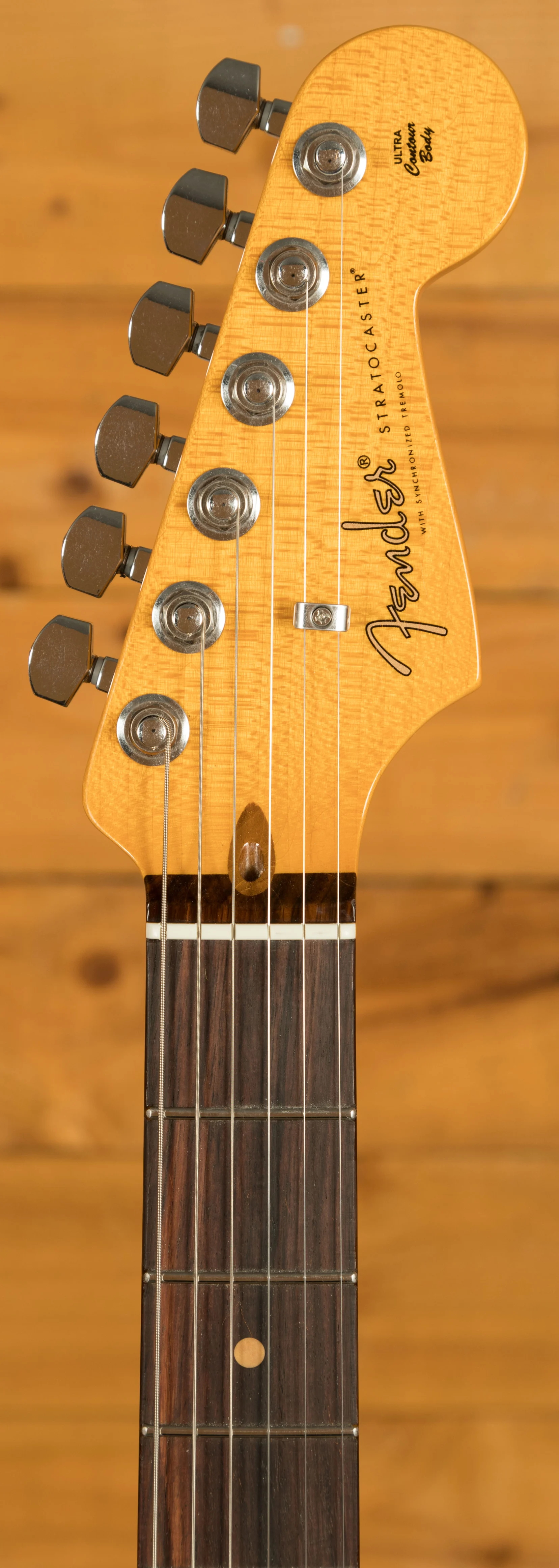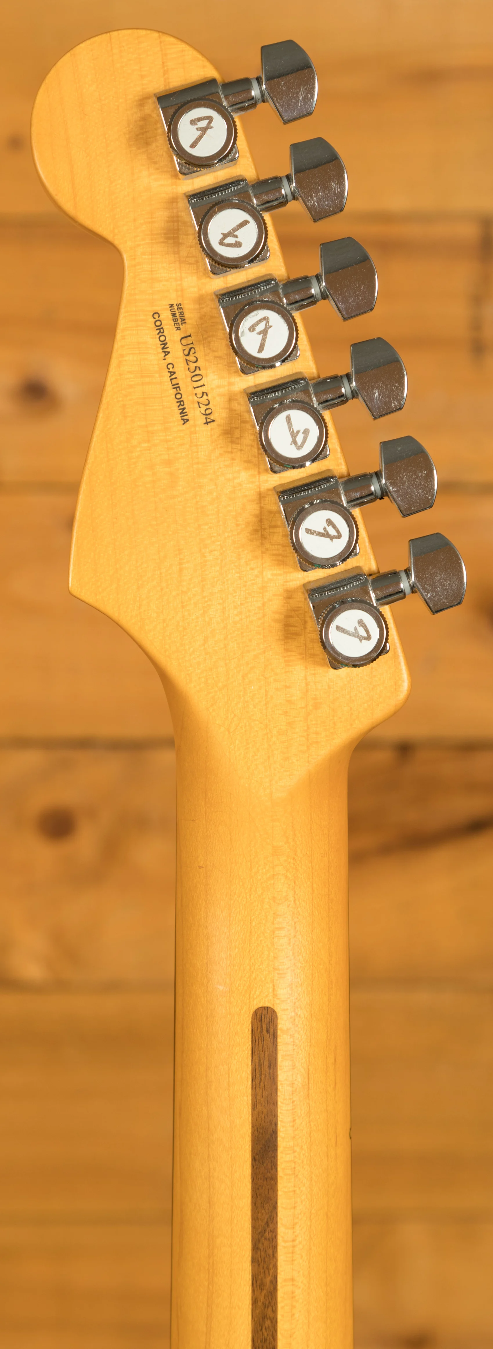 The guitar features a premium 2-point American Ultra synchronised tremolo system with stainless steel saddles and a cold-rolled steel block for improved sustain and tuning stability. The pop-in tremolo arm offers adjustable resistance, allowing for smooth vibrato or tight control based on player preference. Paired with locking tuners and a Graph Tech TUSQ nut, this hardware ensures precise tuning and quick string changes, making it ideal for both stage reliability and studio precision.