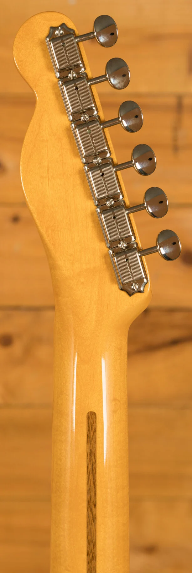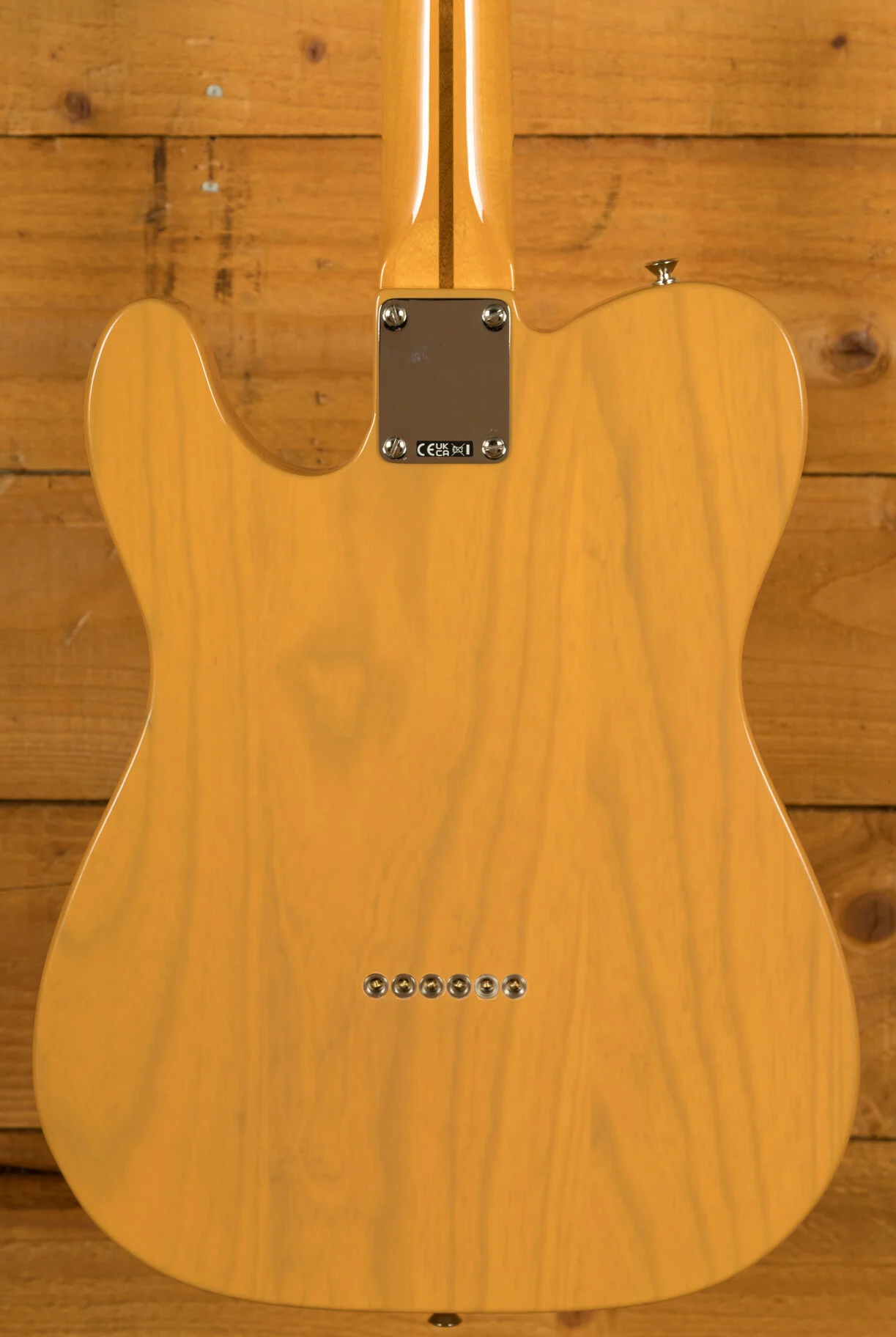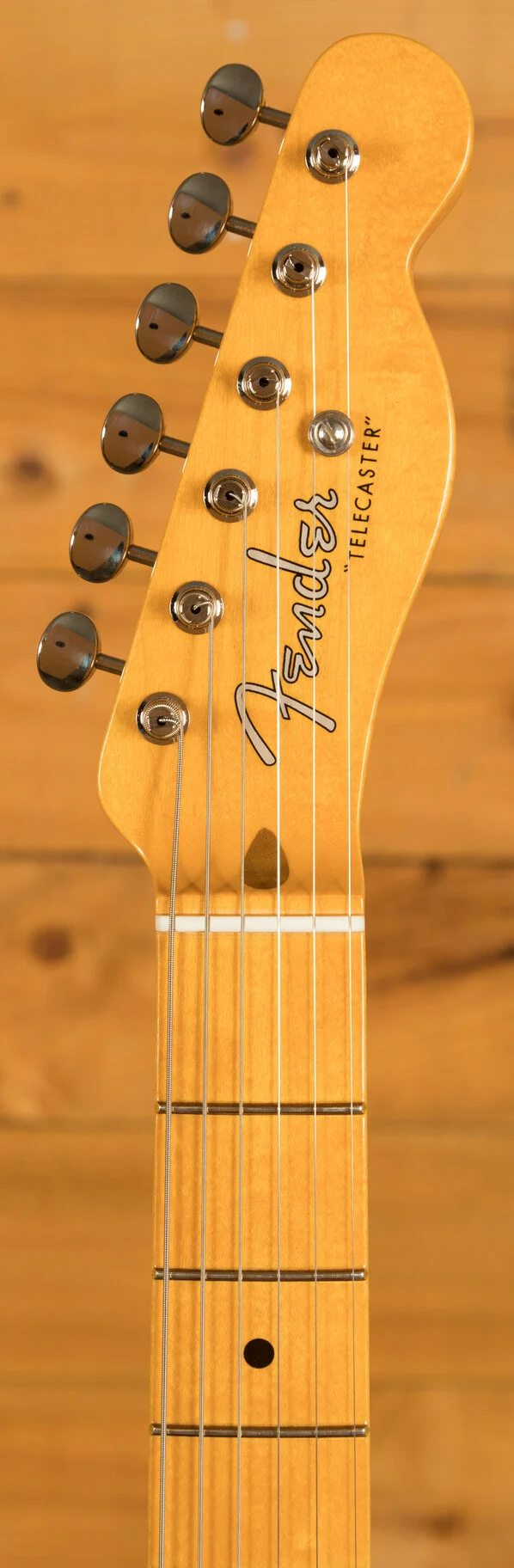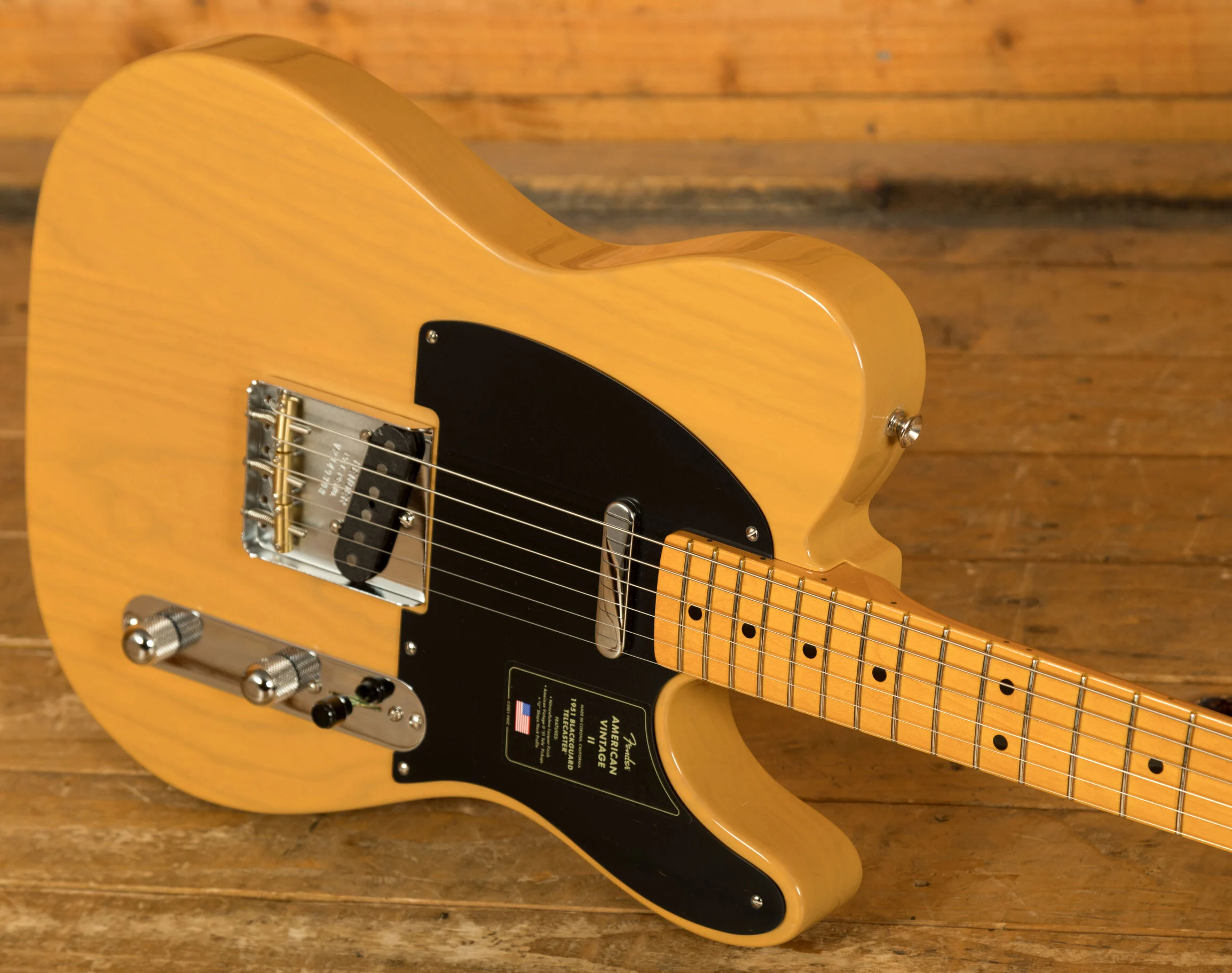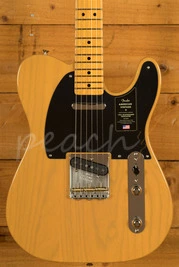 The American Vintage II 1951 Telecaster features an ash body finished in Butterscotch Blonde to capture the tone and look of the original. The substantial '51 'U'-shaped hard rock maple neck plays like a dream with a 7.25" radius fingerboard and vintage tall frets. Characteristic of production in 1951, the 12th fret face-dot spacing is narrow and the sole Phillips-head fastener on the guitar is at the truss rod nut. The triple brass saddle bridge, single-line 'Fender Deluxe' tuners and Pure Vintage '51 Telecaster pickups deliver classic twang and authentic Fender style.