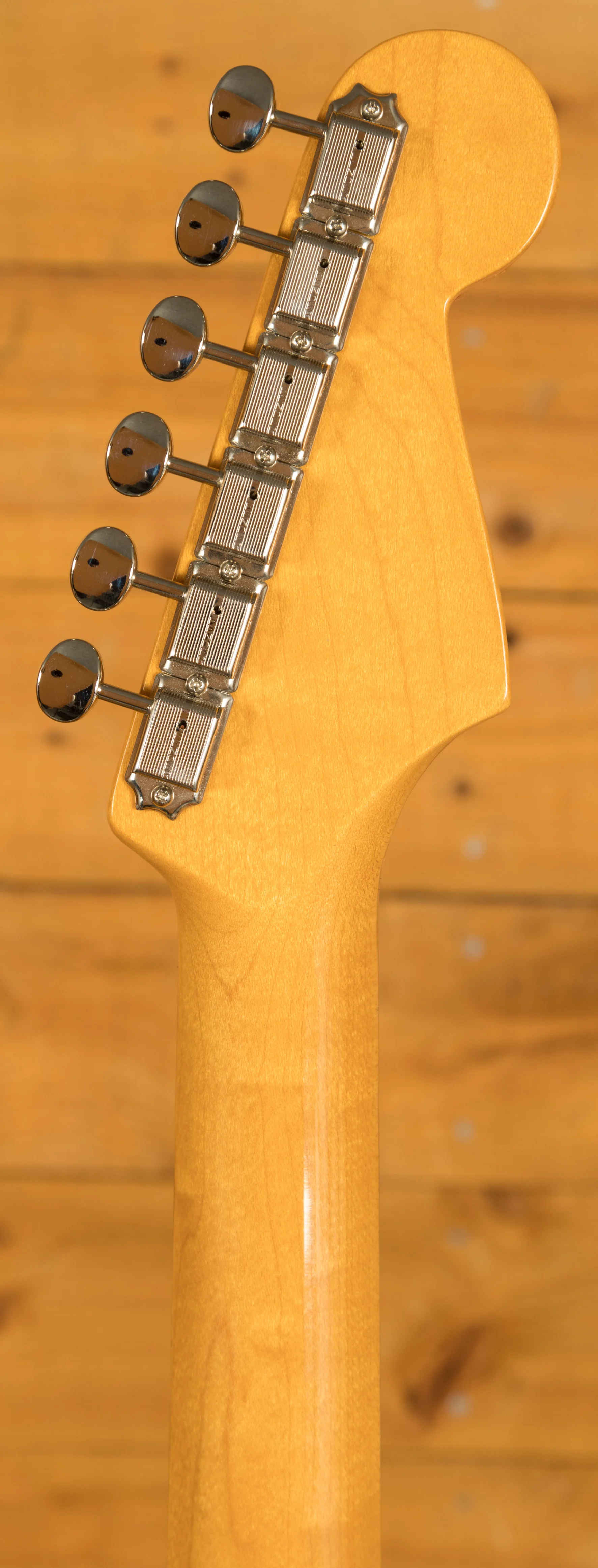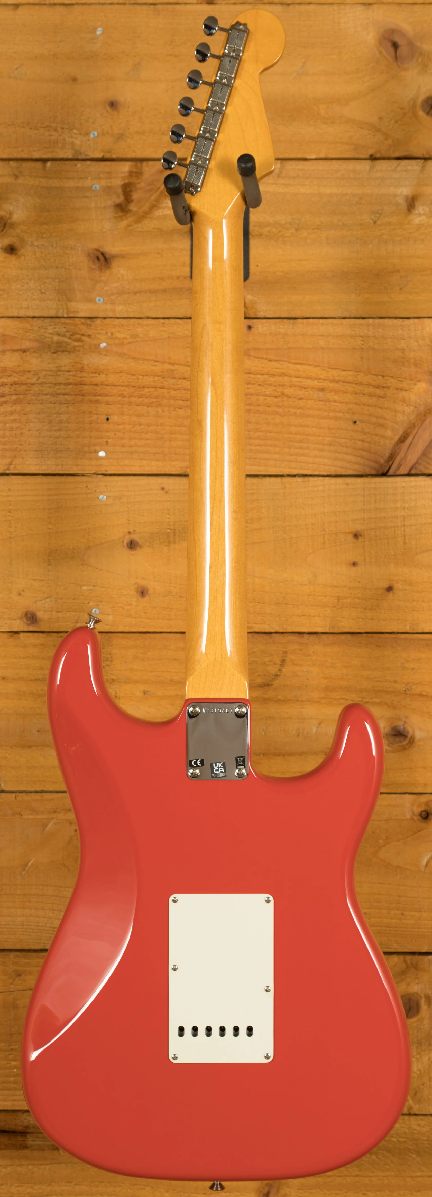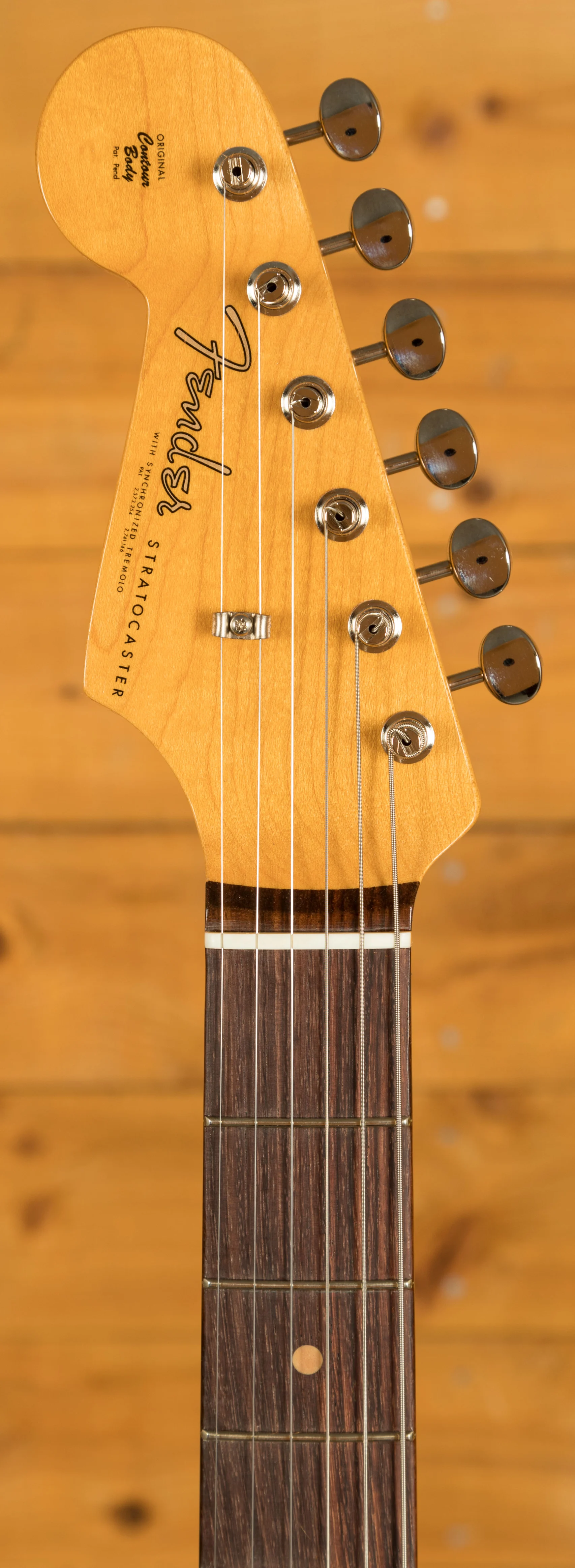 During the late '50s and early '60s, the popularity of Fender musical instruments flourished, and although the Fender assortment had expanded to include many great new instruments, the Stratocaster reigned supreme. By 1961, the Stratocaster had taken on a more refined aesthetic, with a 3-Colour Sunburst reformulated with a more vibrant red and bolder black edge, topped with a 3-ply pickguard accenting the Strat's signature curves.