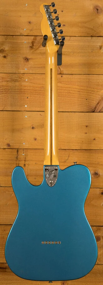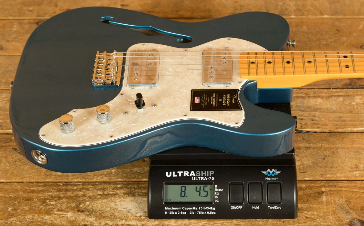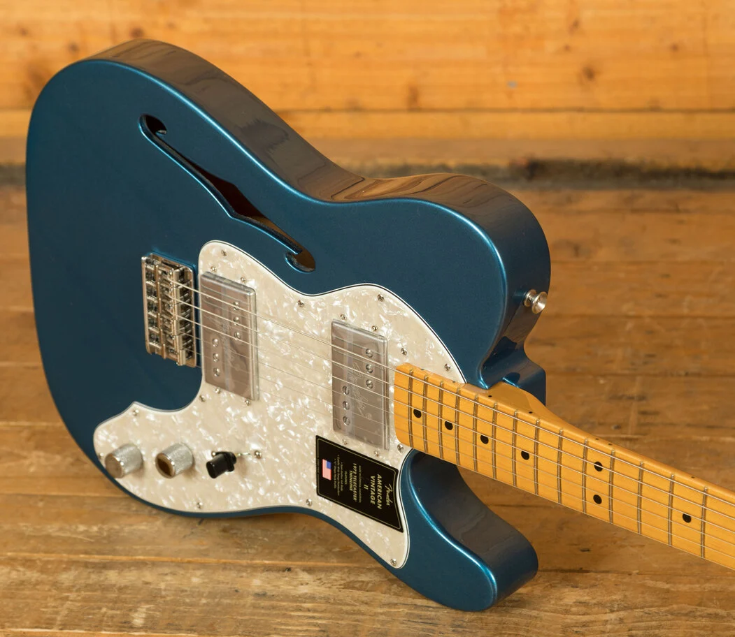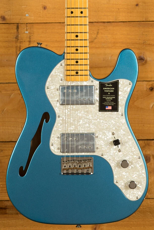 Featuring a 'C'-shape hard rock maple neck, the American Vintage II 1972 Telecaster Thinline plays like a dream with a 7.25" radius fingerboard and vintage tall frets. To create authentic Wide-Range humbucking pickups, Fender resurrected CuNiFe magnets, an essential element in recreating the sonics of the originals. Characteristic of production in 1972, this Thinline is outfitted with a convenient "Bullet" style truss rod nut, three-bolt neck plate with Micro-Tilt mechanism, 'F' stamped tuners, 6-saddle string-through body hardtail with bent steel saddles and offered in Lake Placid Blue over a semi-hollow ash body.