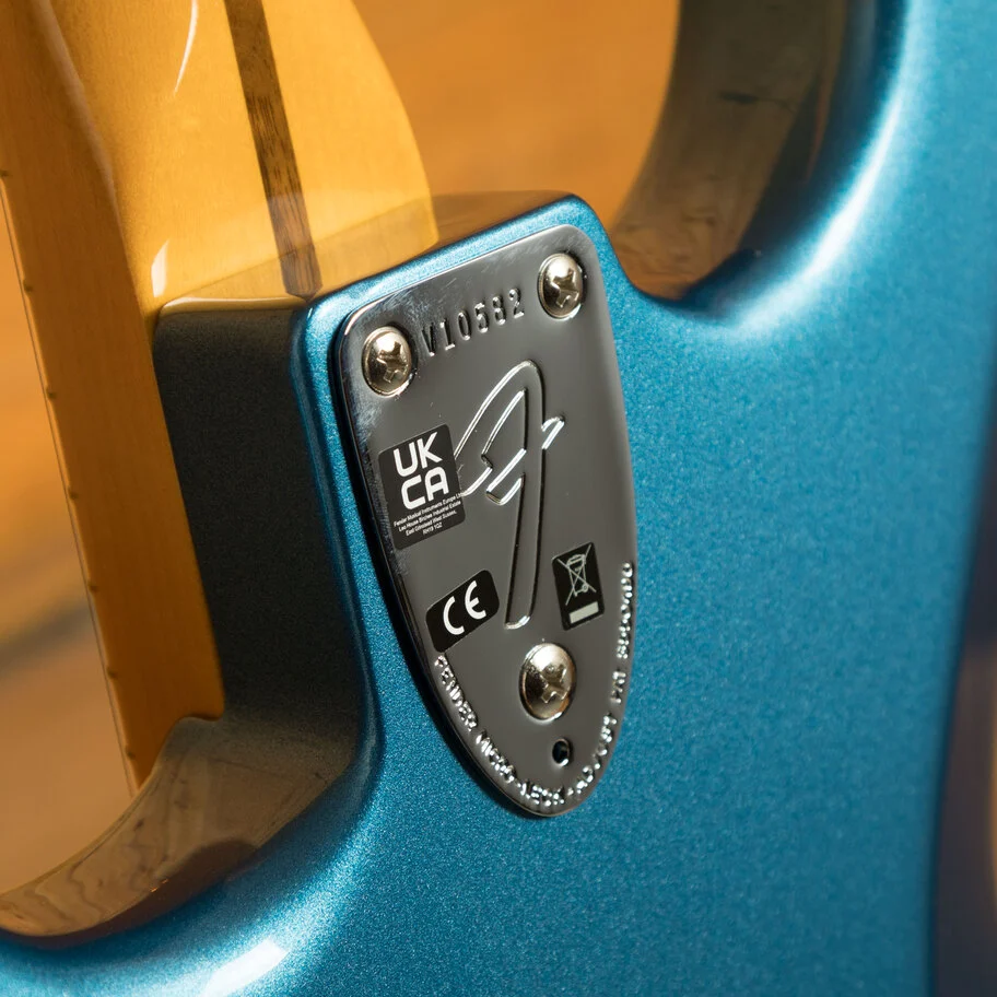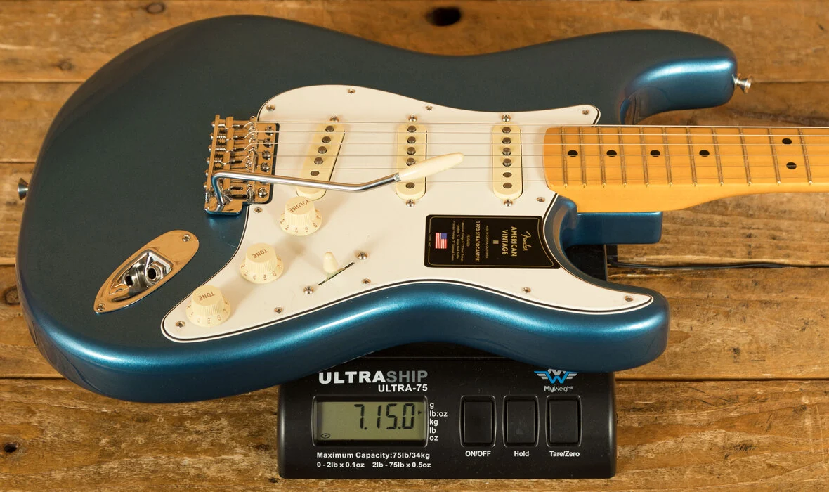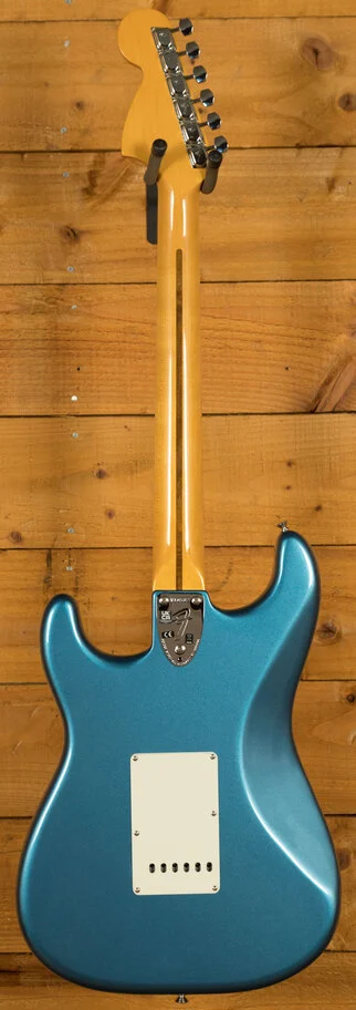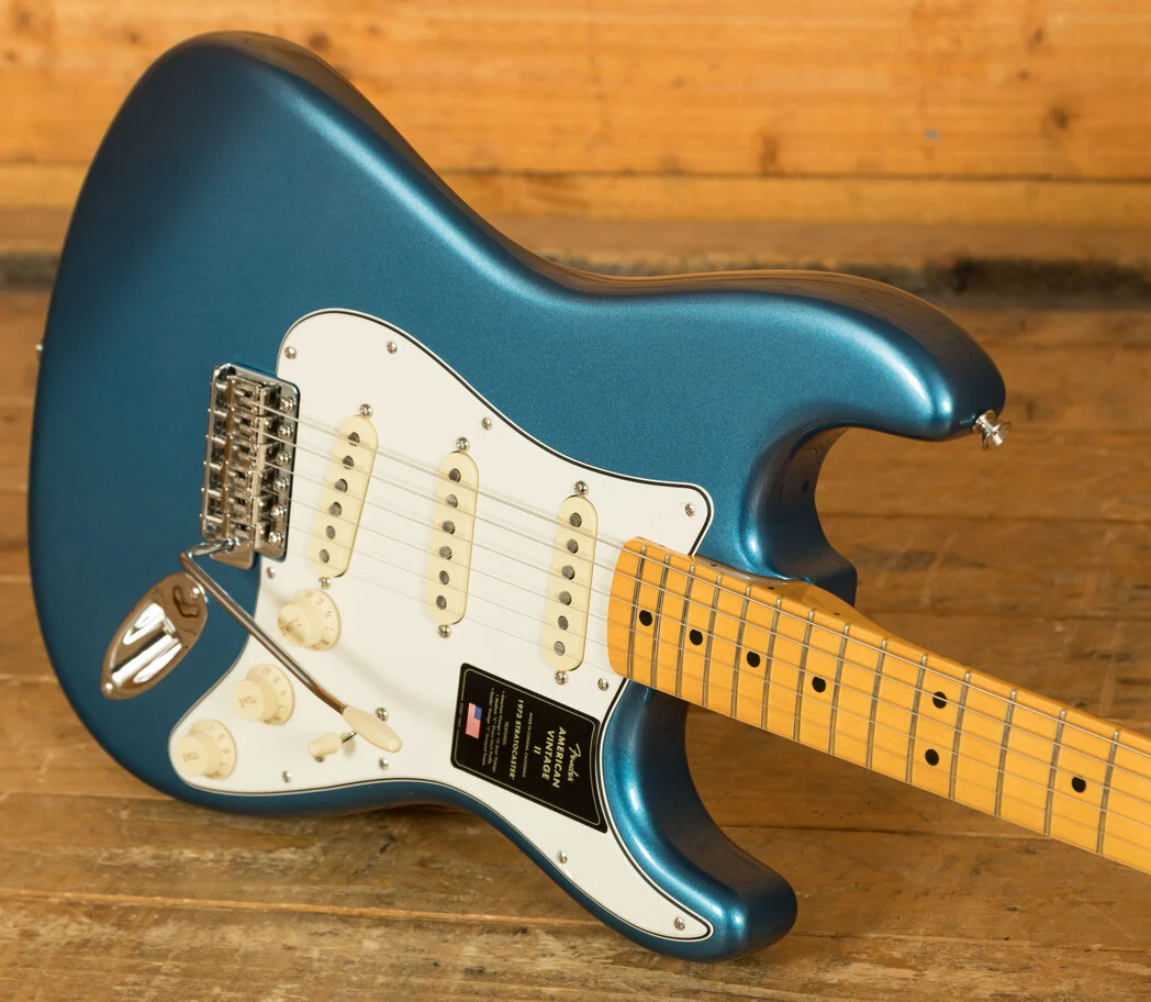 The American Vintage II 1973 Stratocaster exudes the spirit of the era and is outfitted with a trio of Pure Vintage '73 staggered pole pickups, a large headstock with dual string trees, a convenient 'Bullet' style truss rod nut and a three-bolt neck plate with Micro-Tilt mechanism. The 'C'-shape maple neck plays like a dream with a 7.25" radius maple fingerboard and vintage tall frets. The guitar is offered in the classic Lake Placid Blue over ash. Additional features include vintage-style 'F' stamped tuners and a synchronised tremolo with bent steel saddles and cold rolled steel block.