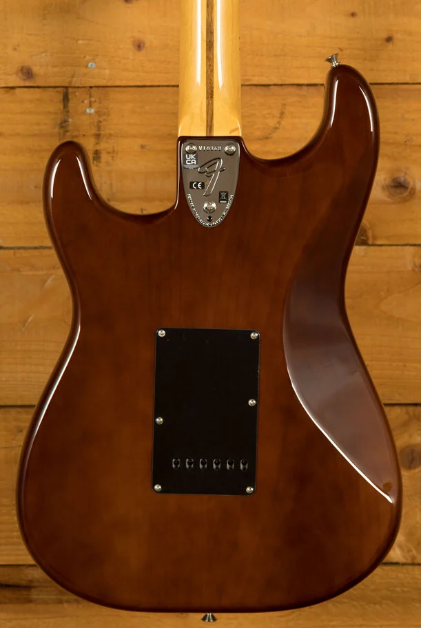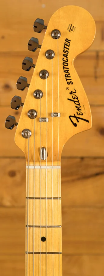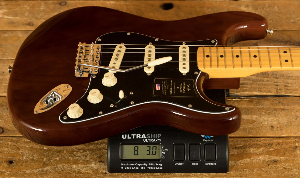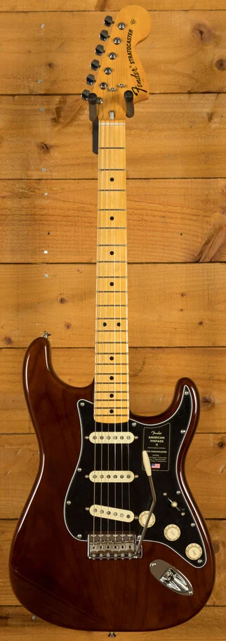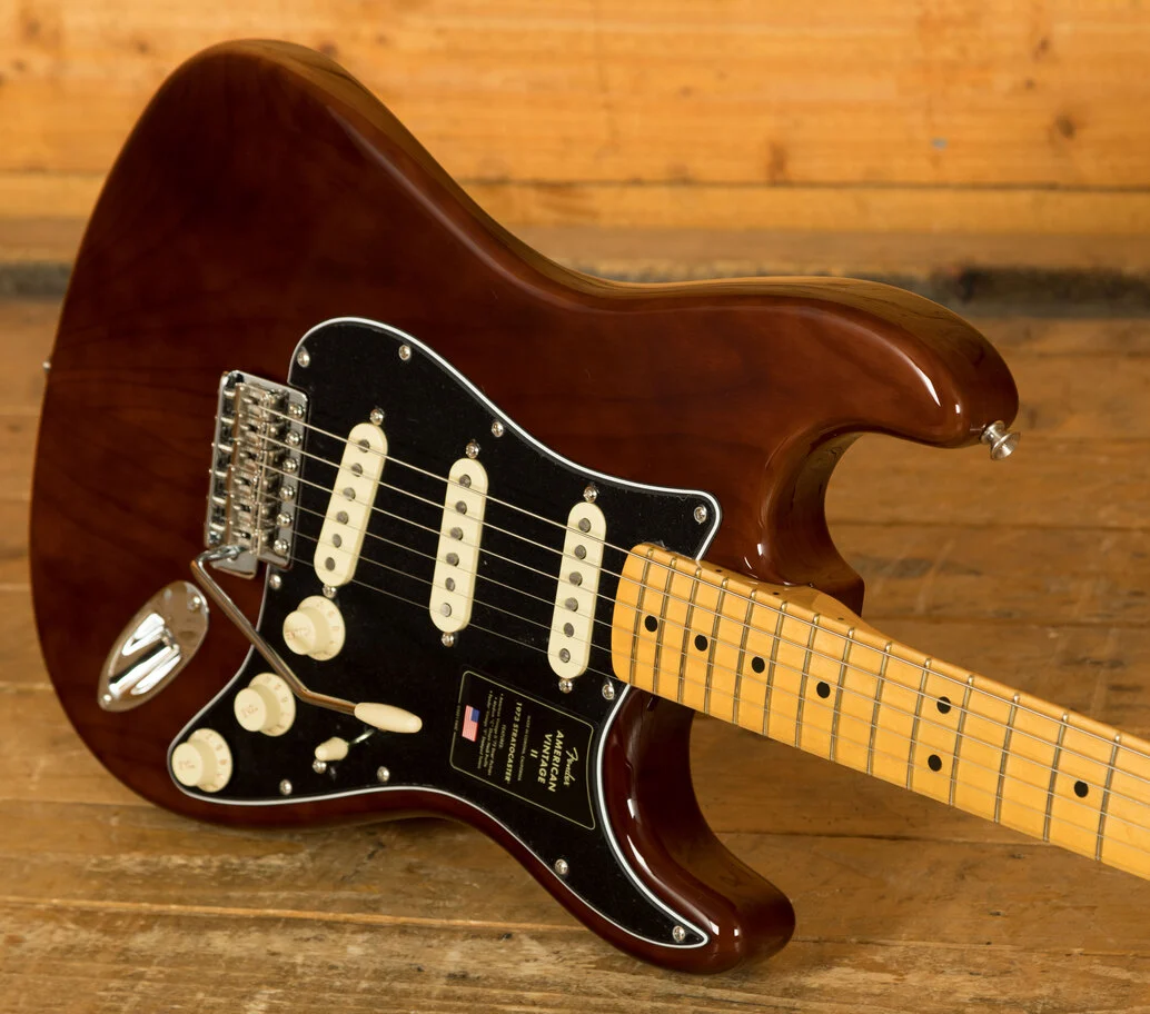 The American Vintage II 1973 Stratocaster exudes the spirit of the era and is outfitted with a trio of Pure Vintage '73 staggered pole pickups, a large headstock with dual string trees, a convenient 'Bullet' style truss rod nut and a three-bolt neck plate with Micro-Tilt mechanism. The 'C'-shape maple neck plays like a dream with a 7.25" radius maple fingerboard and vintage tall frets. The guitar is offered in the classic Mocha over ash - the first custom colour ever to feature a black pickguard on a Strat. Additional features include vintage-style 'F' stamped tuners and a synchronised tremolo with bent steel saddles and cold rolled steel block.