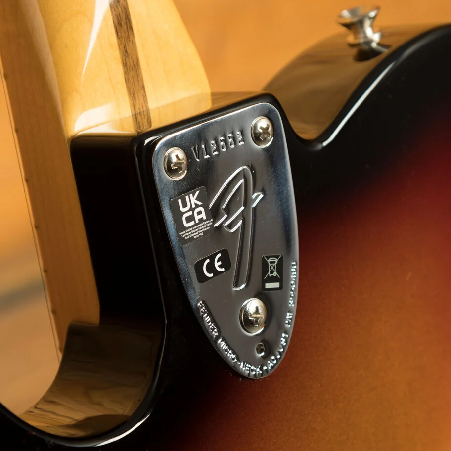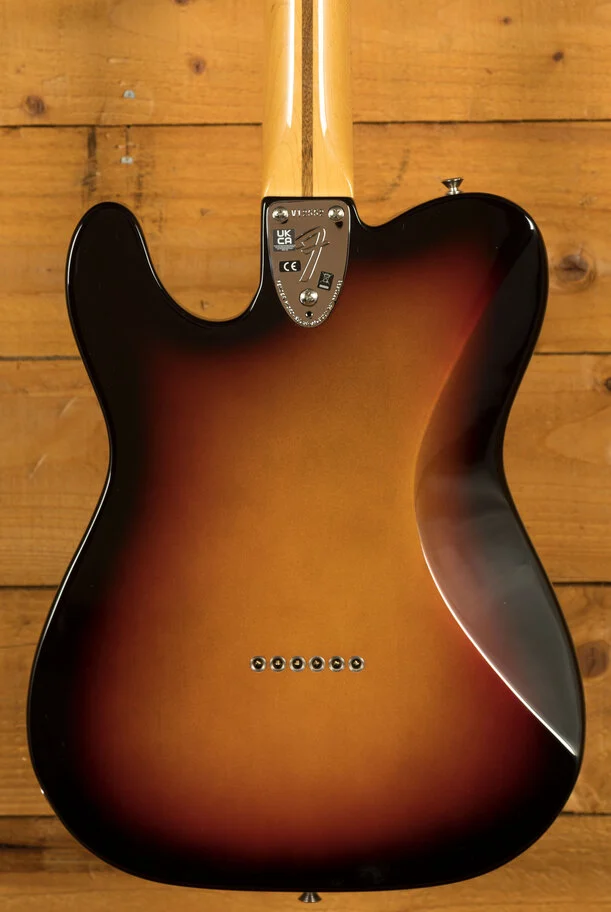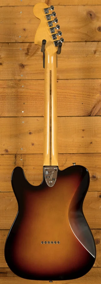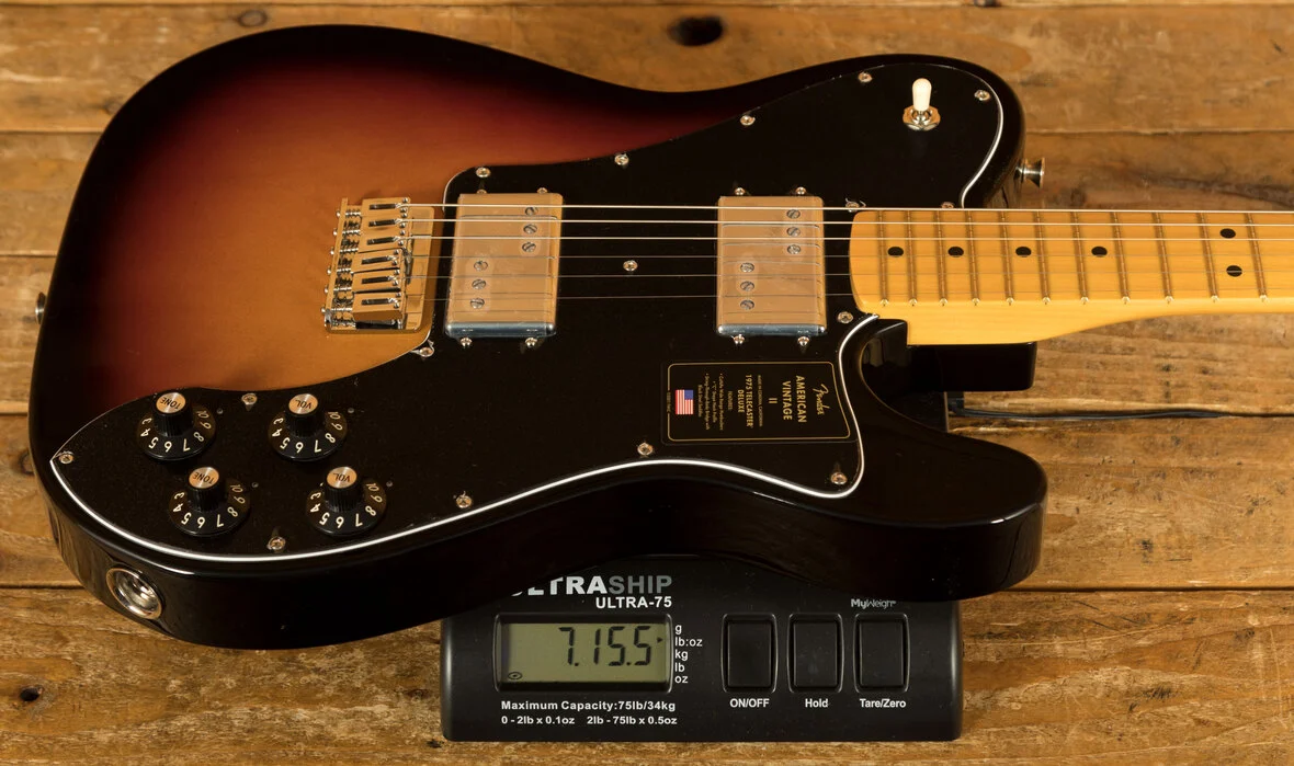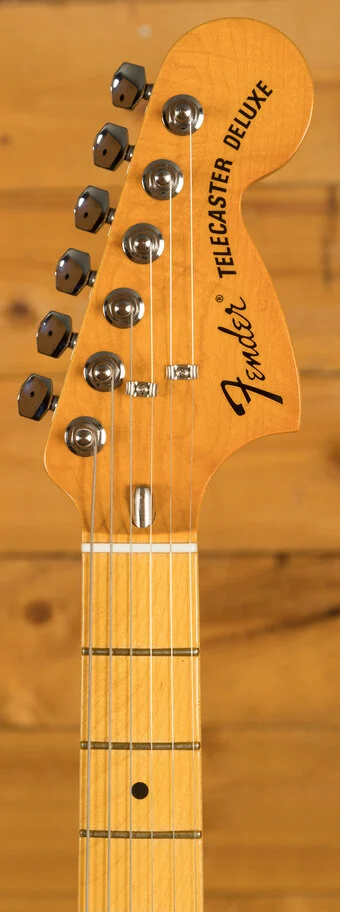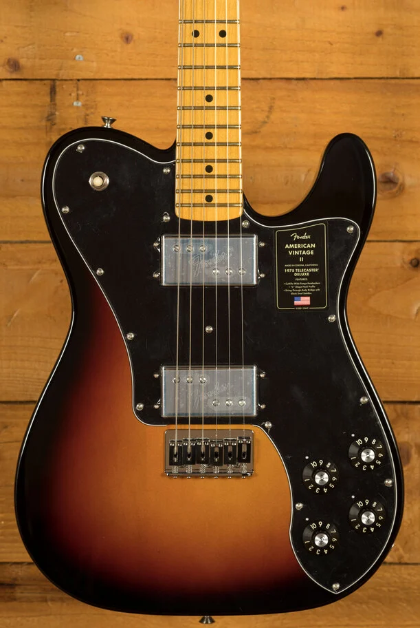 Featuring a '75 'C'-shape hard rock maple neck, the American Vintage II 1975 Telecaster Deluxe plays like a dream with a 9.5" radius maple fingerboard and medium jumbo frets. Characteristic of production in 1975, this Telecaster is outfitted with a convenient "Bullet" style truss rod nut, three-bolt neck plate with Micro-Tilt mechanism and offered in 3-Colour Sunburst over an alder body. Other features include a 6-Saddle hardtail bridge with stainless steel block saddles and vintage-accurate Tele Deluxe tuners.