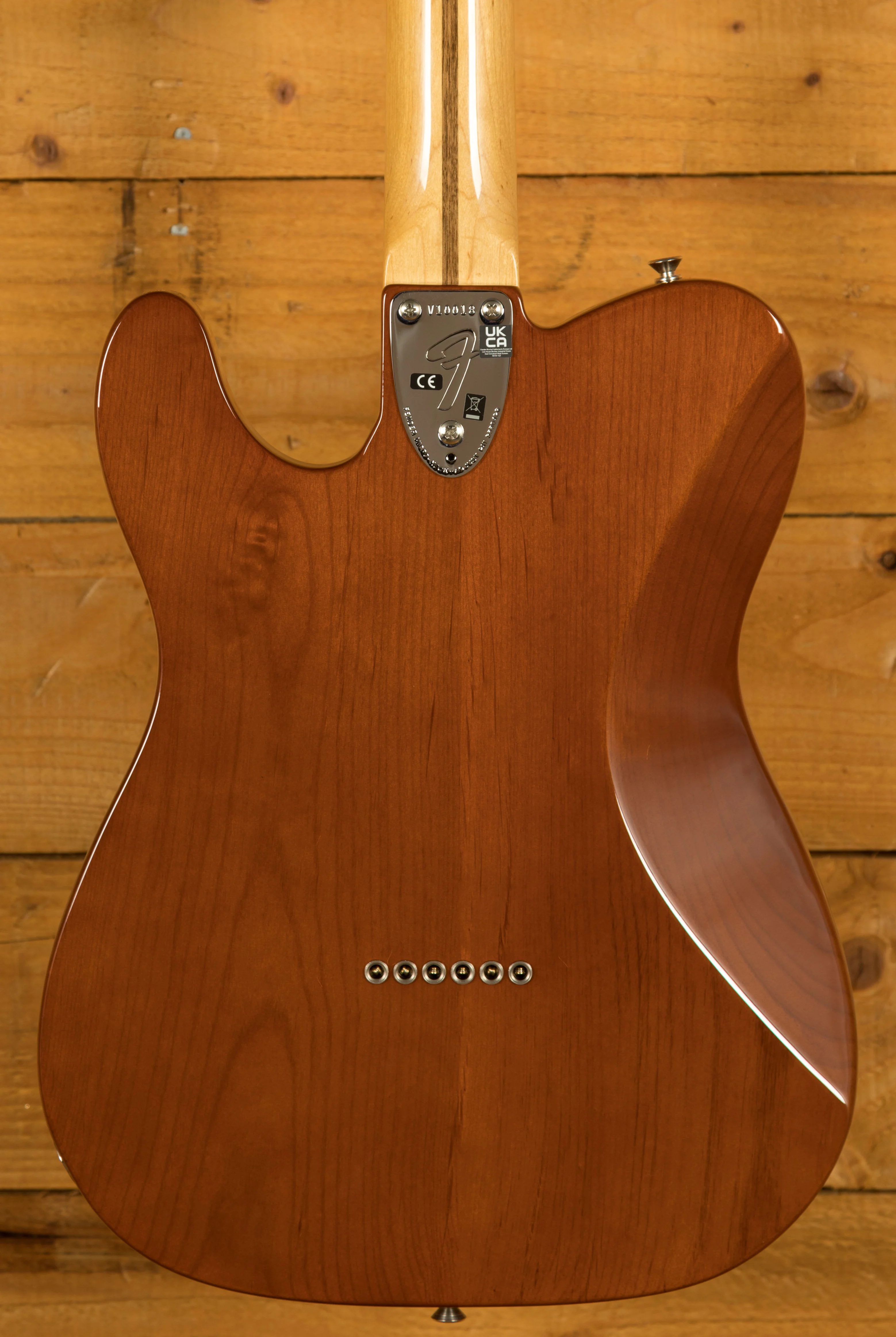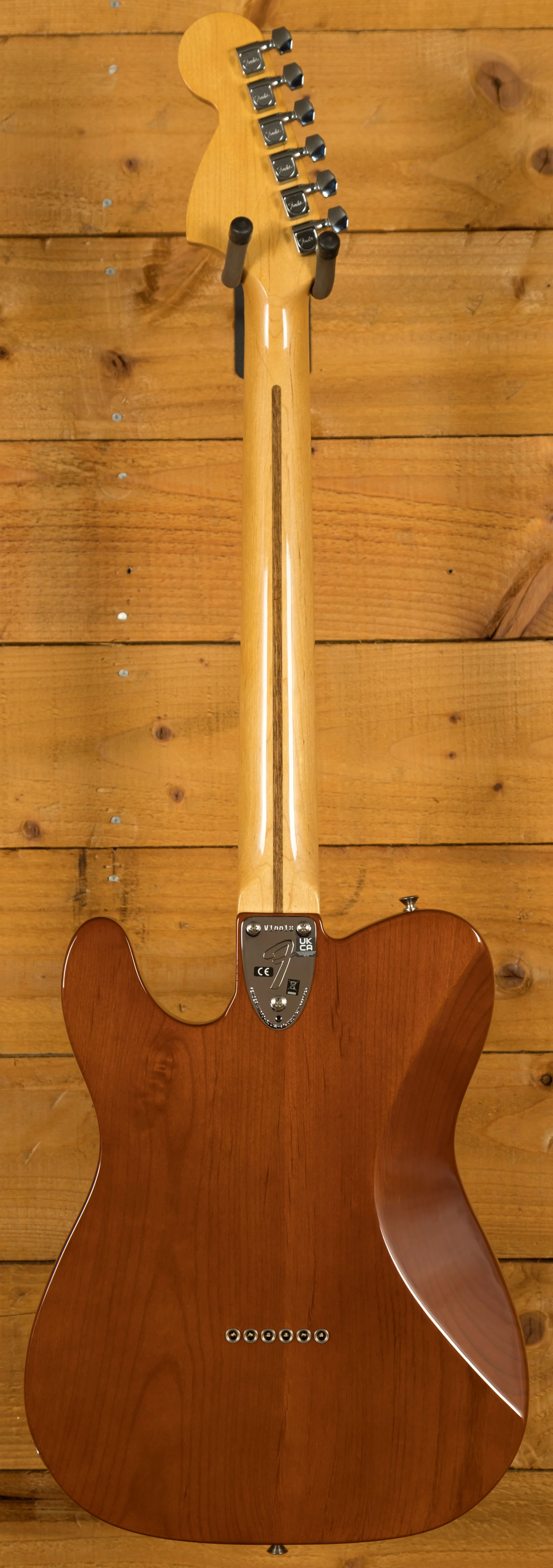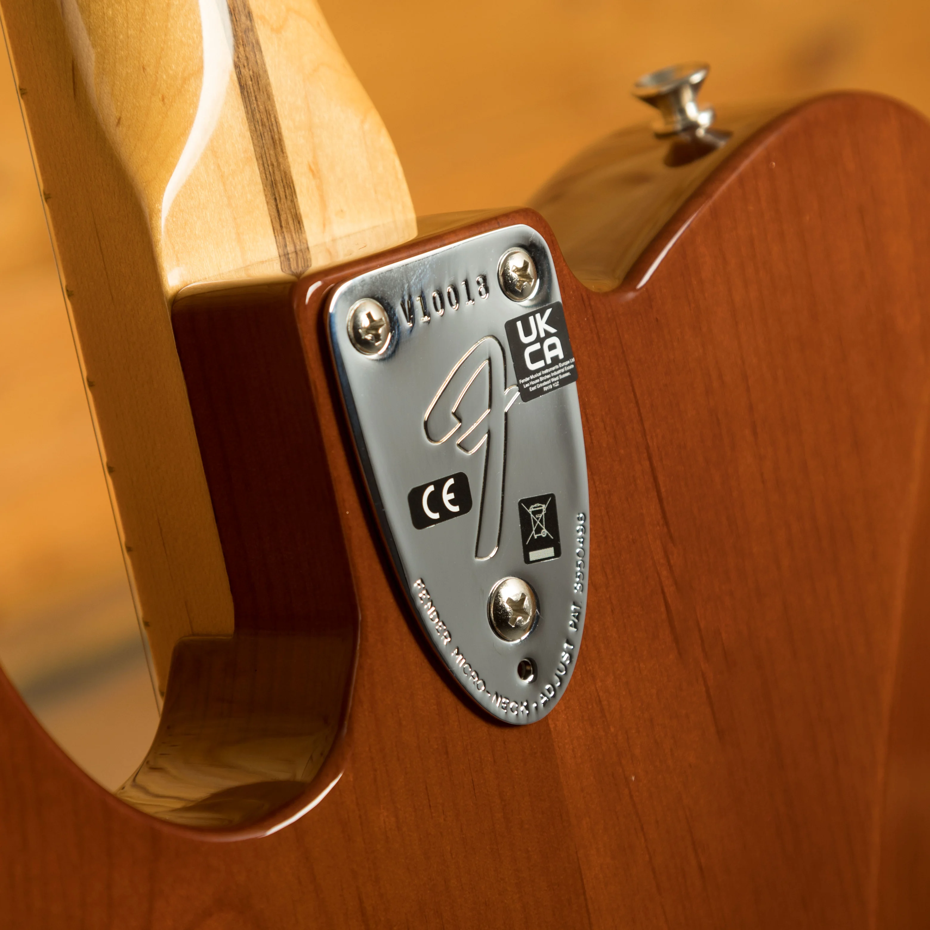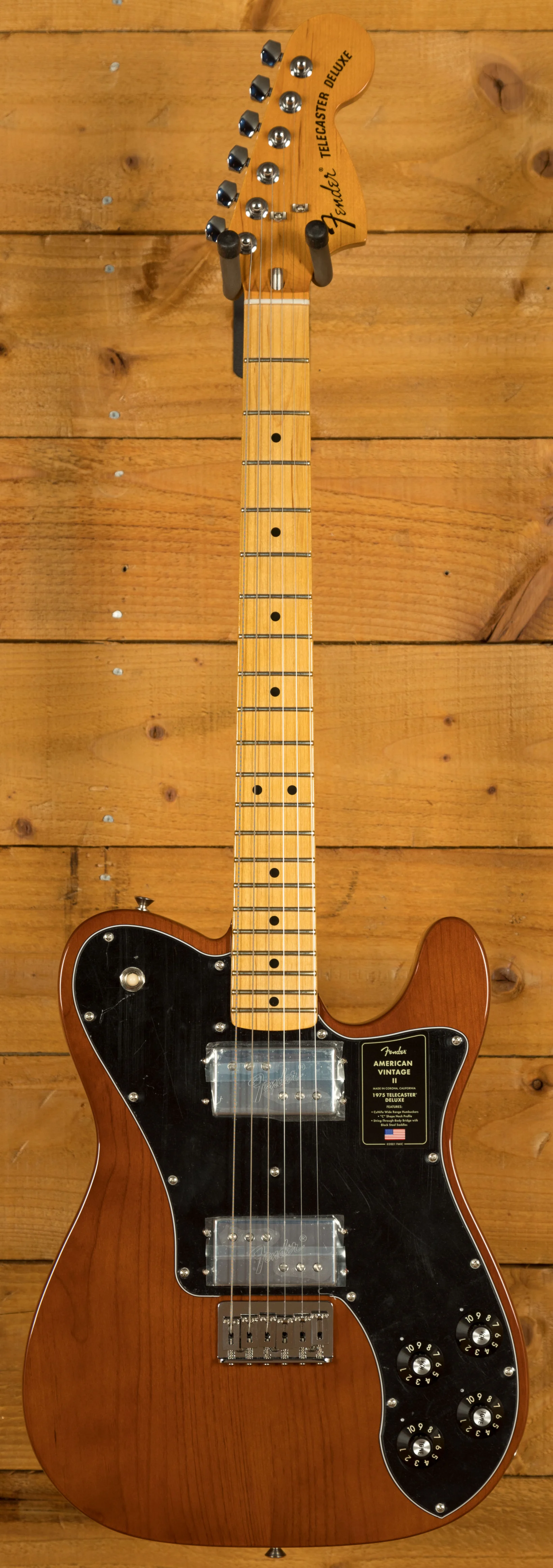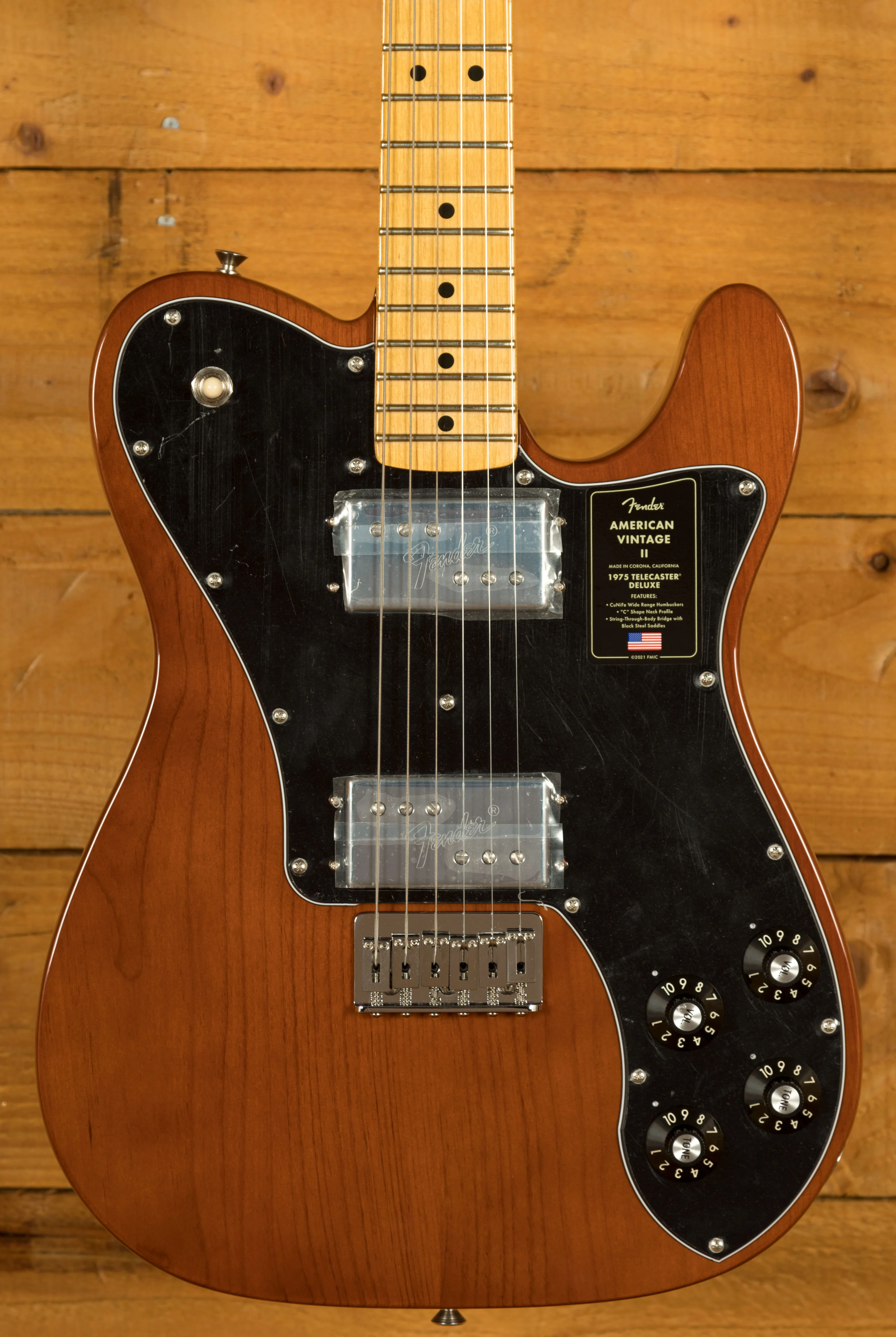 Featuring a '75 'C'-shape hard rock maple neck, the American Vintage II 1975 Telecaster Deluxe plays like a dream with a 9.5" radius maple fingerboard and medium jumbo frets. Characteristic of production in 1975, this Telecaster is outfitted with a convenient "Bullet" style truss rod nut, three-bolt neck plate with Micro-Tilt mechanism and offered in Mocha over an alder body. Other features include a 6-Saddle hardtail bridge with stainless steel block saddles and vintage-accurate Tele Deluxe tuners.