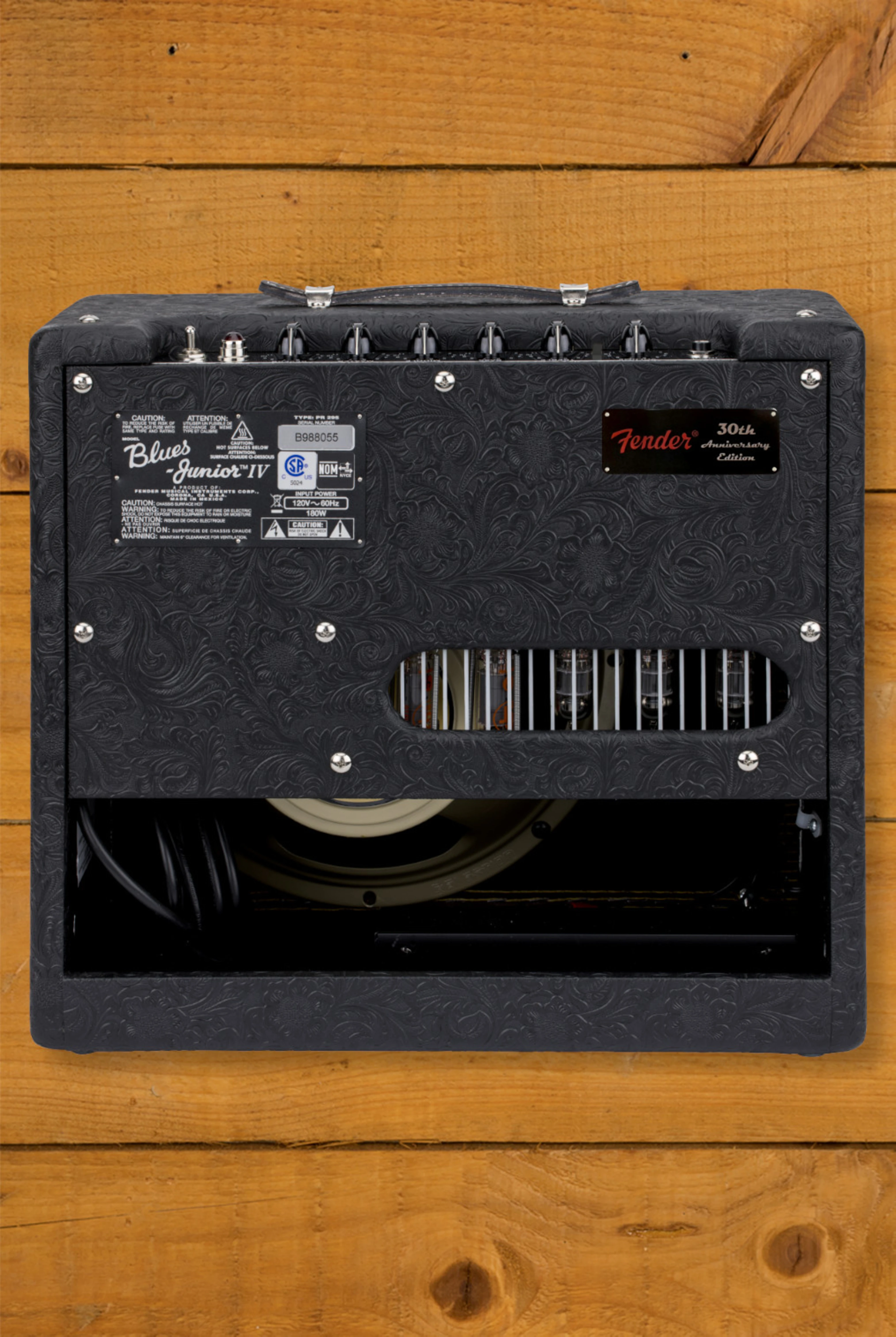 The Fender Blues Junior IV 30th Anniversary is a limited-edition tribute to one of the most recorded and gigged amps in Fender history. Dressed in a striking Black Western tooled vinyl covering with a vintage Bassman-style grille cloth, this version doesn't just sound great, it looks incredible on any stage or in any studio.