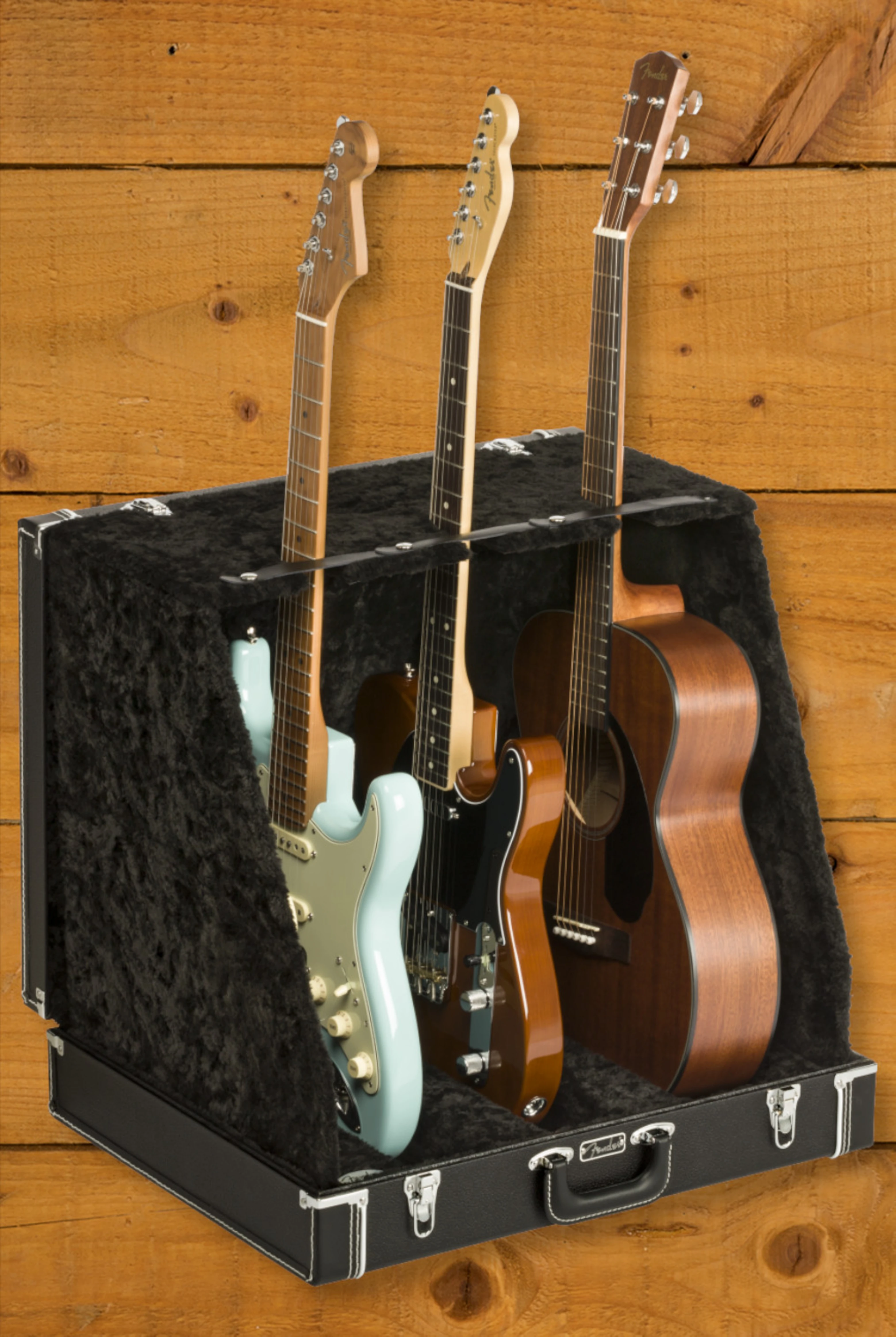 The Fender Classic Series Case Stand - 3 Guitar in Black is a smart, stylish solution for storing and displaying your guitars. Designed to look like a traditional hardshell case, it opens up to become a stage-ready stand that securely holds up to three electric or bass guitars.