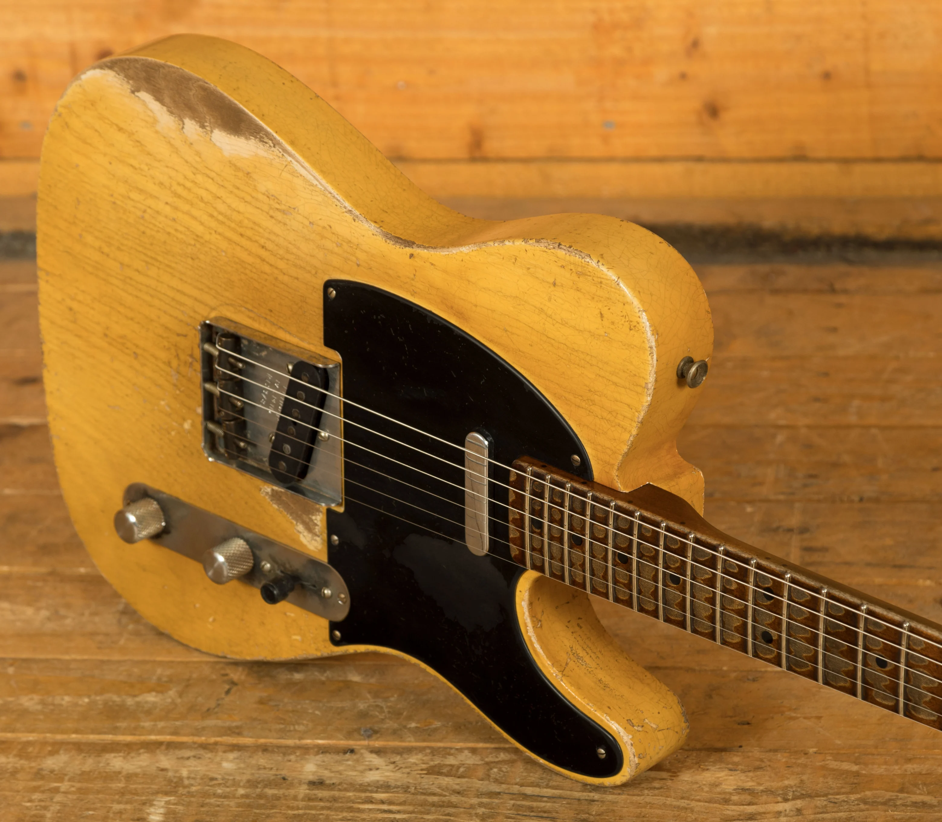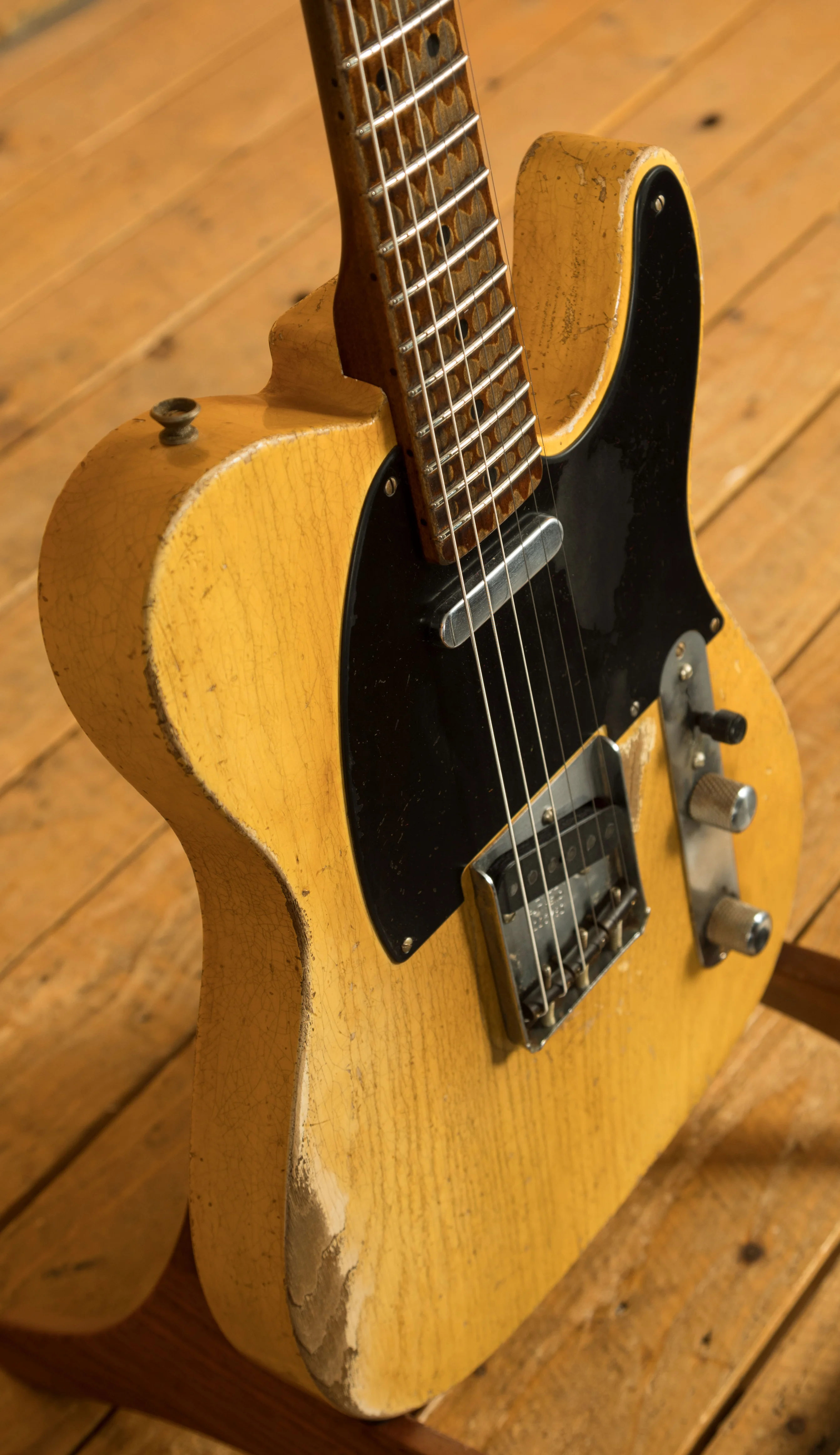 The Ash body is finished in a really authentically aged Nocaster Blonde Heavy Relic. This finish will wear beautifully with time and develop its own character even further, it also allows the natural resonance of the body to sing and sustain much more effectively.