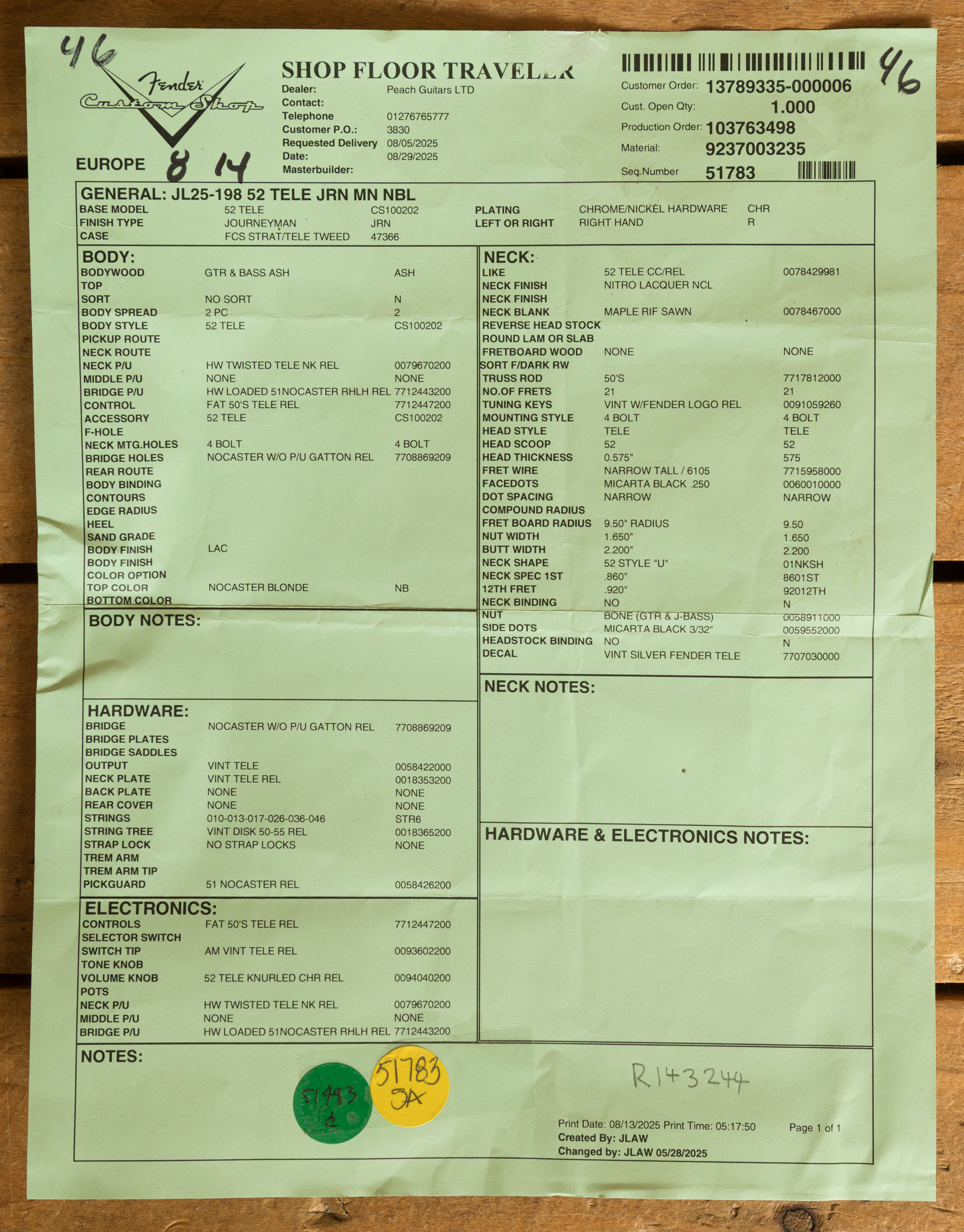 Equipped with a hand-wound Loaded '51 Nocaster bridge pickup and a hand-wound Twisted Tele neck pickup, the '52 Telecaster delivers exceptional tonal range and versatility. The bridge pickup offers the iconic Tele twang with added output and dynamic response, maintaining clarity even at higher gain settings. The neck pickup is a hand-wound Twisted Tele, a design that delivers a higher output than traditional Telecaster pickups, with a hint of the sparkle and clarity associated with Stratocaster pickups. Together, they make this Custom Shop Telecaster an ideal choice for players seeking a professional-grade instrument that combines Fender's timeless tone with outstanding versatility and build quality.