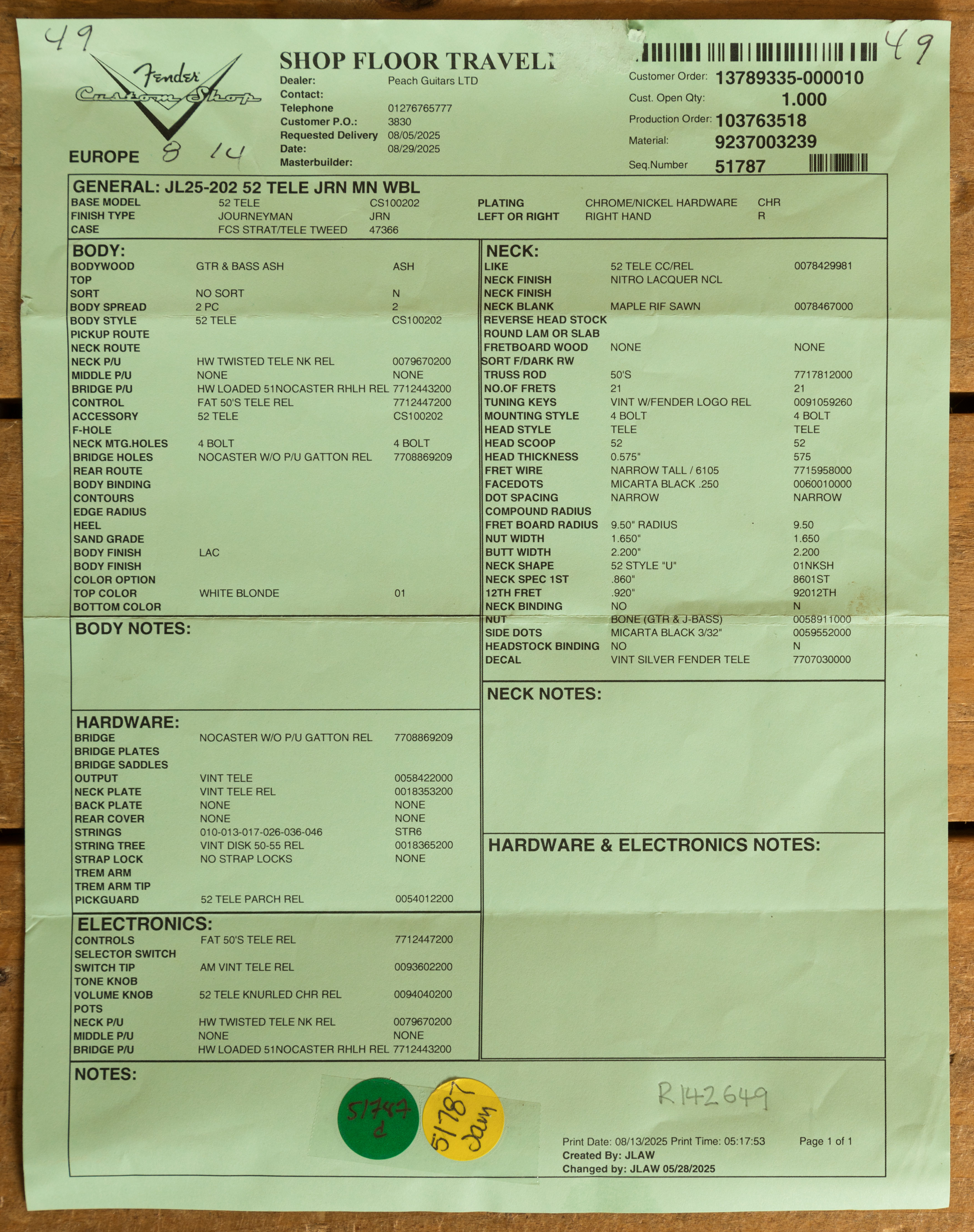 Equipped with a hand-wound Loaded '51 Nocaster bridge pickup and a hand-wound Twisted Tele neck pickup, the '52 Telecaster delivers exceptional tonal range and versatility. The bridge pickup offers the iconic Tele twang with added output and dynamic response, maintaining clarity even at higher gain settings. The neck pickup is a hand-wound Twisted Tele, a design that delivers a higher output than traditional Telecaster pickups, with a hint of the sparkle and clarity associated with Stratocaster pickups. Together, they make this Custom Shop Telecaster an ideal choice for players seeking a professional-grade instrument that combines Fender's timeless tone with outstanding versatility and build quality.