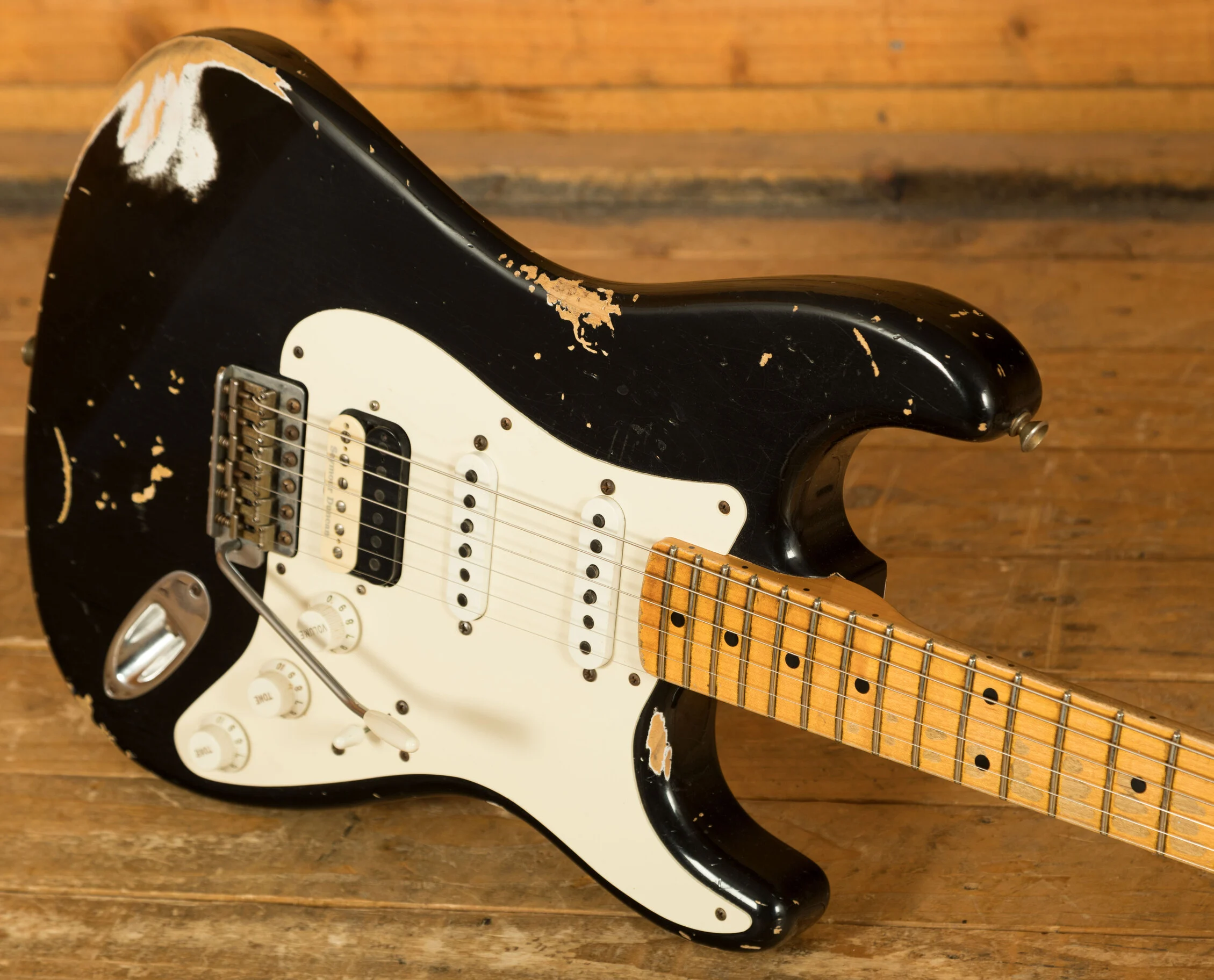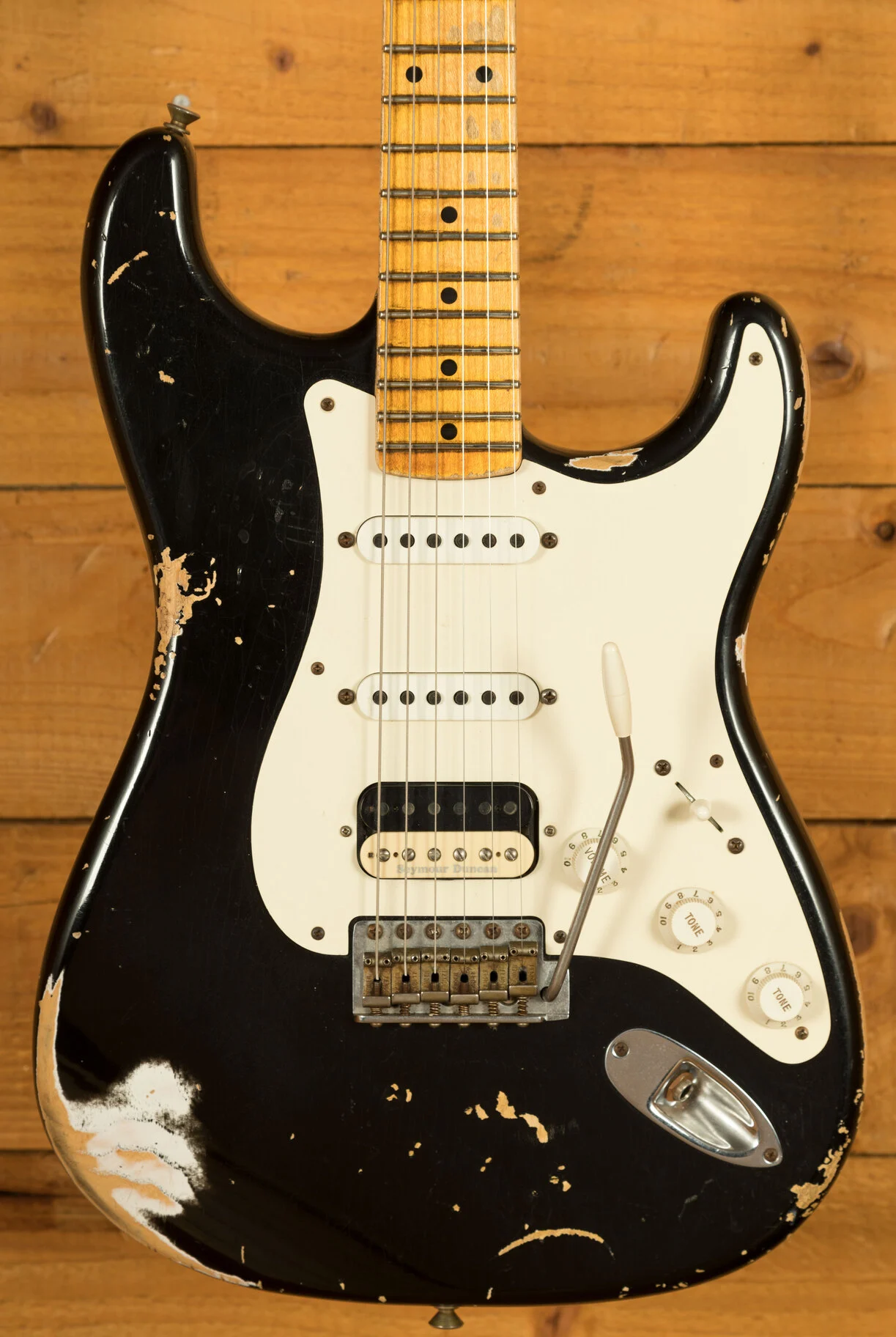 Pickups & Hardware: Zebra Bobbin Seymour Duncan Pearly Gates humbucker at the bridge with Fat 50's single-coils in HSS configuration, 5-way switch, master volume, and two tone controls, complemented by a vintage-style synchronized tremolo with steel saddles and chrome/nickel hardware.