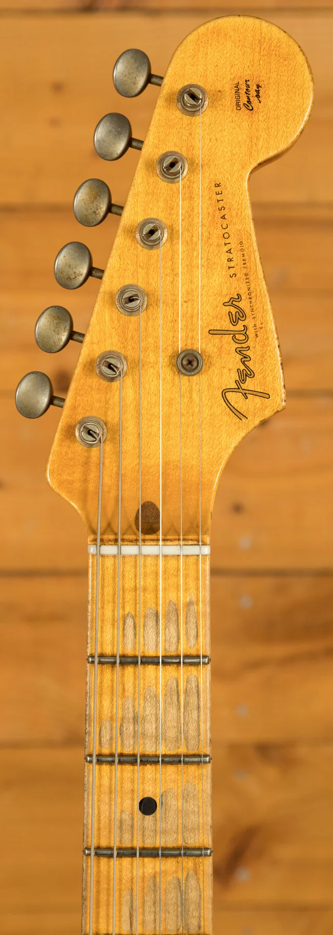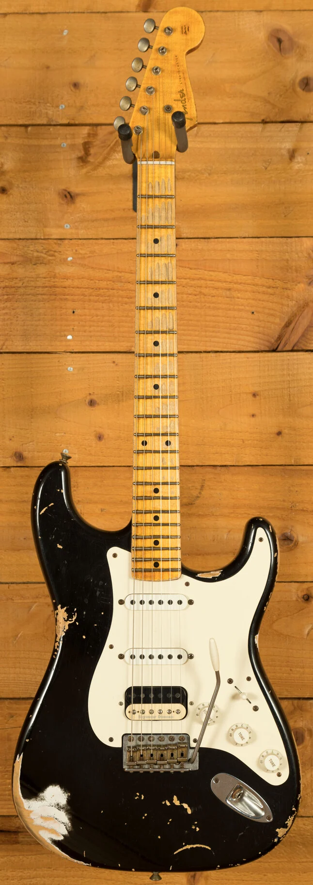 This '55 Strat features an HSS configuration, with a Zebra Bobbin Seymour Duncan Pearly Gates pickup at the bridge, paired with Fat 50's single-coils at the middle and neck, offering versatility from Stevie Ray Vaughan-style tones to chunky humbucker sounds with the flick of a switch. Wired with a 5-way switch, master volume, and two tone controls using CTS 250K 10% taper pots and paper-in-oil capacitors, it provides a wide range of tonal options. The vintage-style synchronized tremolo with steel saddles and chrome/nickel hardware ensures stable vibrato action, complemented by a 1-ply pickguard. Professionally set up by our expert luthiers at Peach Guitars, it’s ready to play straight out of its hardshell case.