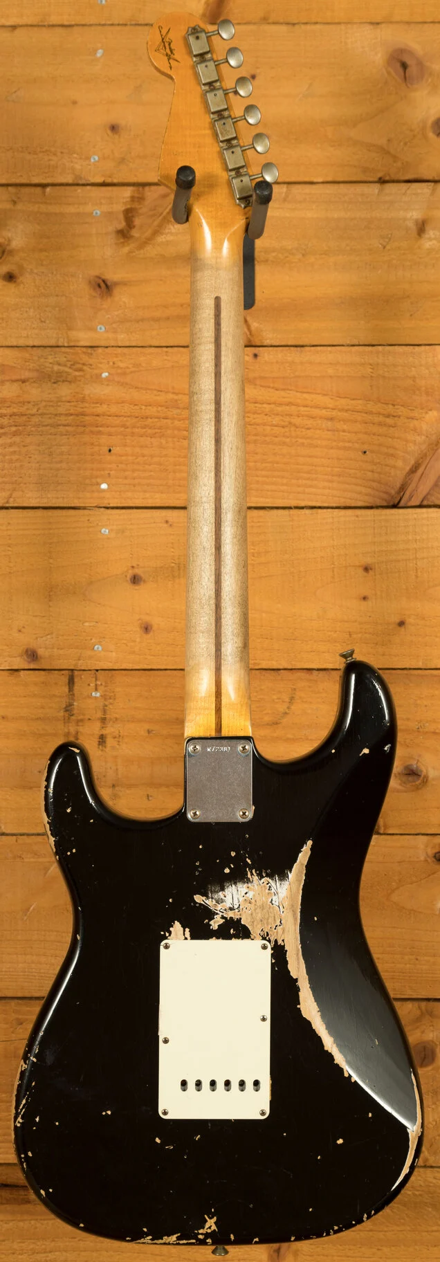 This Fender Custom Shop '55 Strat Heavy Relic in Super Faded Aged Black, built in 2014, features a 2-piece ash body, a quartersawn maple neck with a Large C profile (.875" at 1st fret, .950" at 12th) with black dot inlays. The nitro lacquer finish replicates the aged look of a 1955 Strat, complete with a 7.25" radius and 21 x 6150 frets for a vintage feel with modern playability. In "as-new"condition, with only factory wear present