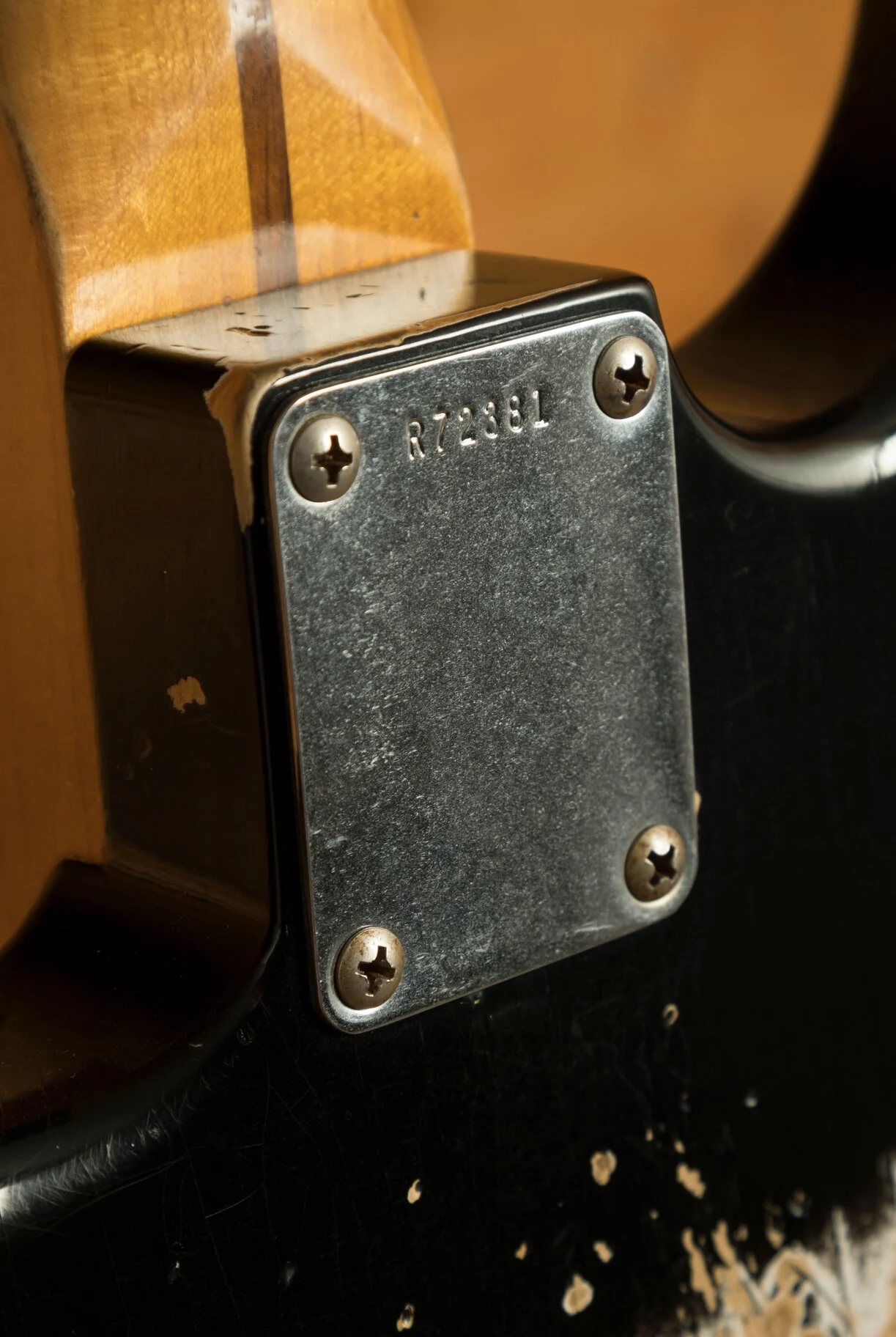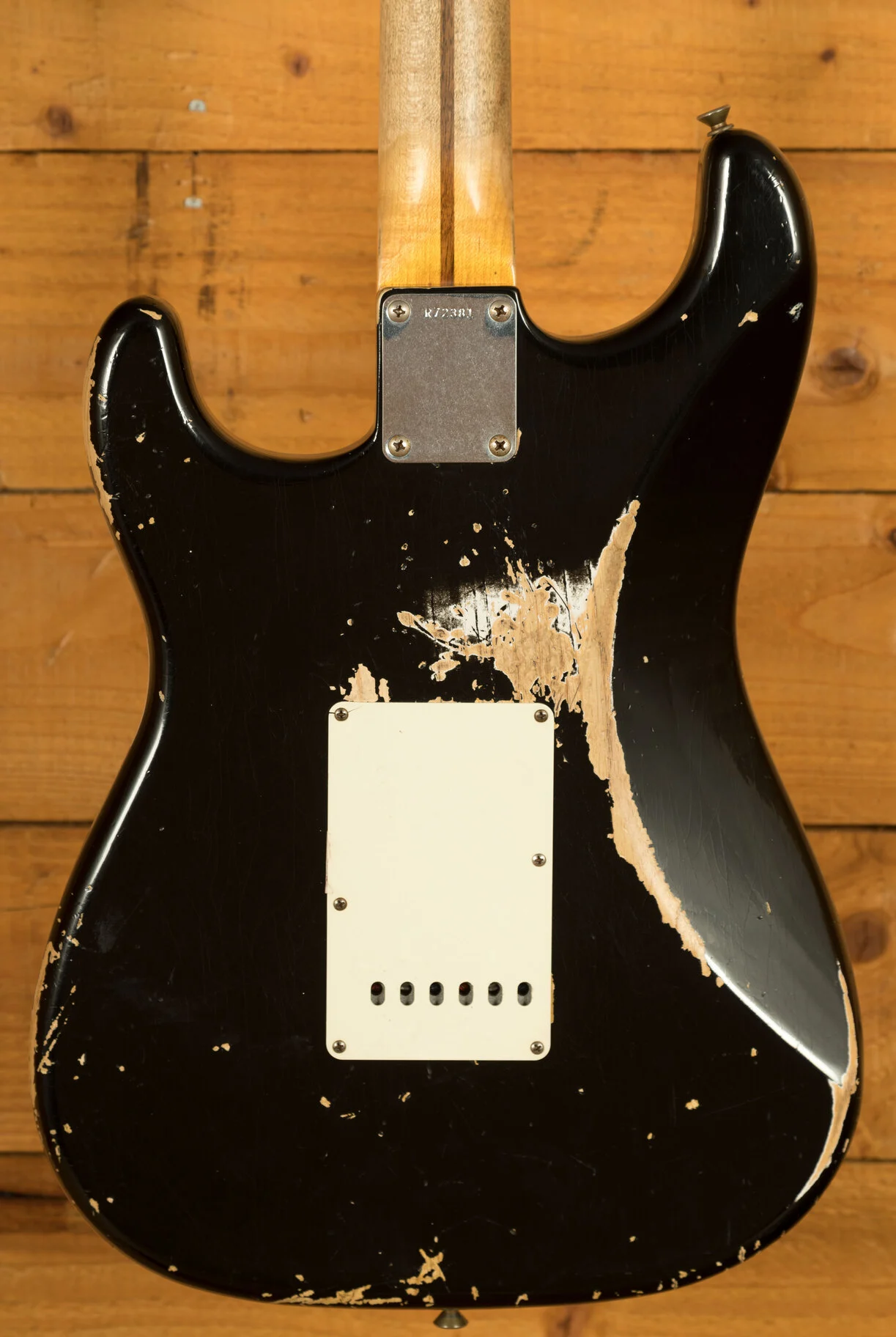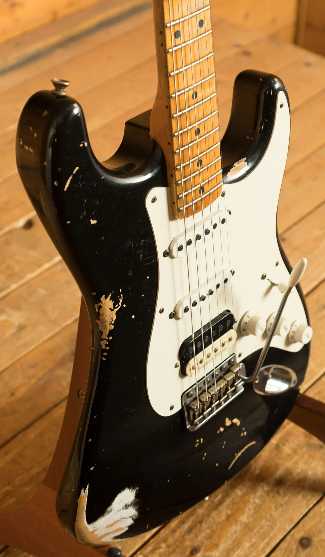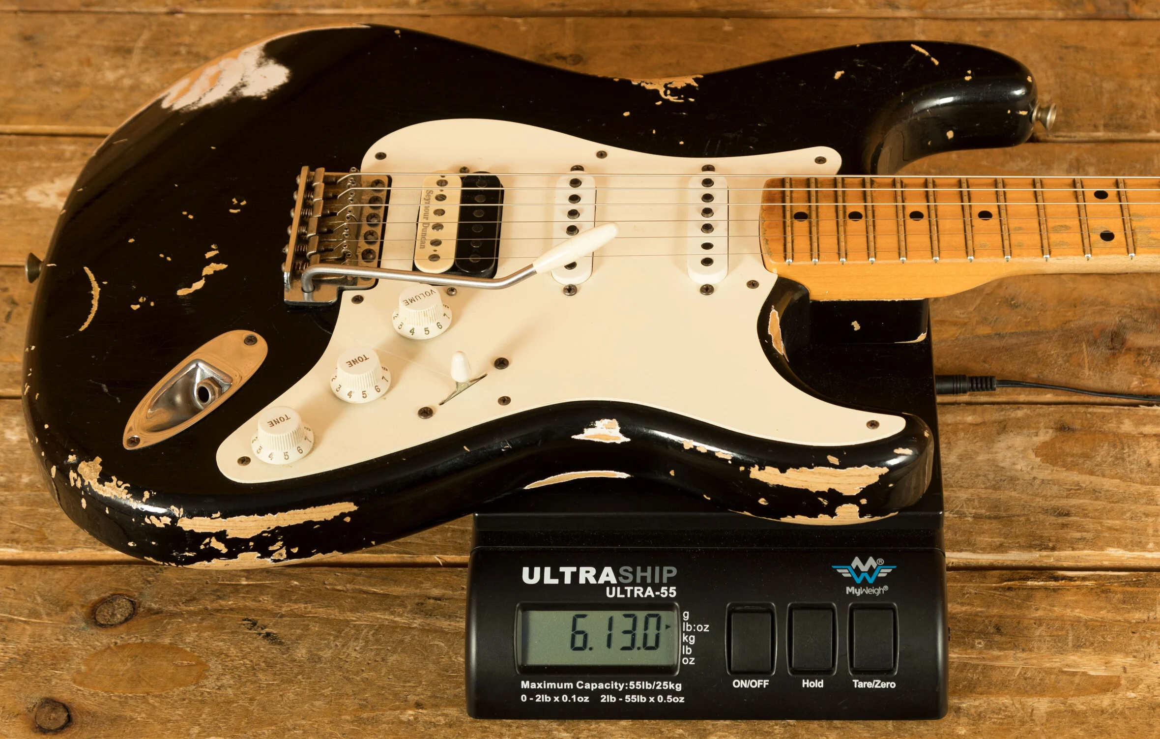 Body & Neck: 2-piece ash body in Super Faded Aged Black nitro lacquer finish with heavy checking, paired with a quartersawn maple neck with Micarta black dot inlays, offering a 7.25" radius and 21 6150 frets.