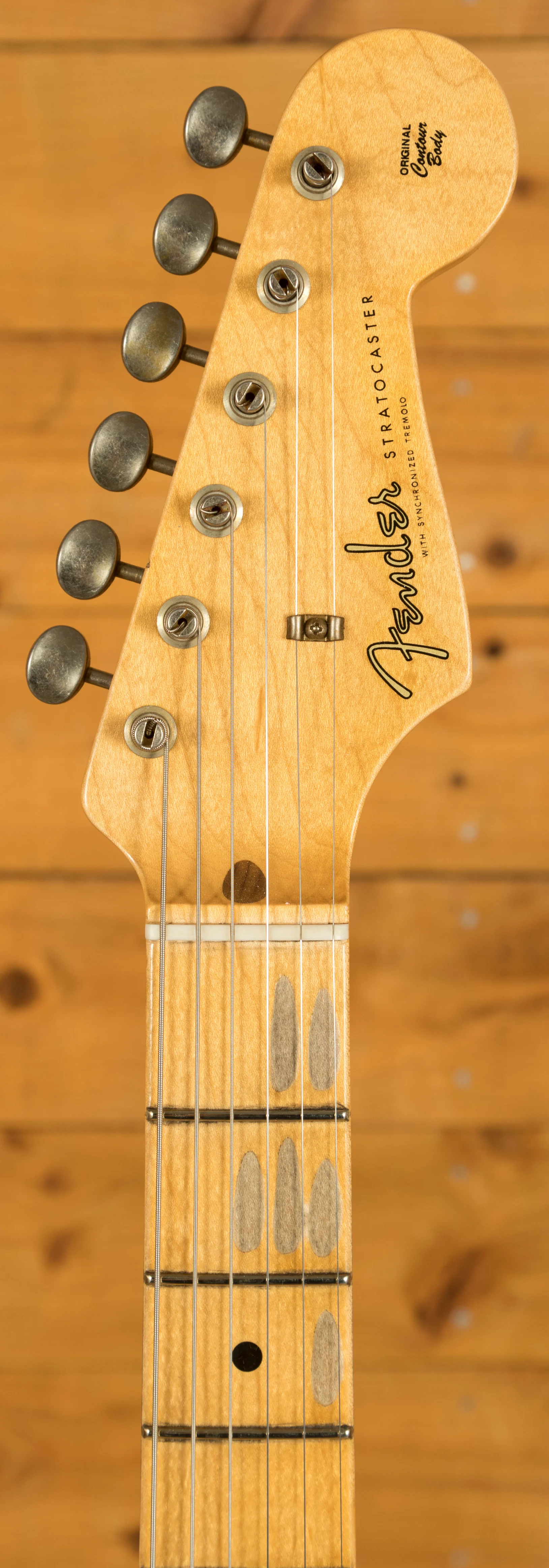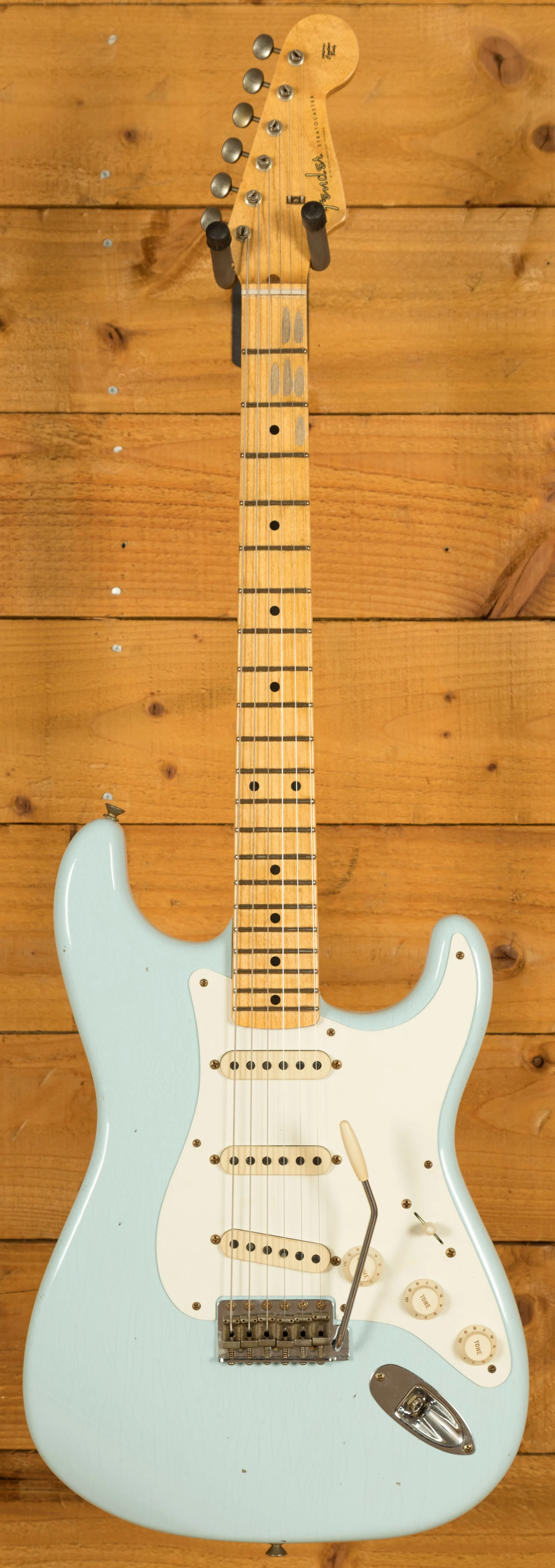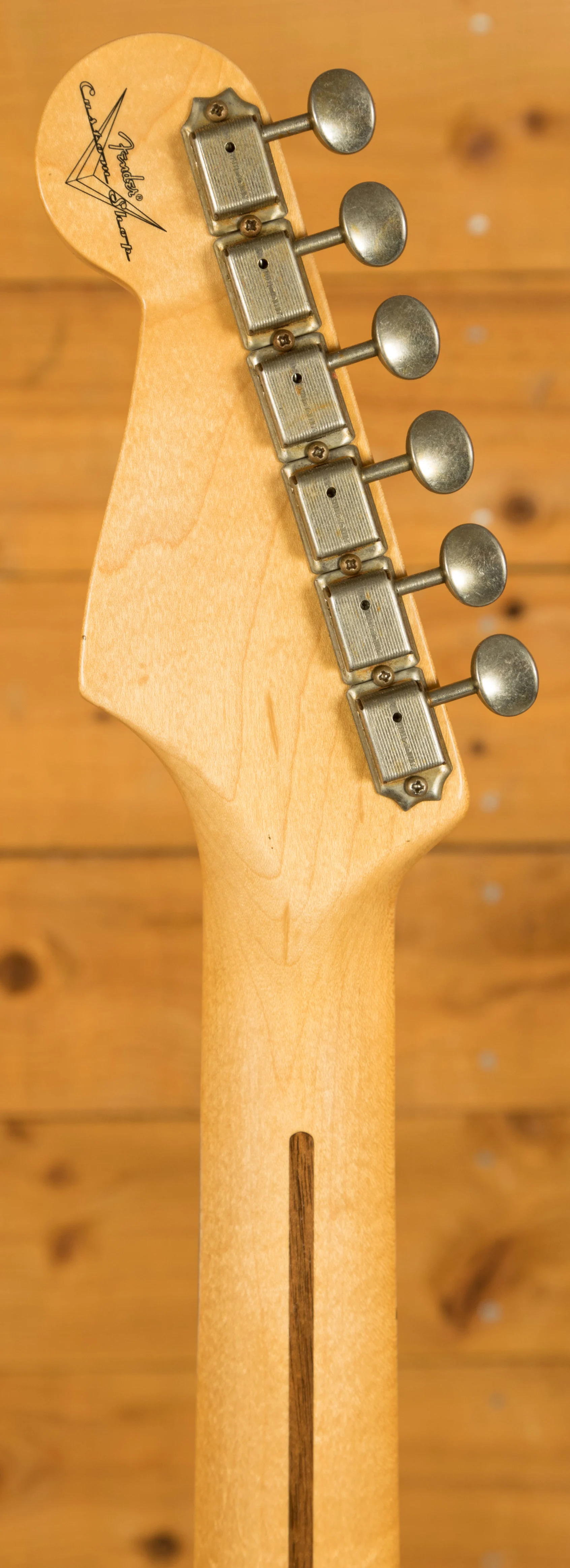 The Plain Grain Maple neck has a smooth finish. With a 9.5" radius and 21 6105 frets, the '57 Custom Shop Stratocaster also features a '57 Style Soft "V" neck shape and a 1.650" Nut Width. It's supremely comfortable and well balanced.