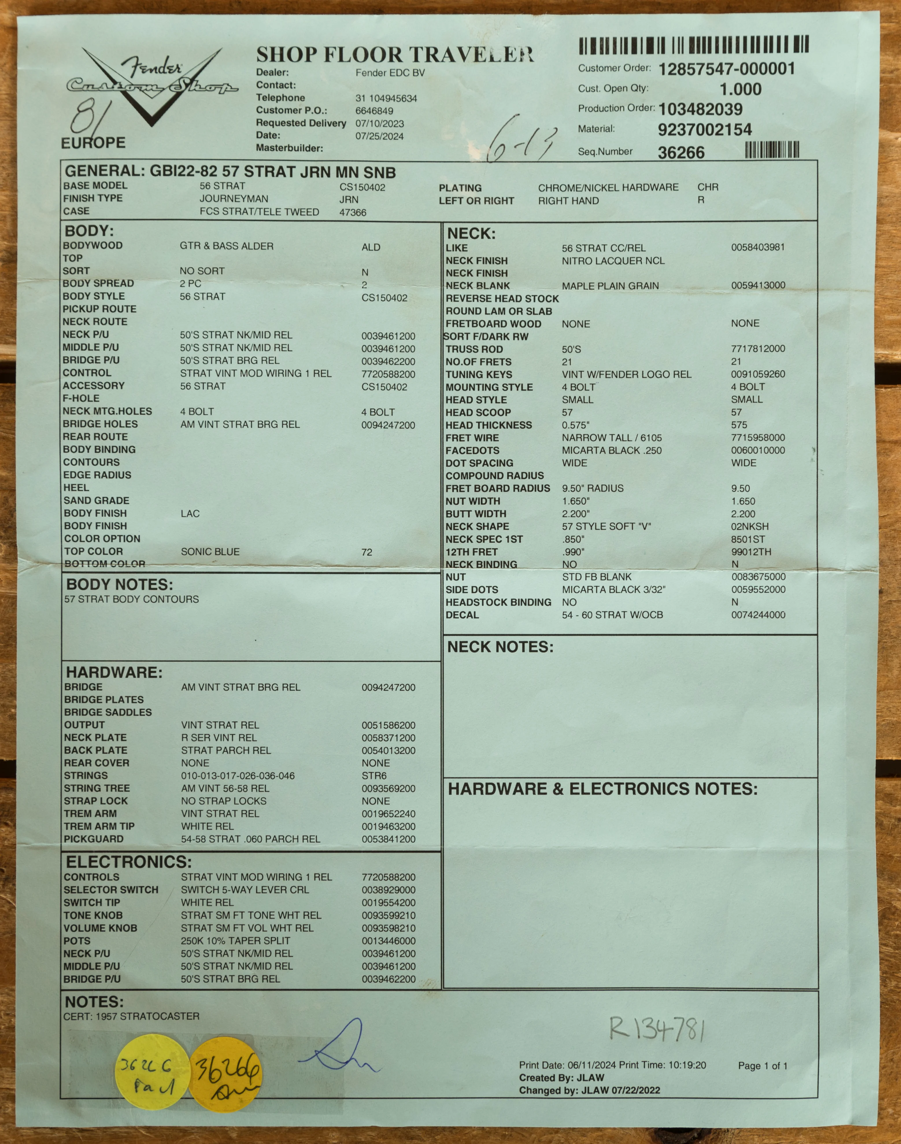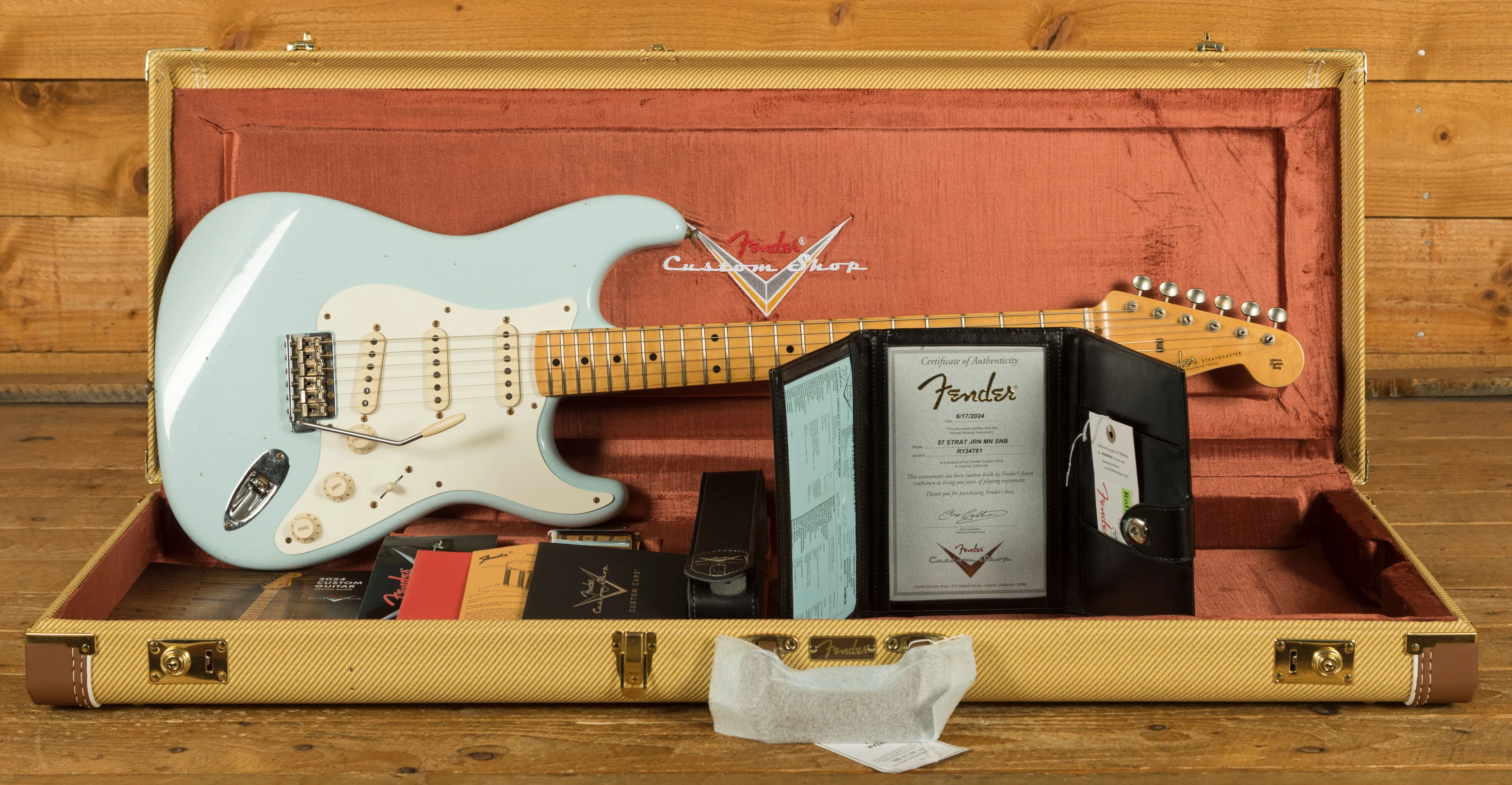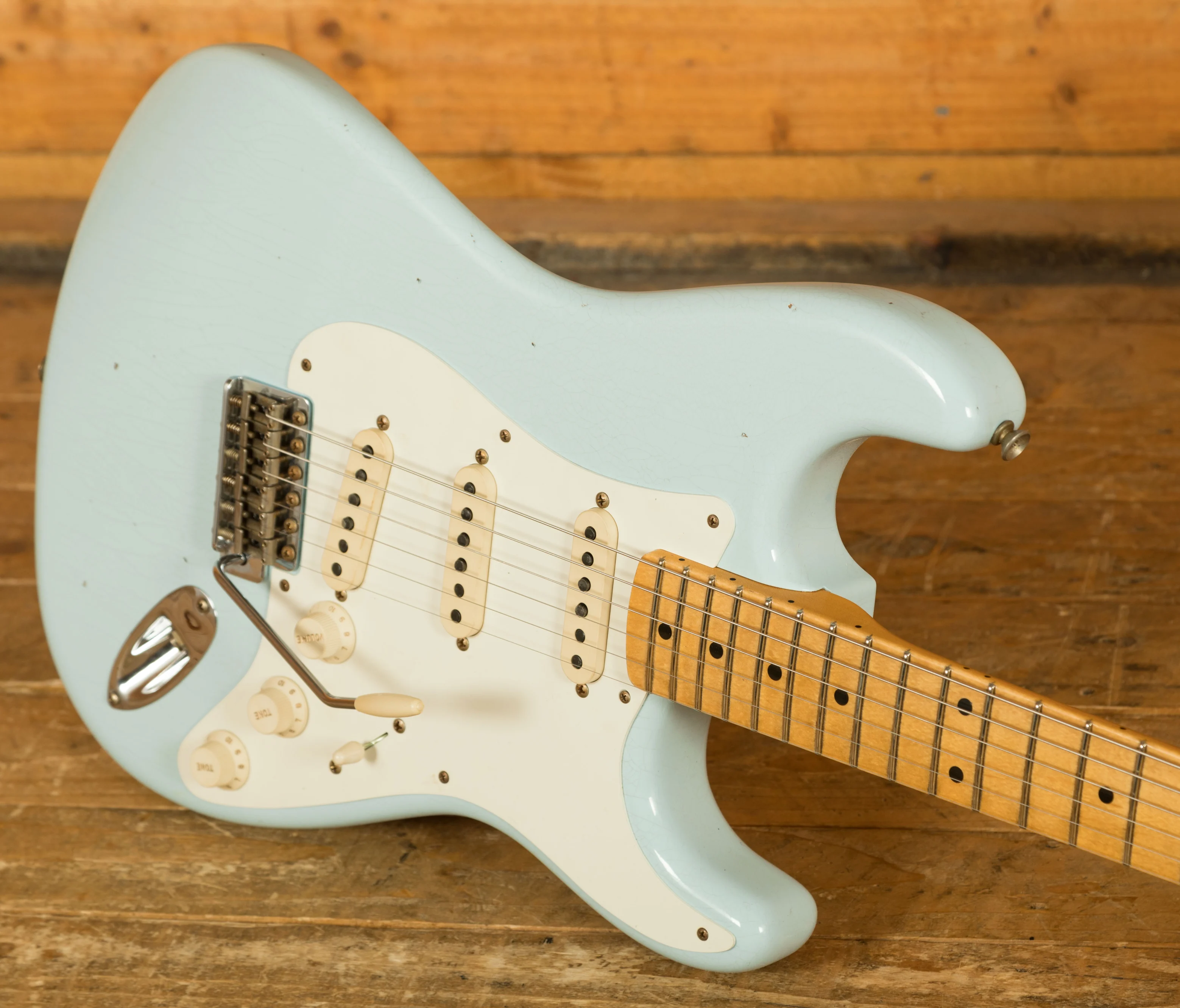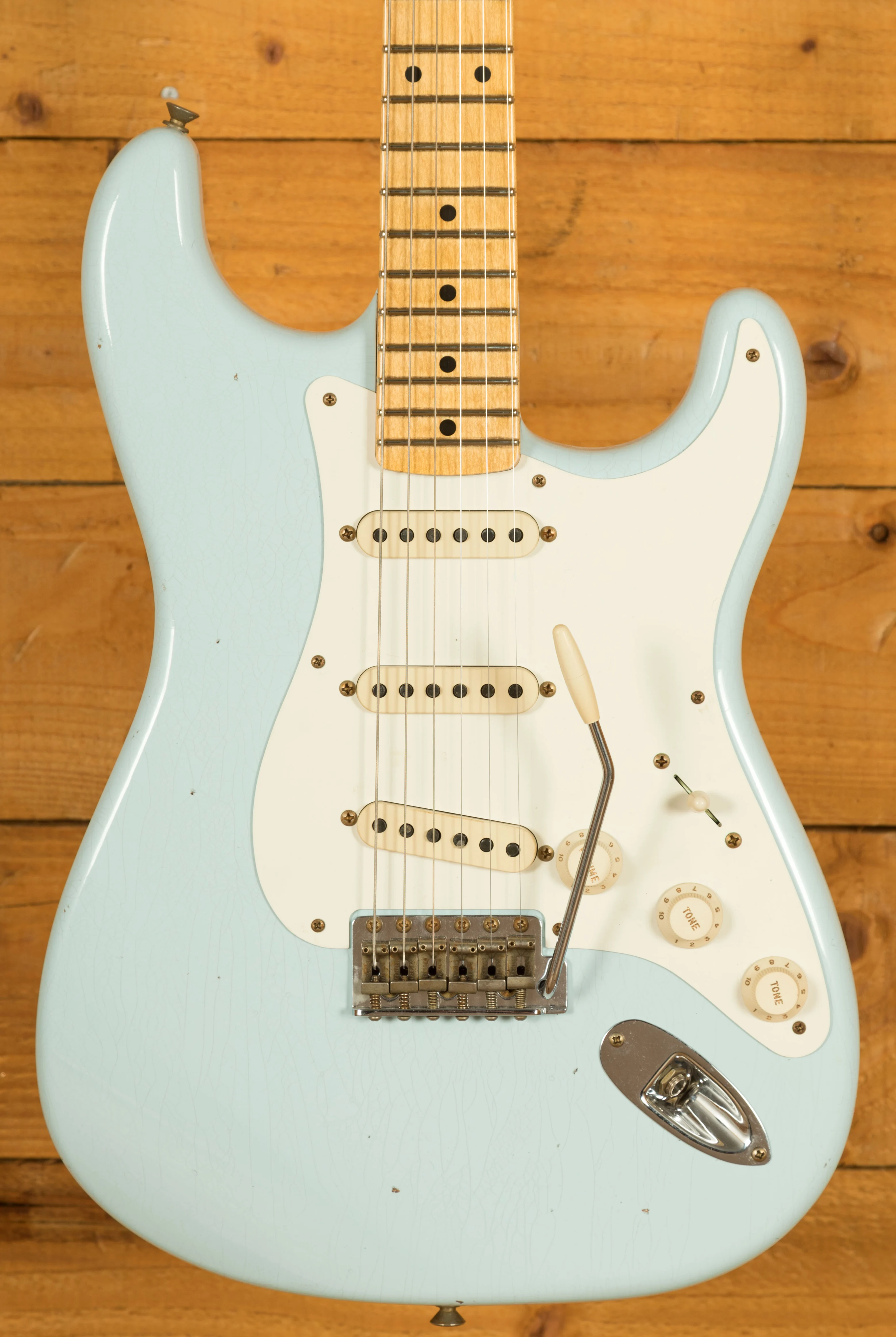 The Plain Grain Maple neck has a smooth finish. With a 9.5" radius and 21 6105 frets, the '57 Custom Shop Stratocaster also features a '57 Style Soft "V" neck shape and a 1.650" Nut Width. It's supremely comfortable and well balanced.