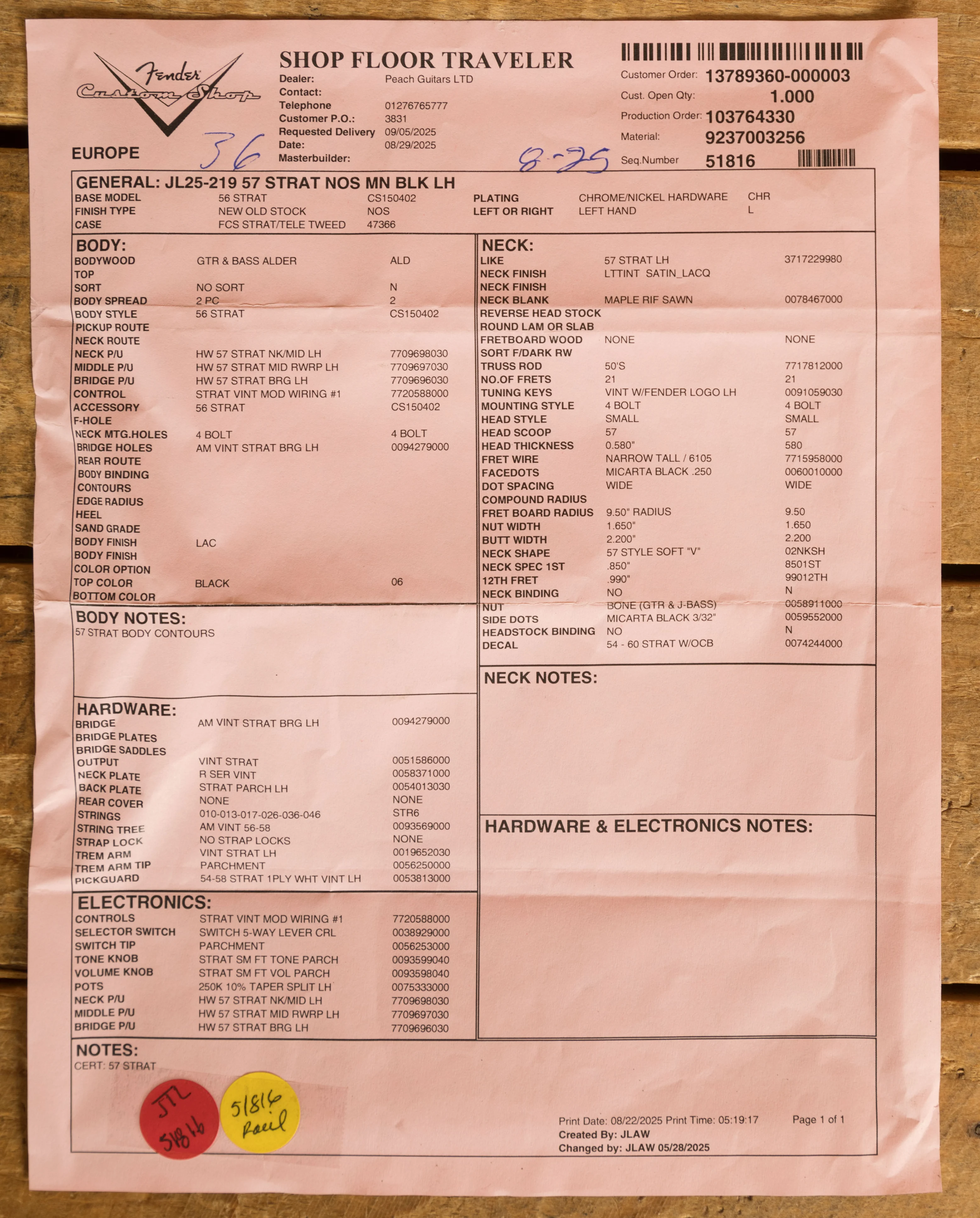 The Alder body is finished in a classic Black nitro lacquer, period correct, this finish will wear beautifully with time and develop its own character even further. It also allows the natural resonance of the body to sing and sustain much more effectively compared with other finishes. The NOS finish gives the appearance of a New Old Stock guitar, one that has been perfectly preserved since 1957 and doesn't feature any kind of ageing or relic work.